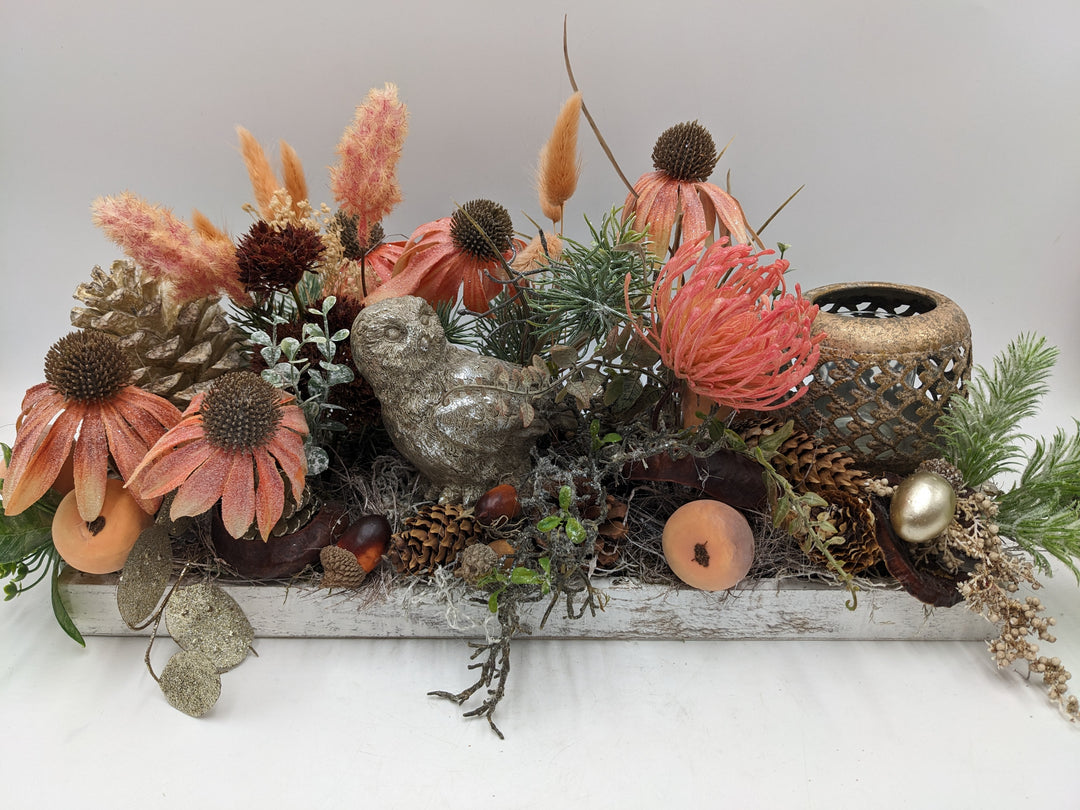 Sommergesteck Tischgesteck Sommerdekoration Seidenblumen Magnolien Efeu Gräser apricot