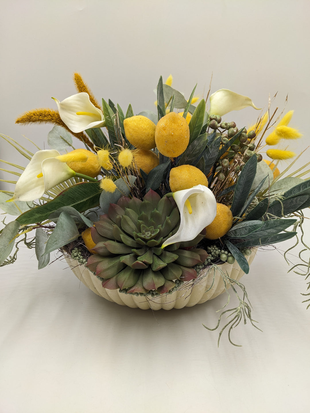 Sommergesteck Zitrone Calla gelb
