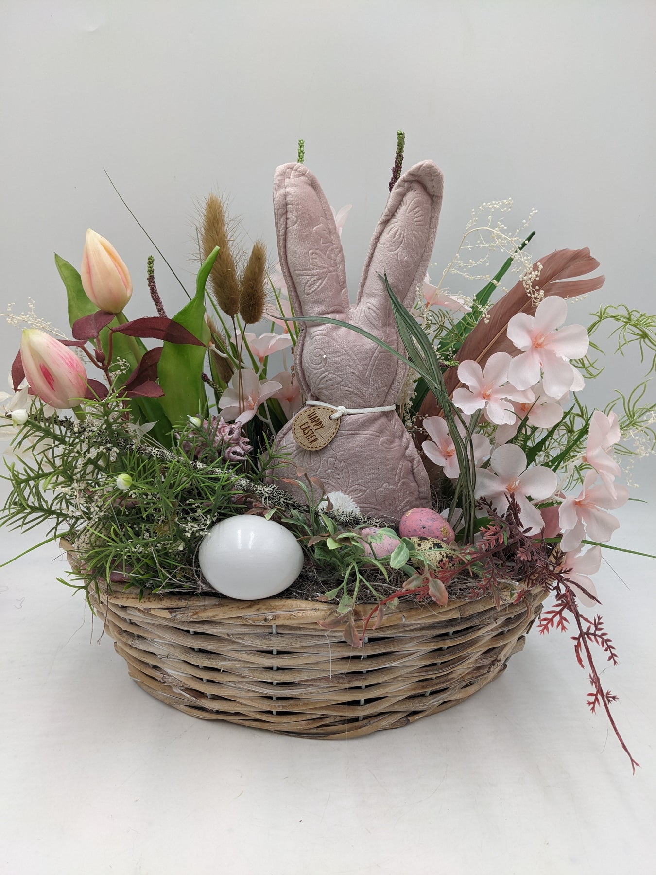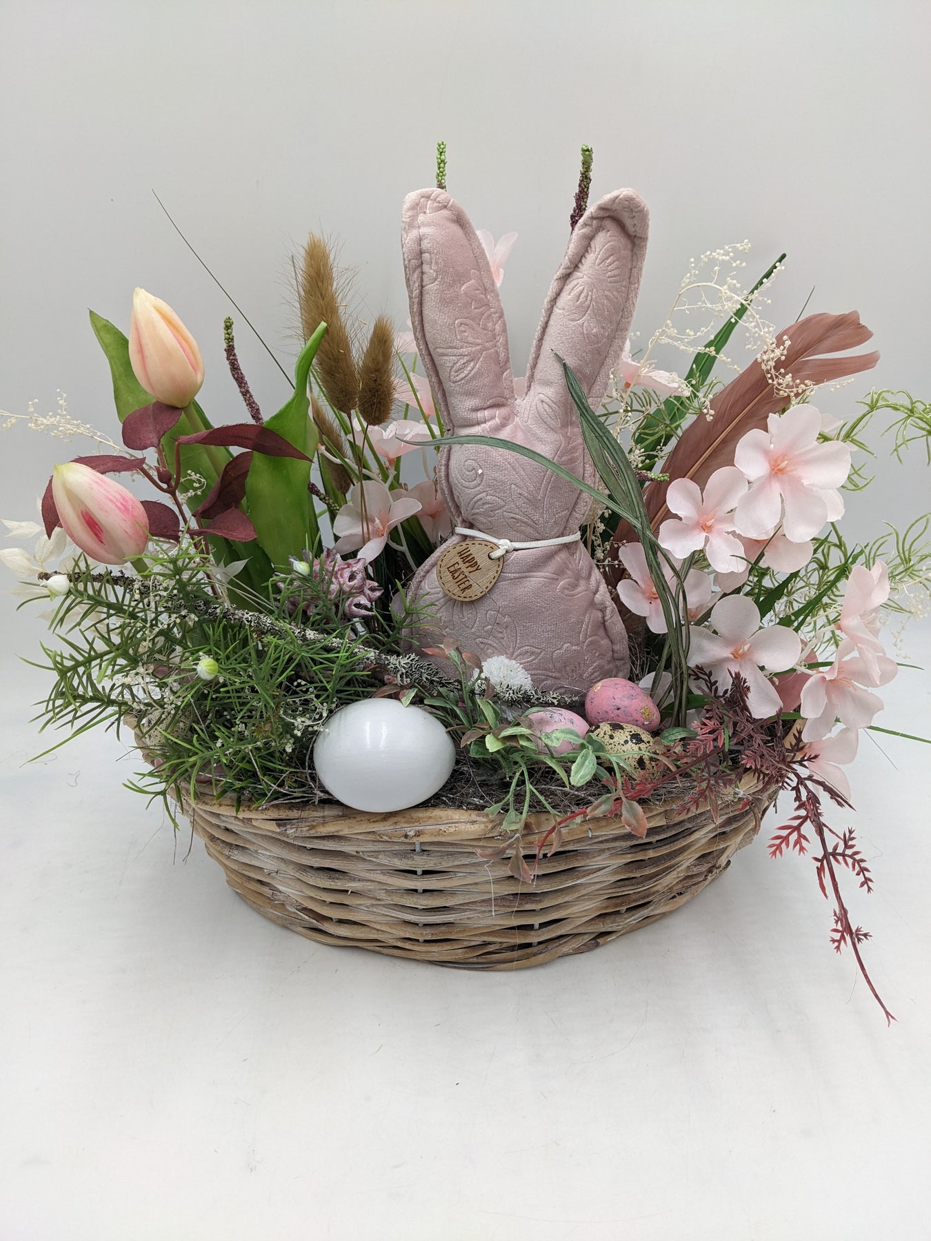 Ostergesteck Frühlingsgesteck Gräser Tulpen Hase rosa