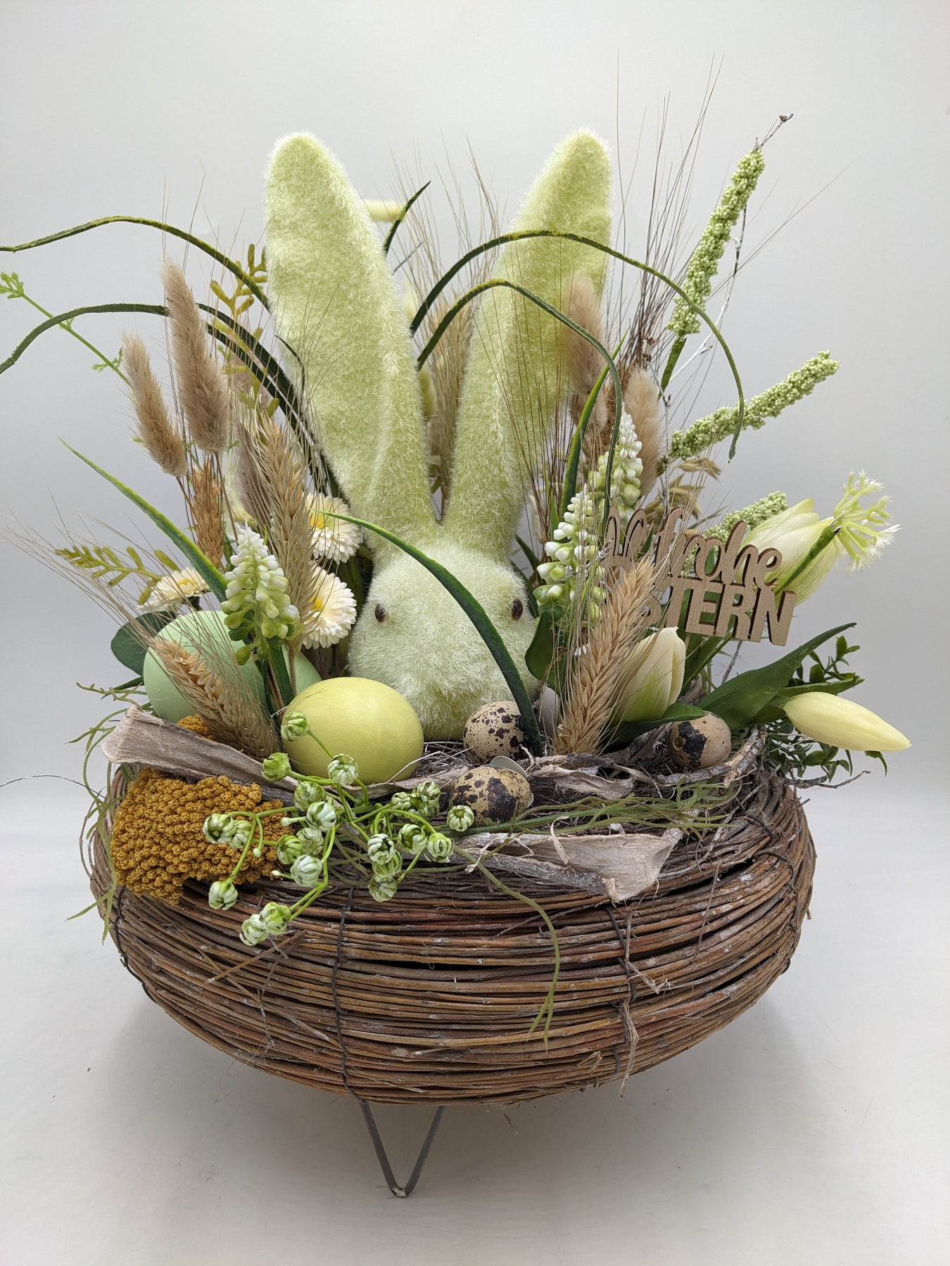 Frühlings-Ostergesteck mit flauschigem grünem Hasen und rustikalem Charme. Gestaltet mit Bellis, zarten Gräsern, Trockenblumen, Getreideähren, Wachteleiern und einem gelben Osterei, arrangiert in einer geflochtenen Schale mit Holzschriftzug „Frohe Ostern“ für eine warme, naturverbundene Osterstimmung, Farbe: grün gelb , Höhe: ca. 43 cm, Durchmesser: ca. 33 cm, 4058-2026