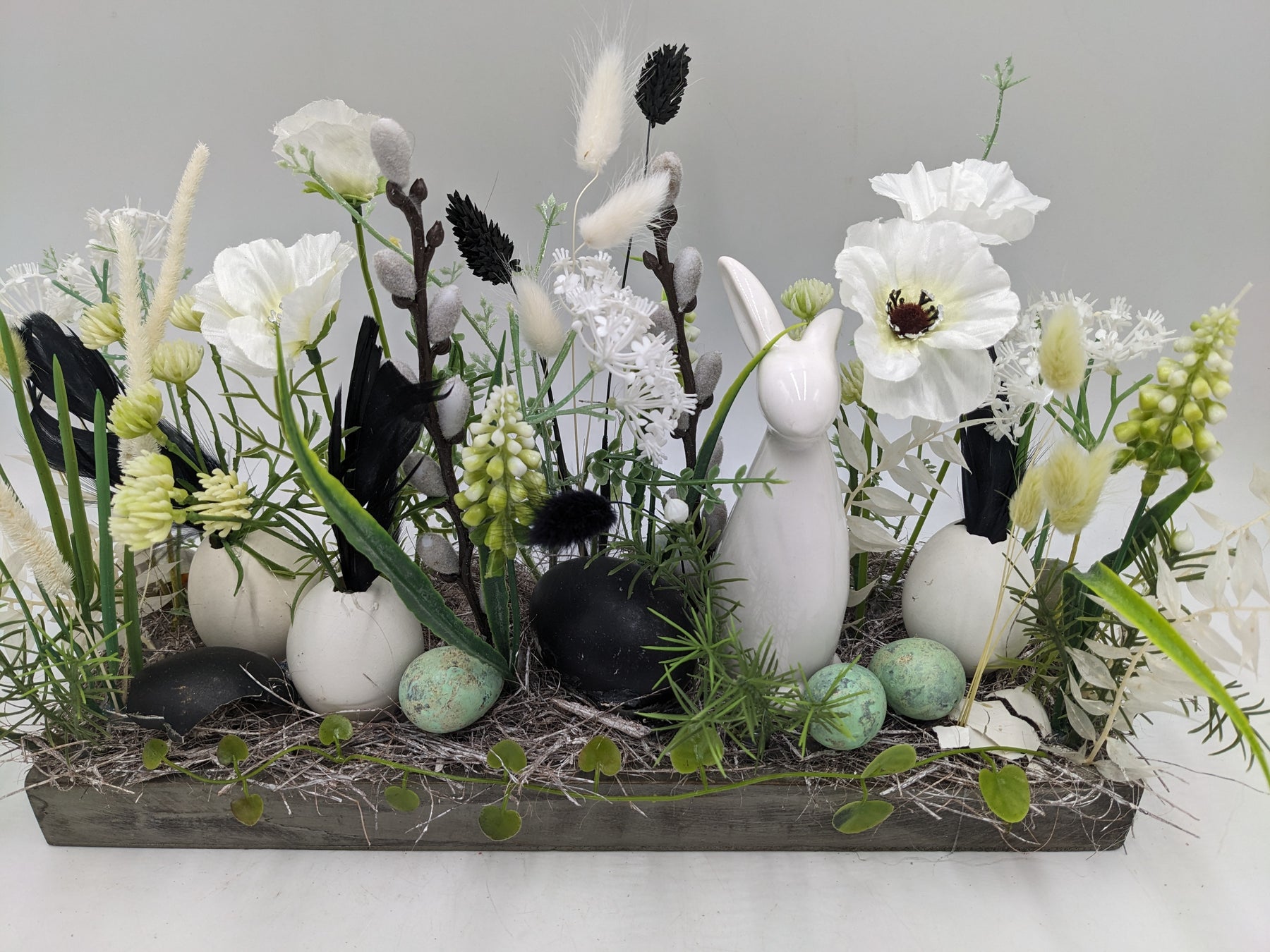 Oster-Naturgesteck in Schwarz-Weiß mit grafischer Eleganz. Gestaltet mit klaren Kontrasten aus weißen und schwarzen Dekoeiern, zarten weißen Blüten, Kätzchenzweigen, feinen Gräsern und frischem Grün. Eine schlichte, stilisierte Hasenfigur bildet den ruhigen Mittelpunkt. Arrangiert in einer länglichen Holzschale mit natürlichen Nestakzenten für eine zeitgemäße, elegante Osterdekoration mit minimalistischer Ausstrahlung, Farbe: schwarz, weiss, Höhe: ca. 23 cm, Breite: ca. 35 cm, Tiefe: ca. 10 cm, 4083-2026