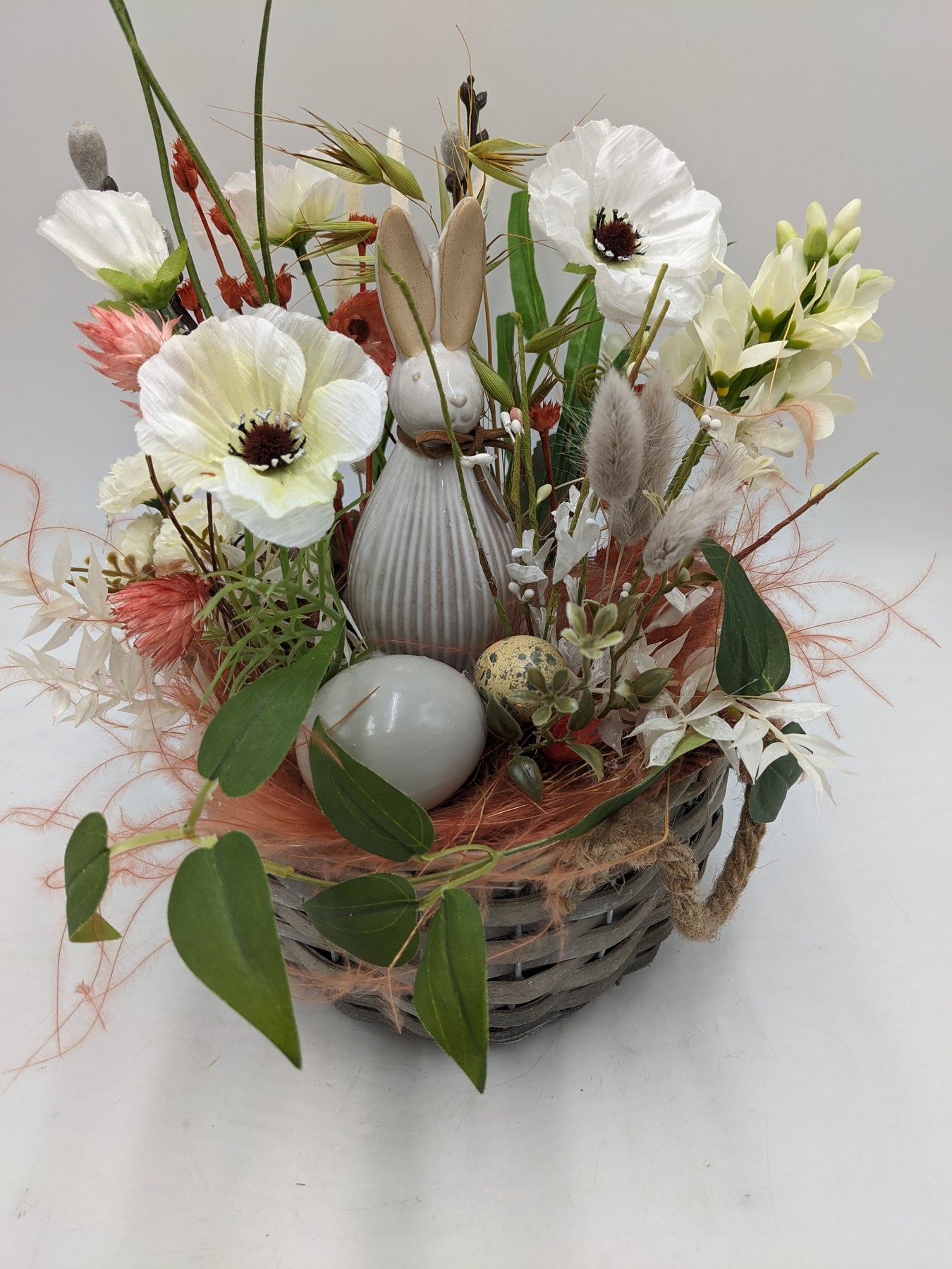 Ostergesteck Frühlingsgesteck Hase gräser weiss apricote