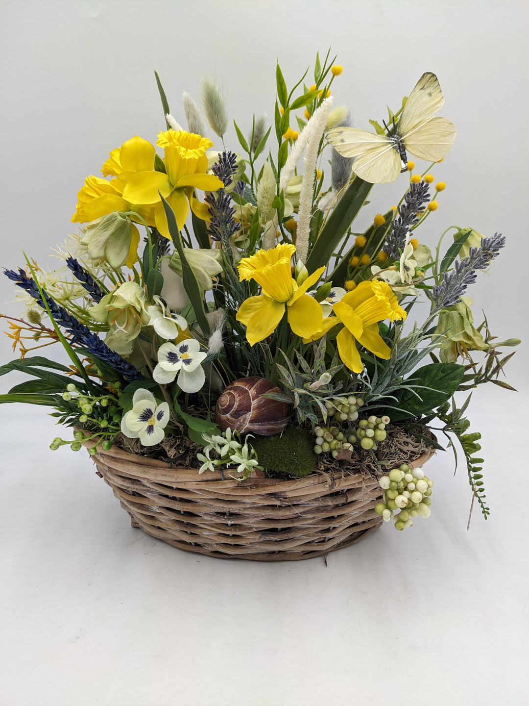 Frühlingsgesteck Narzissen Hornveilchen creme gelb