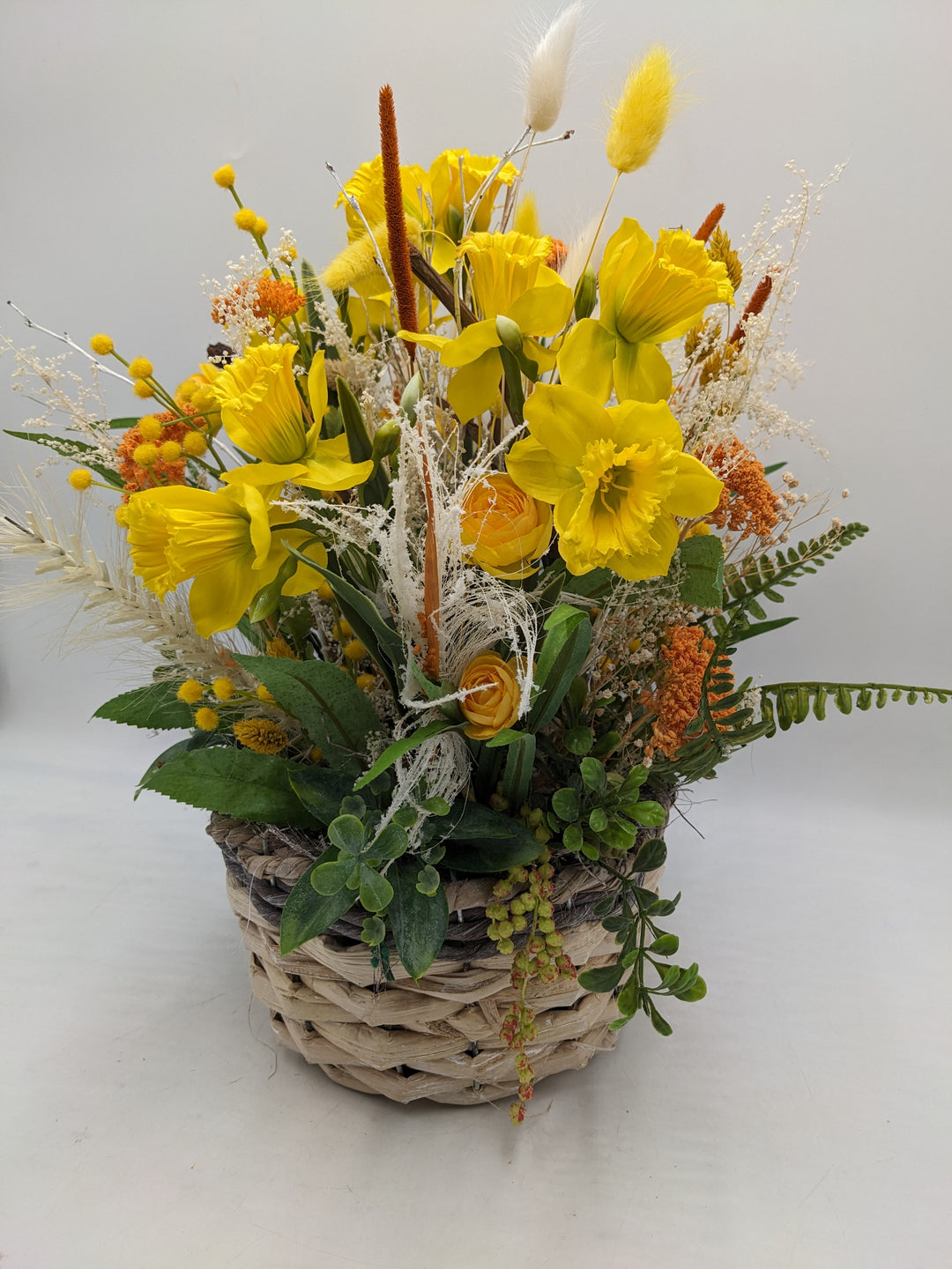 Ostergesteck Frühlingsgesteck Ranunkeln Tulpen gelb