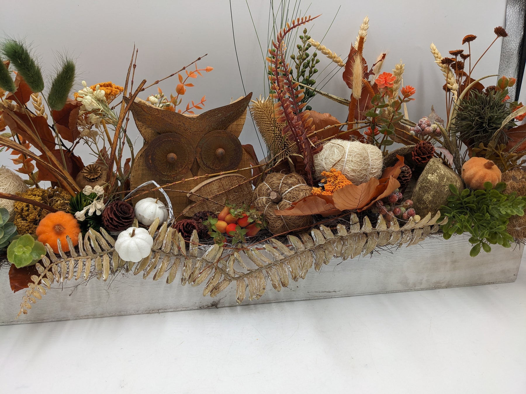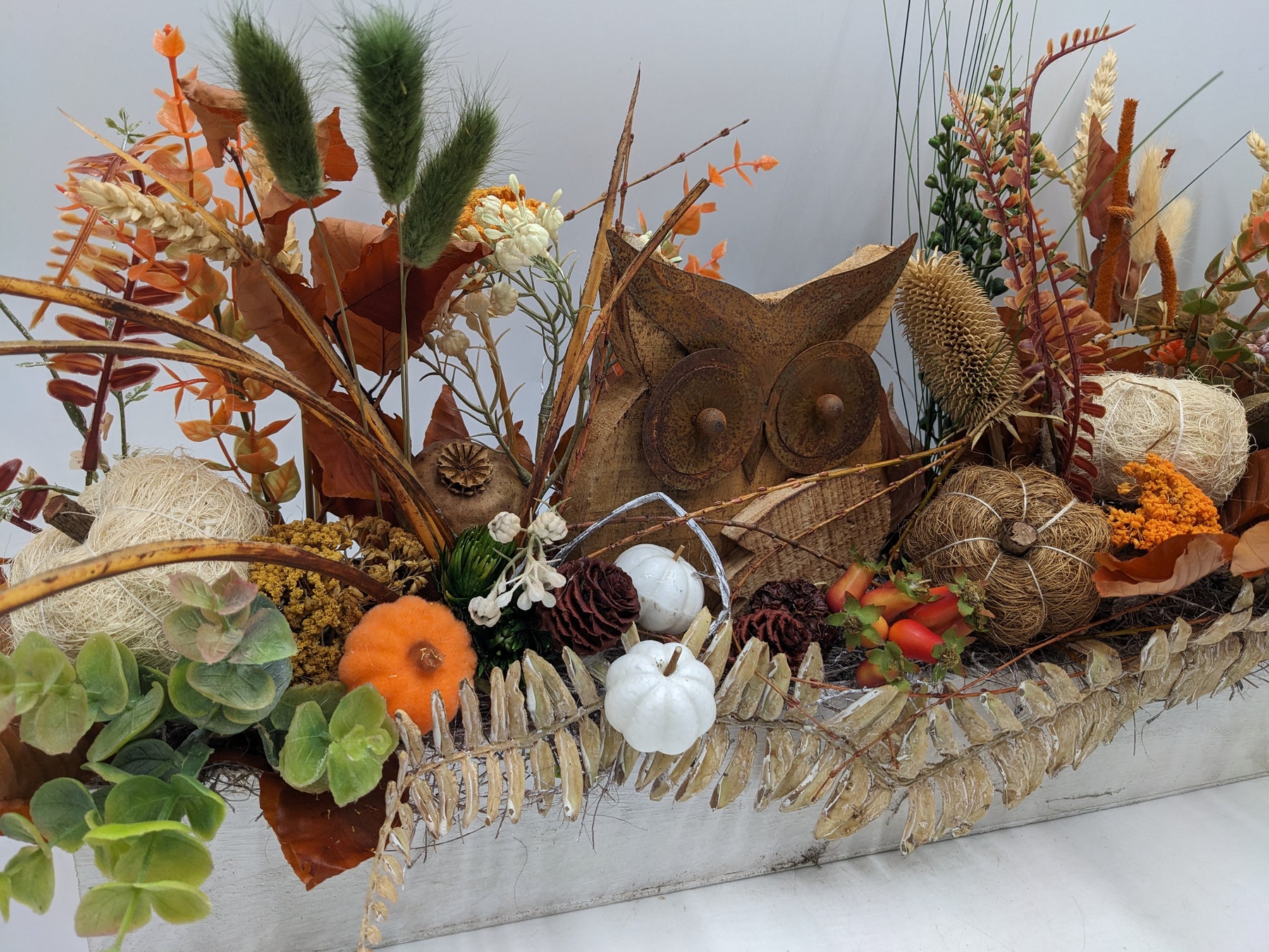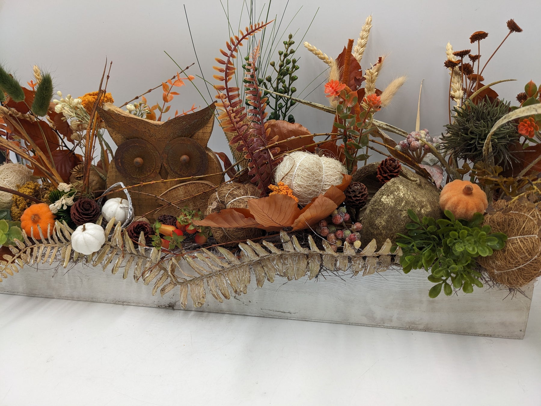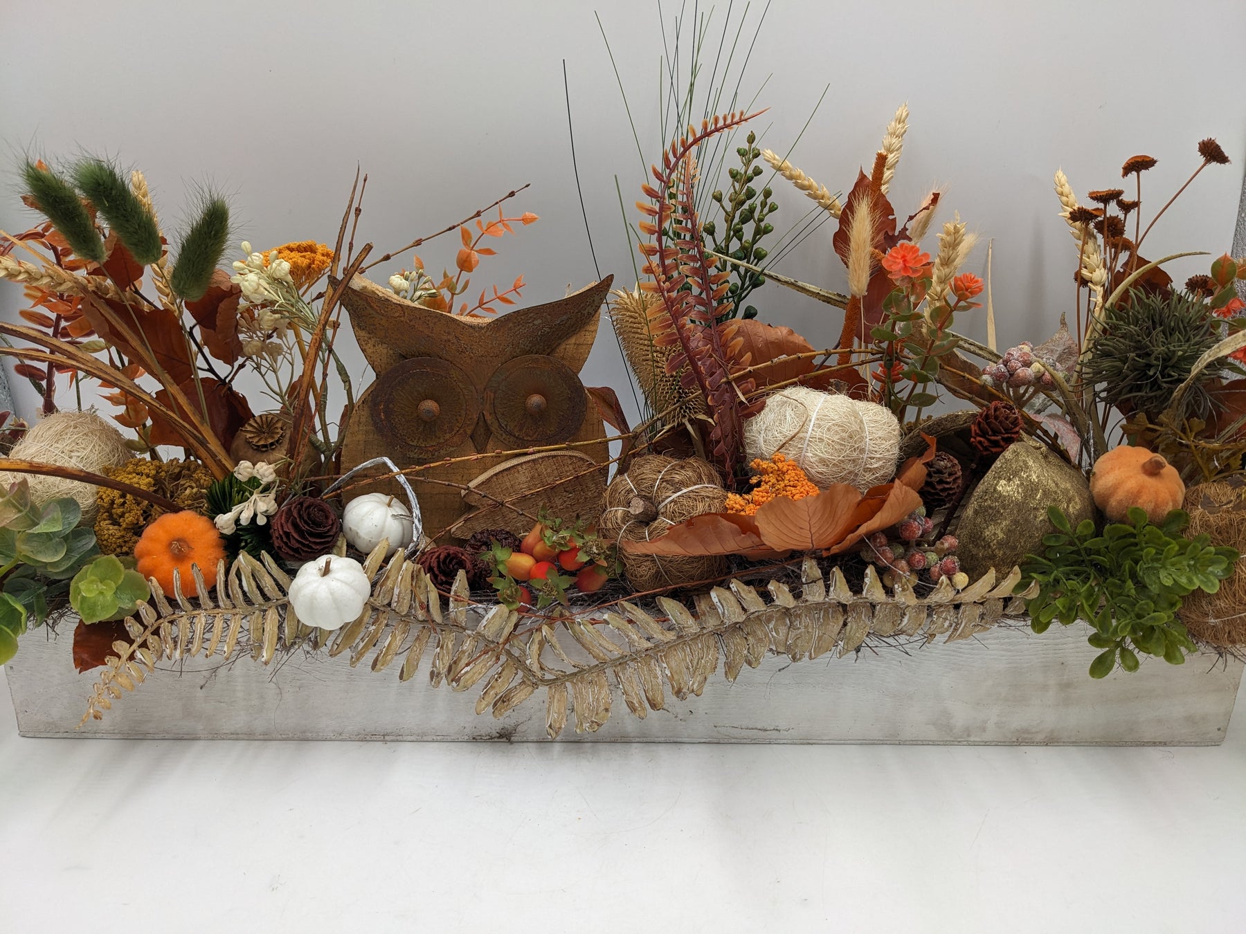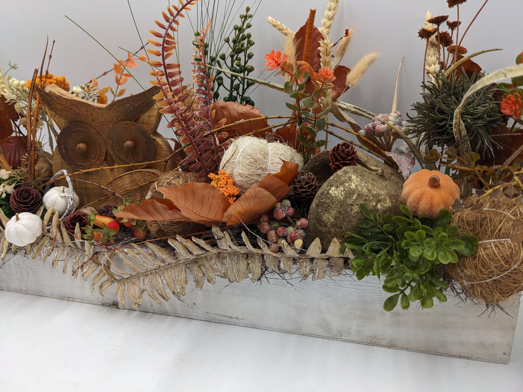 Herbstliches Dekogesteck in natürlicher Landhaus-Optik mit Eulenfigur. Arrangiert in einem länglichen, weiß gewischten Holzgefäß, gestaltet mit dekorativen Kürbissen in Weiß und Orange, herbstlichen Blättern, Zapfen, Beeren, Getreideähren, Gräsern und Trockenblumen in warmen Braun-, Rost- und Goldtönen. Im Mittelpunkt steht eine rustikale Eulenfigur aus Holz, ergänzt durch naturbelassene Kugeln, Moos und strukturreiche Zweige. Das harmonische Zusammenspiel aus natürlichen Materialien und warmen Herbstfarben verleiht dem Arrangement eine gemütliche, saisonale und stilvolle Ausstrahlung, Farbe: braun, Höhe: ca. 29 cm, Breite: ca. 59 cm, Tiefe: ca. 9 cm, 4100-2026