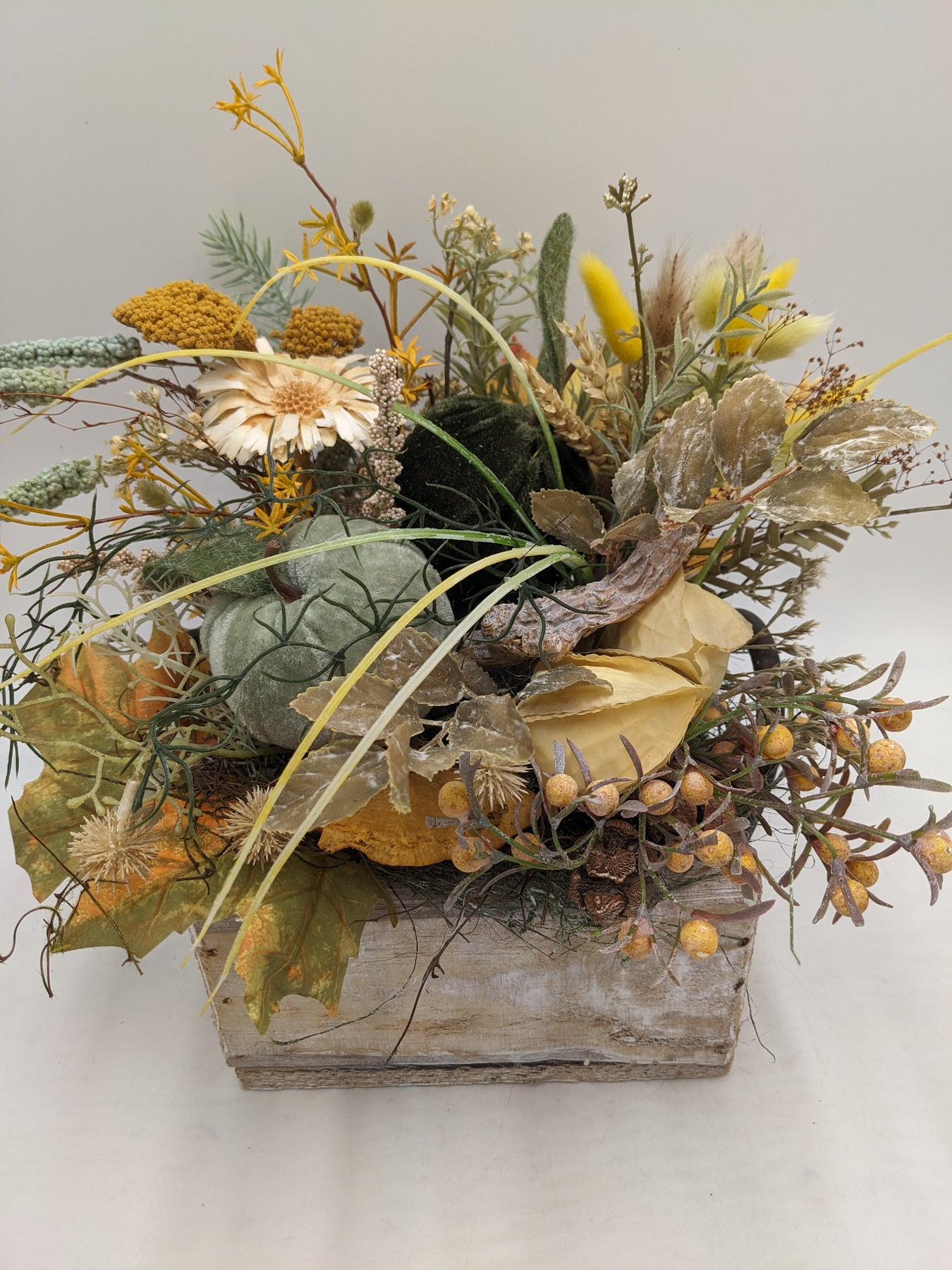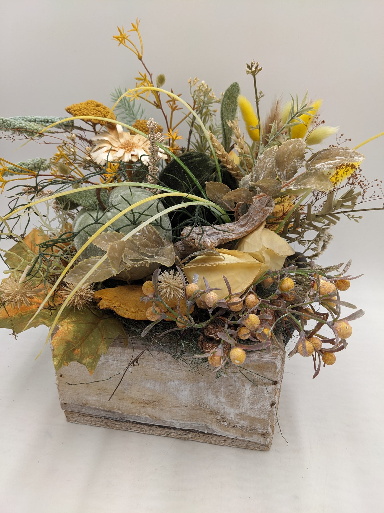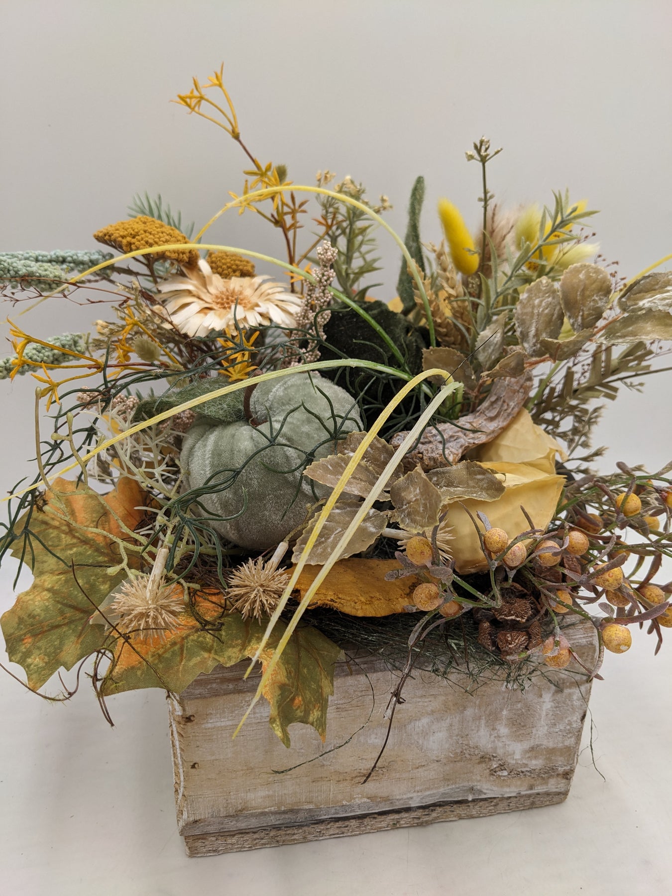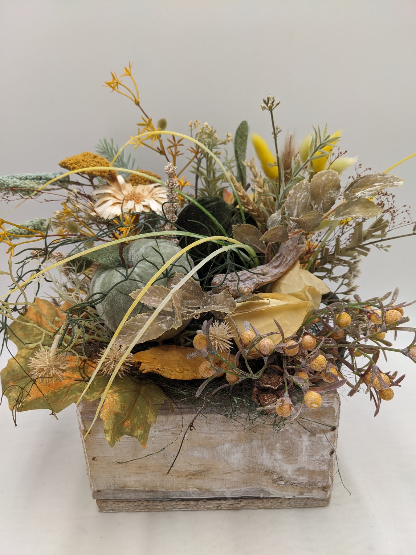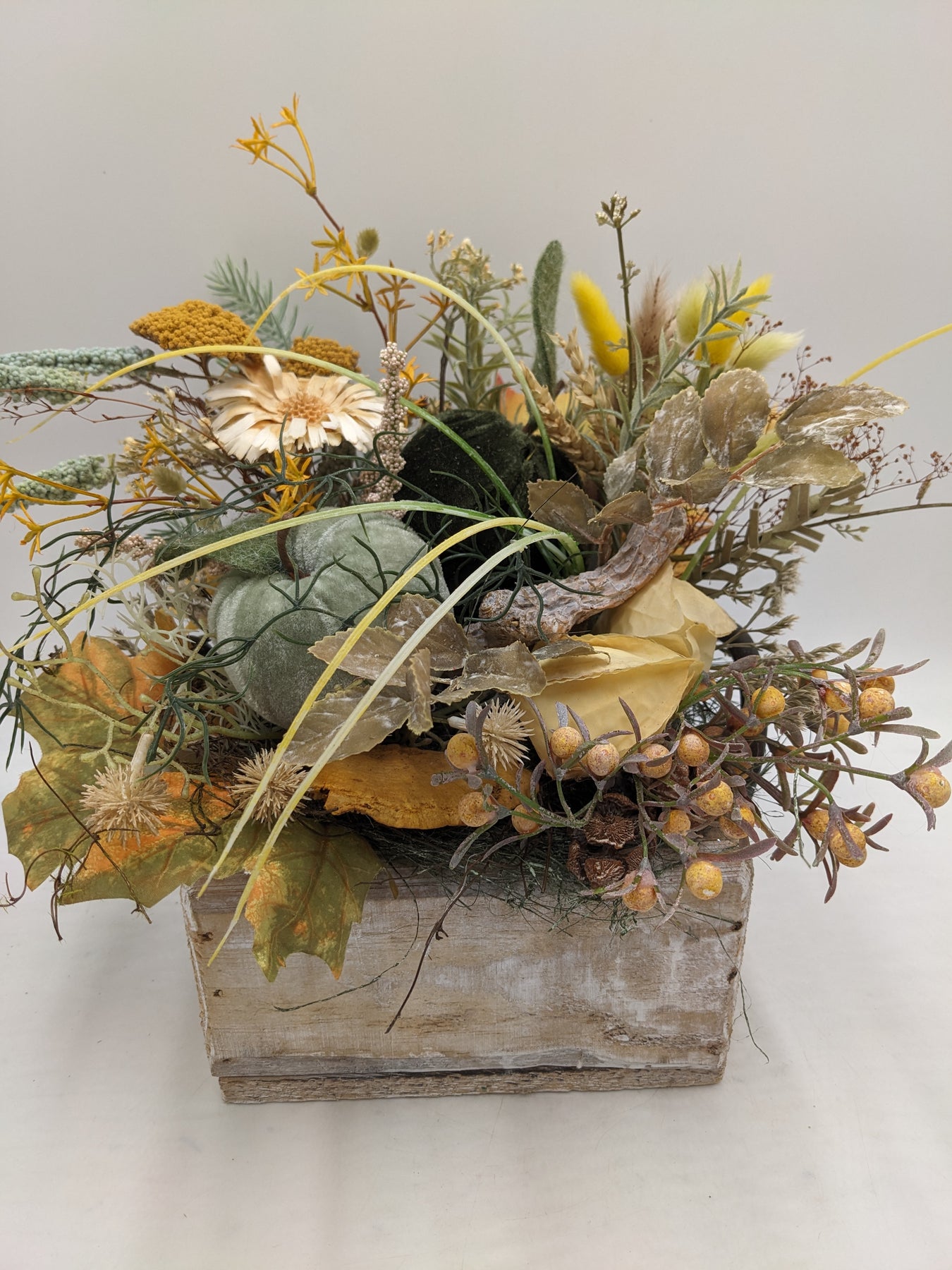 Tischgesteck in Lade, Kürbisse, Gerbera, Beeren, Blätter und Gräser, Farbe: grün, gelb, Höhe: ca. 30 cm, Breite: ca. 19 cm, Tiefe: ca. 19 cm, 3782-2025