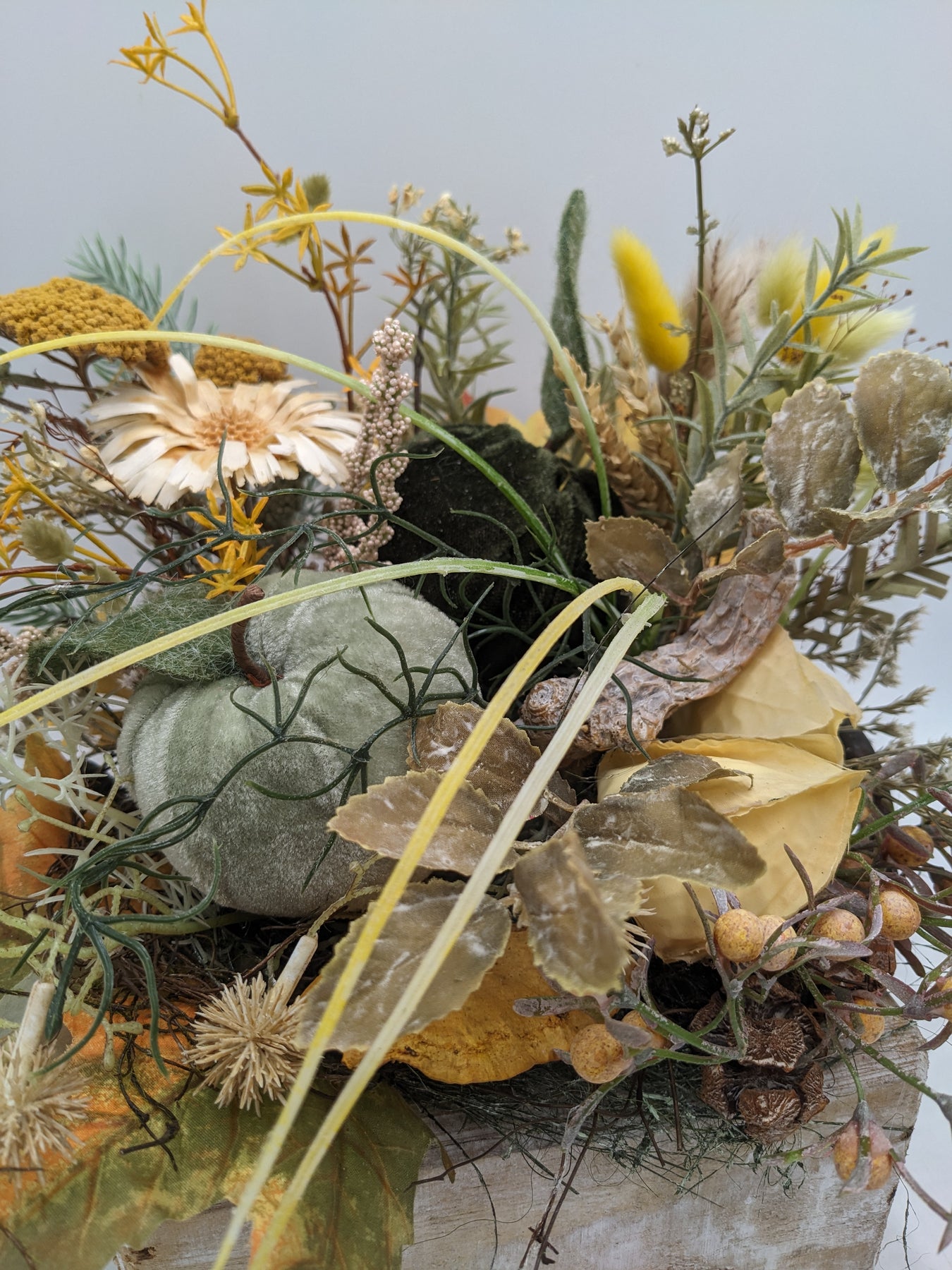 Herbstgesteck Kürbis Gerbera Beeren grün