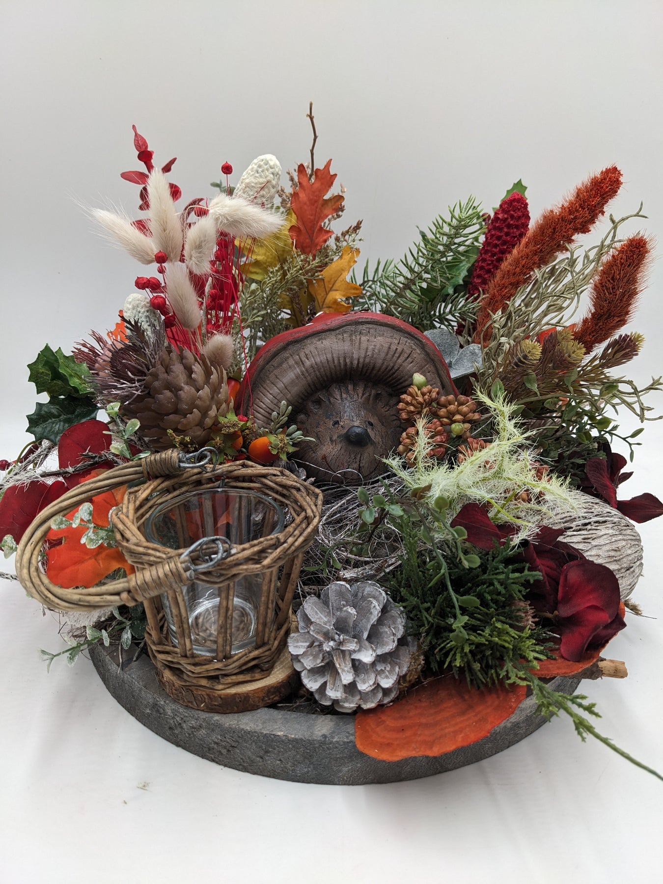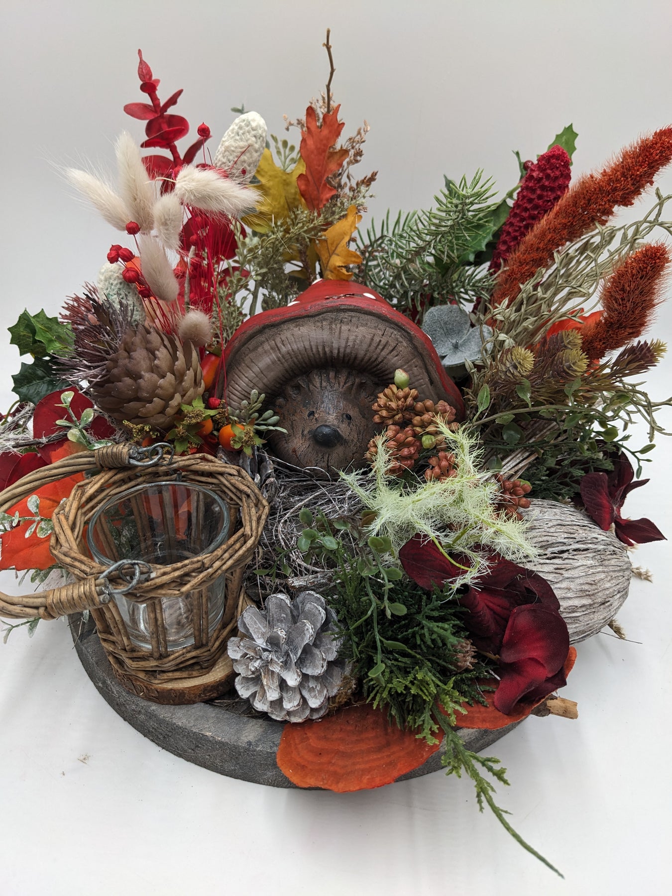 Tischgesteck im Tablett mit Teelicht, Igel, Zapfen, Fliegenpilz, Blätter und Gräser, Farbe: orange, rot, Höhe: ca. 25 cm, Durchmesser: ca. 30 cm, 3785-2025