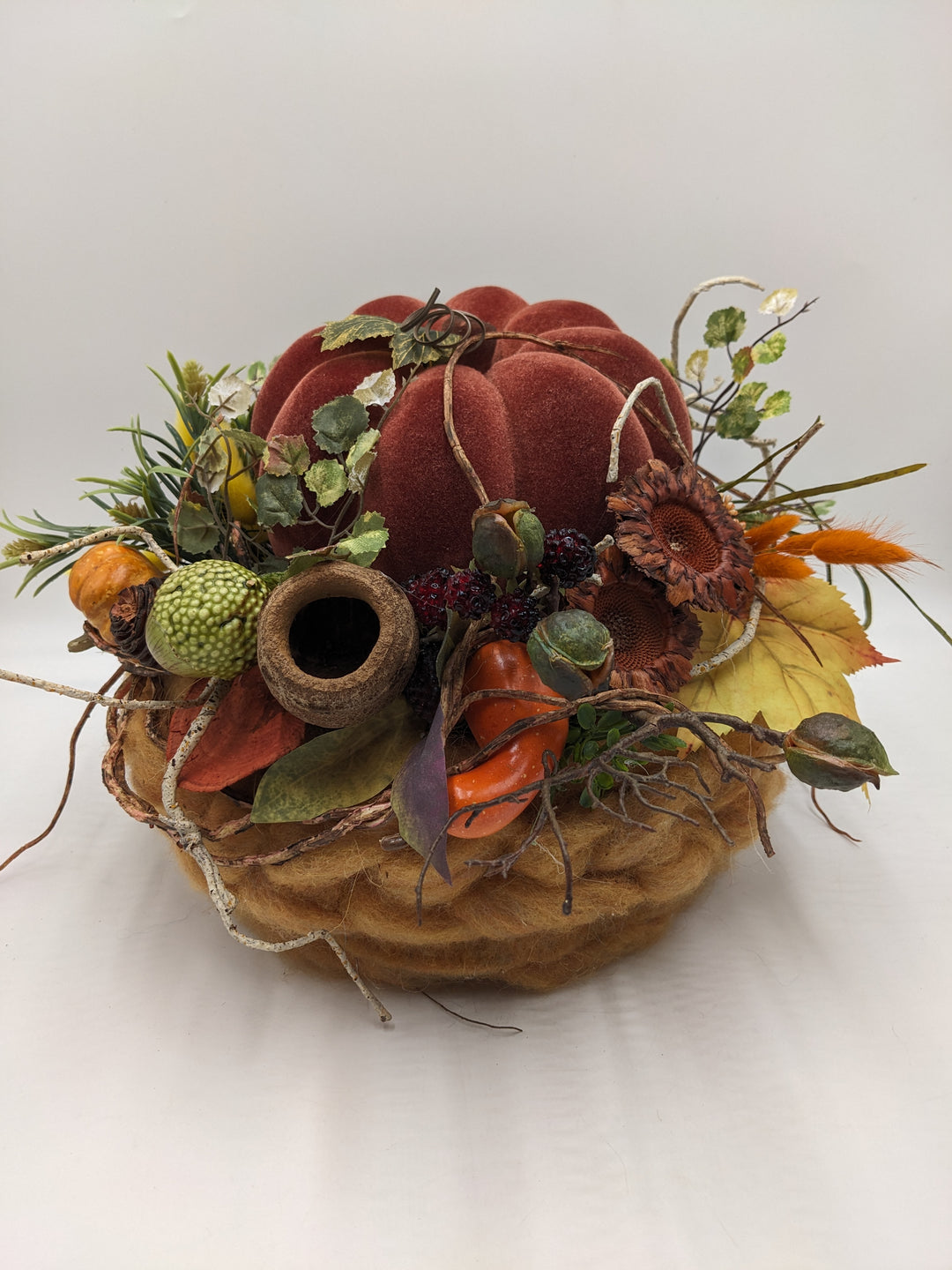 Herbstgesteck Herbstdekoration Kürbis Pilz Hopfen Efeu Sukkulente Gräser mint weiß