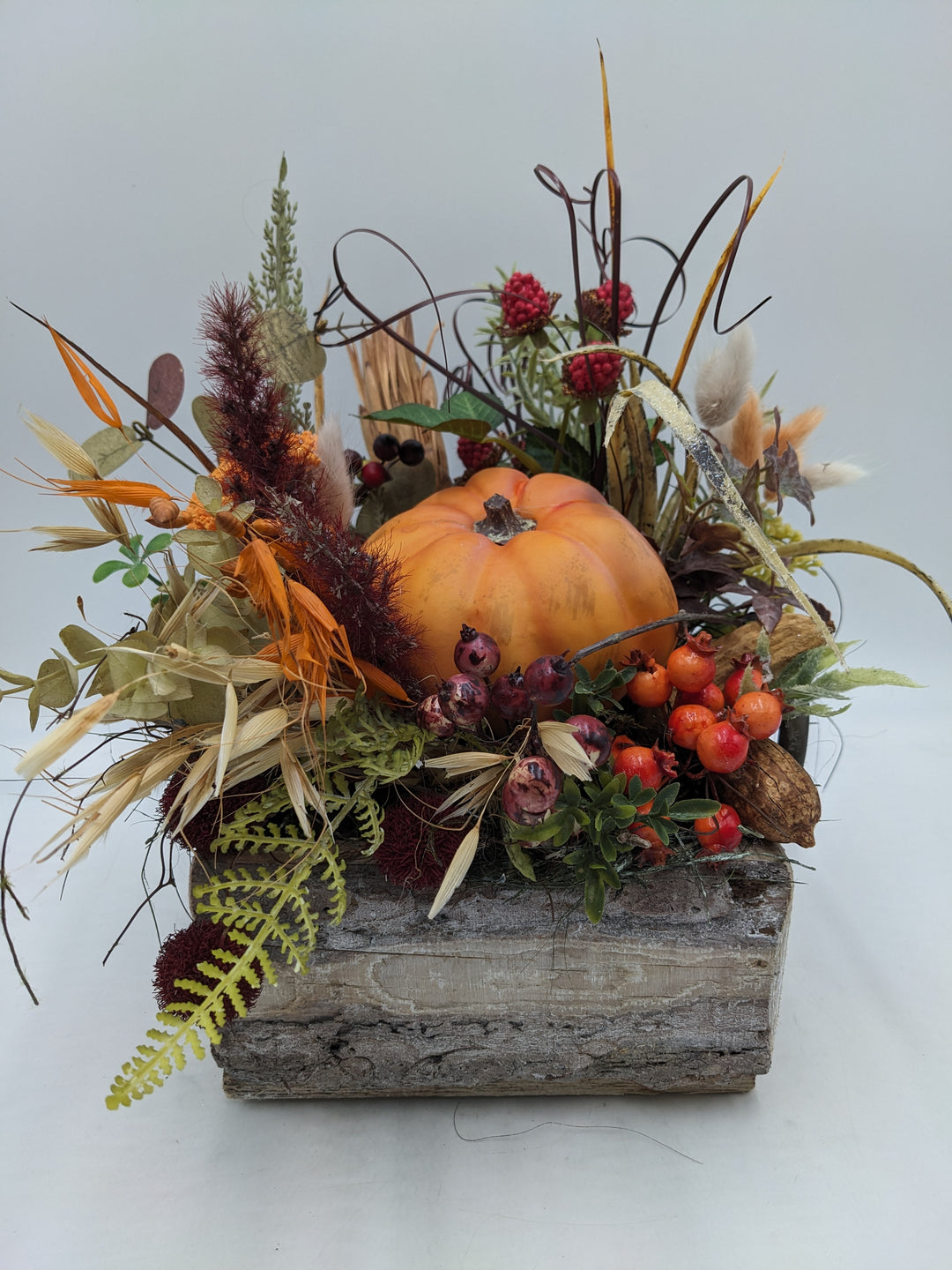 Herbstgesteck Kürbis Rose Beeren Gräser rot orange