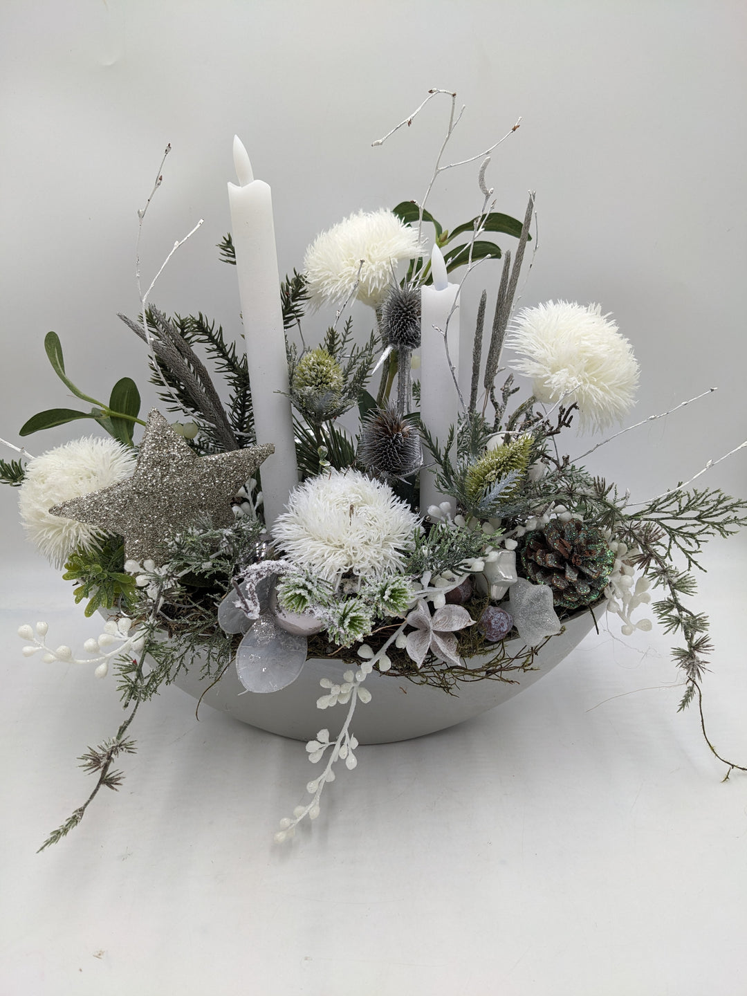 Weihnachtsgesteck LED Zapfen Stern weiß