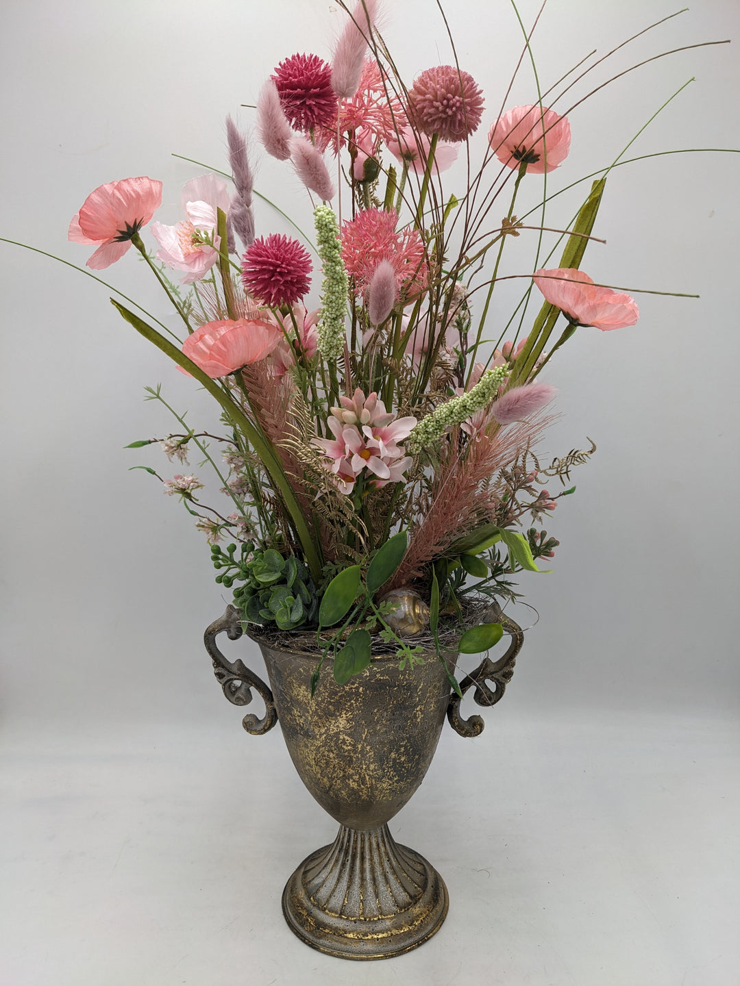 Frühlingsgesteck Sommergesteck Hyazinthen Gräser gold rosa