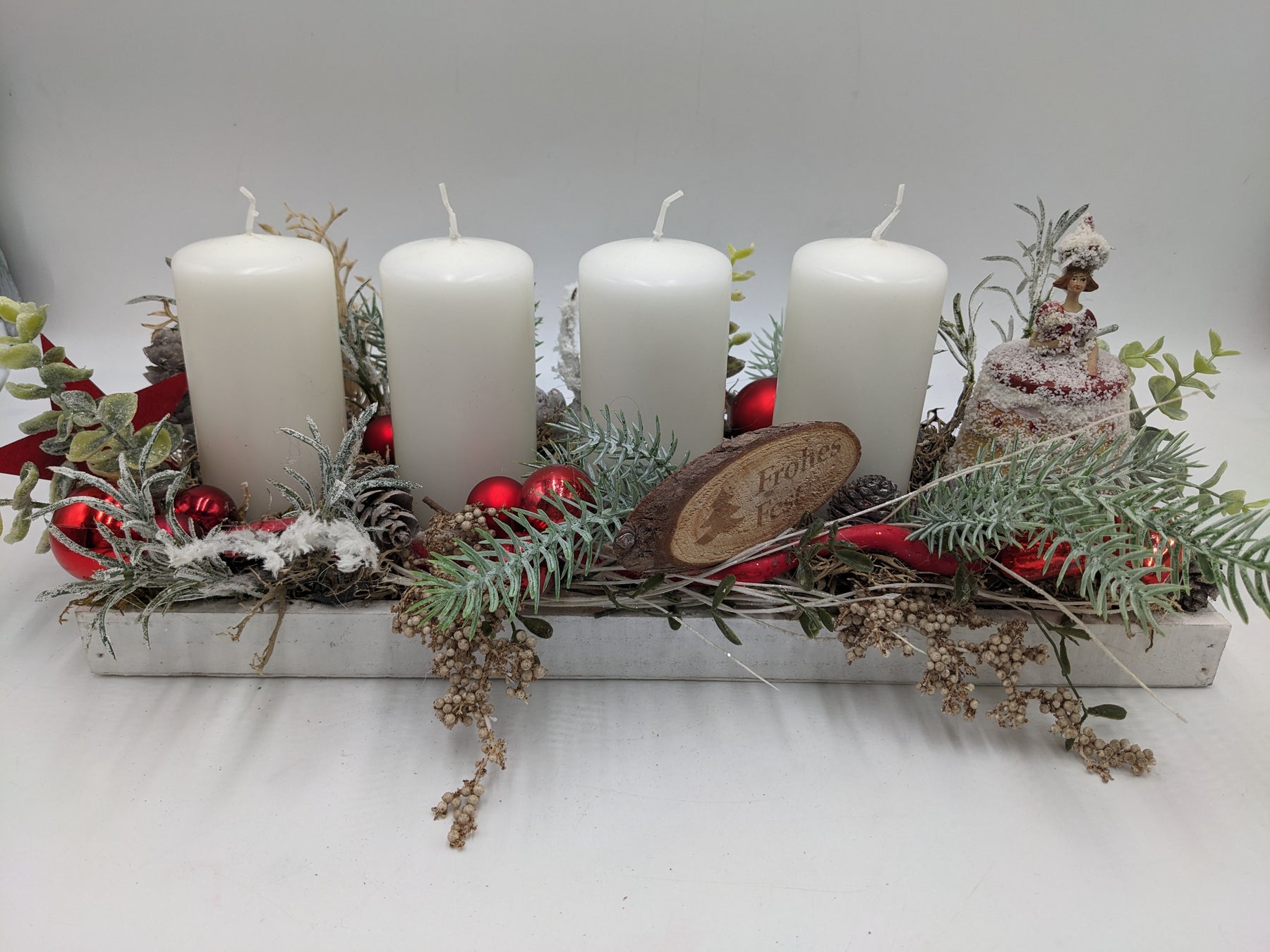 Tischgesteck im Tablett mit Kerzen, Kugeln, Stern, Glocke, Beeren und Tanne, Farbe: weiß, rot, Höhe: ca. 16 cm, Breite: ca. 42 cm, Tiefe: ca. 14 cm, 3665-2025