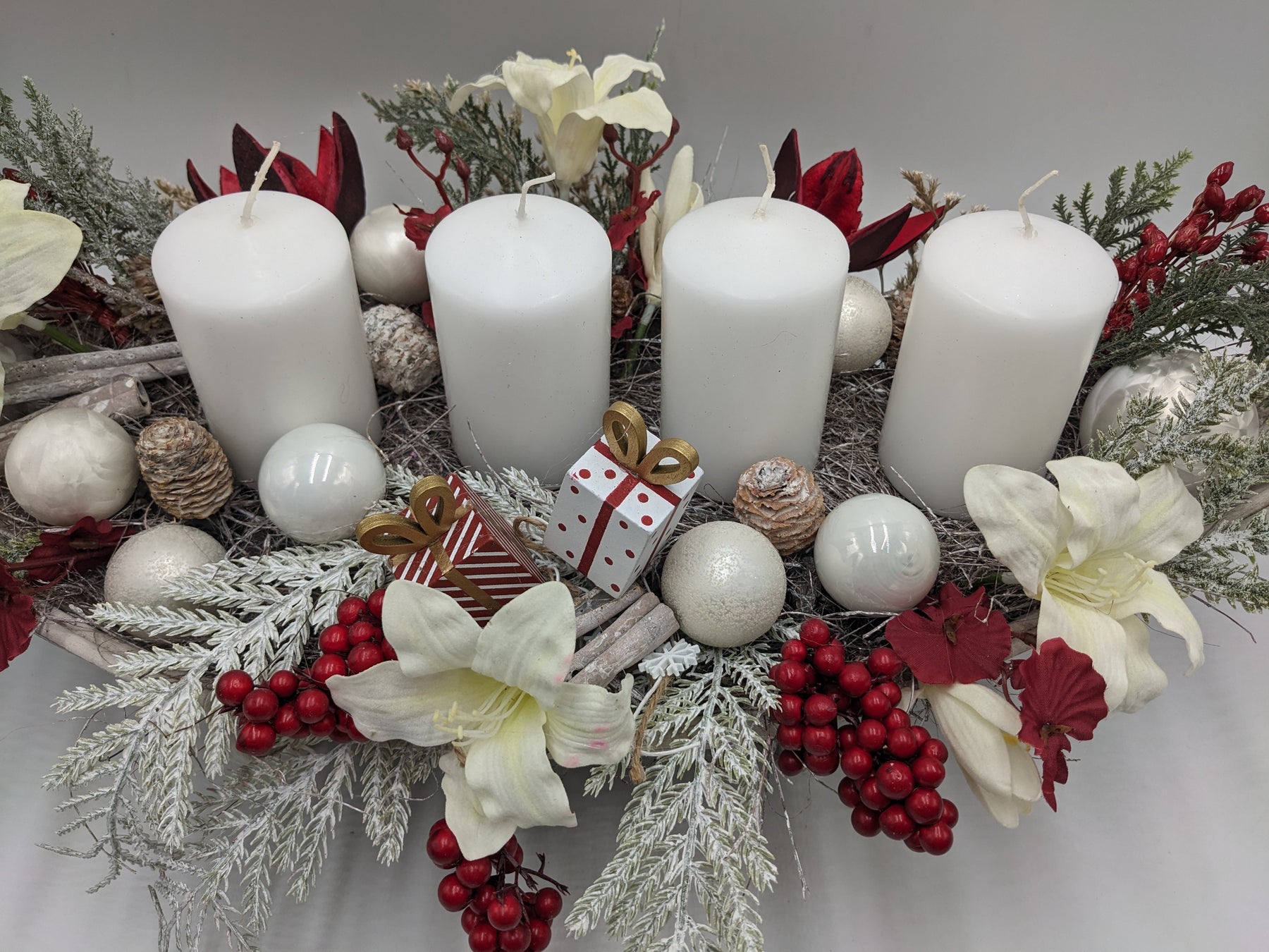 Tischgesteck im Schiffchen mit Kerzen, Kugeln, Geschenke, Zapfen, Amaryllis, Beeren, Gräser und Tanne, Farbe: weiß, rot, Höhe: ca. 21 cm, Breite: ca. 65 cm, 3868-2025