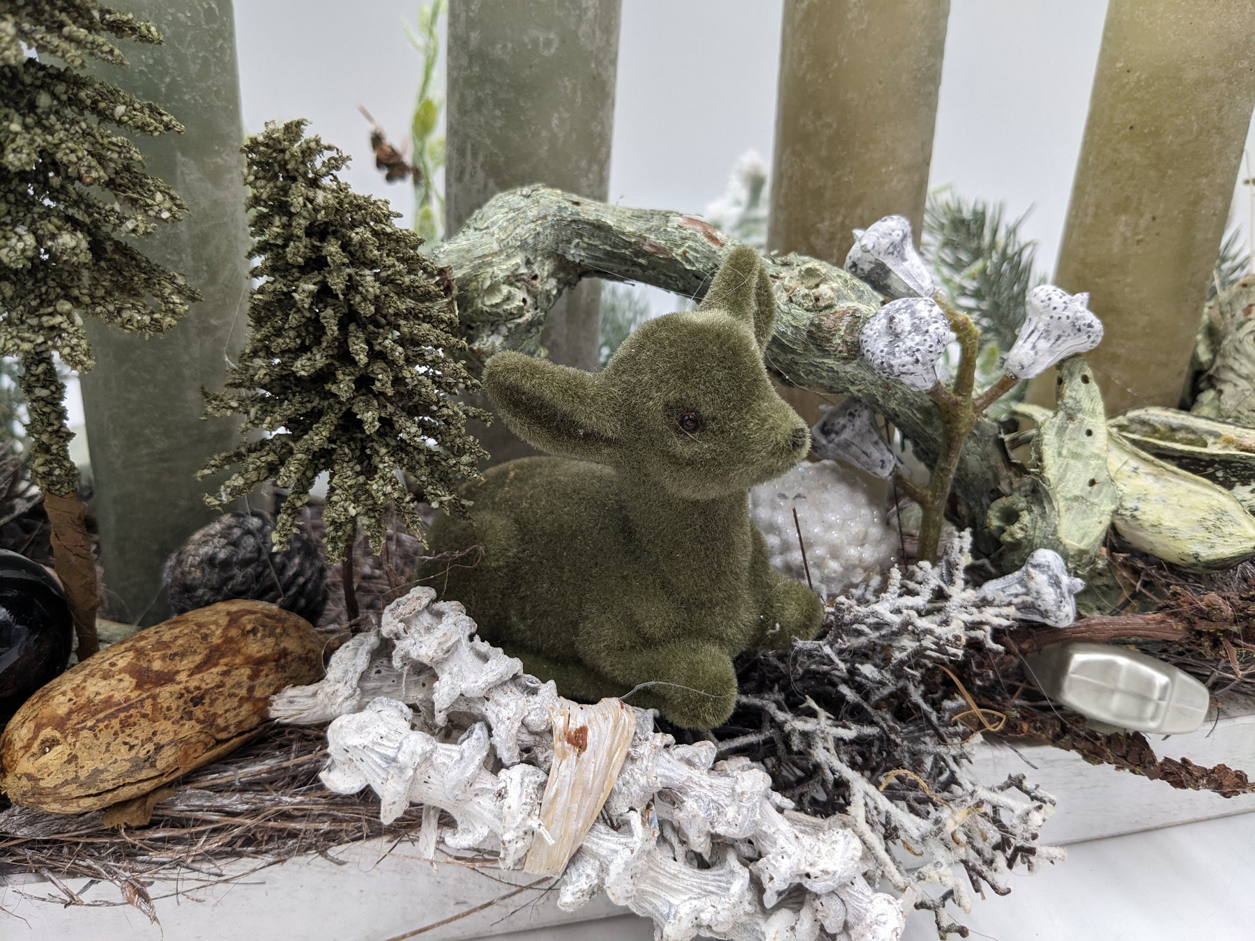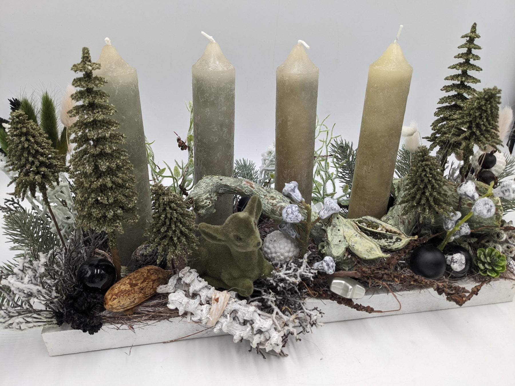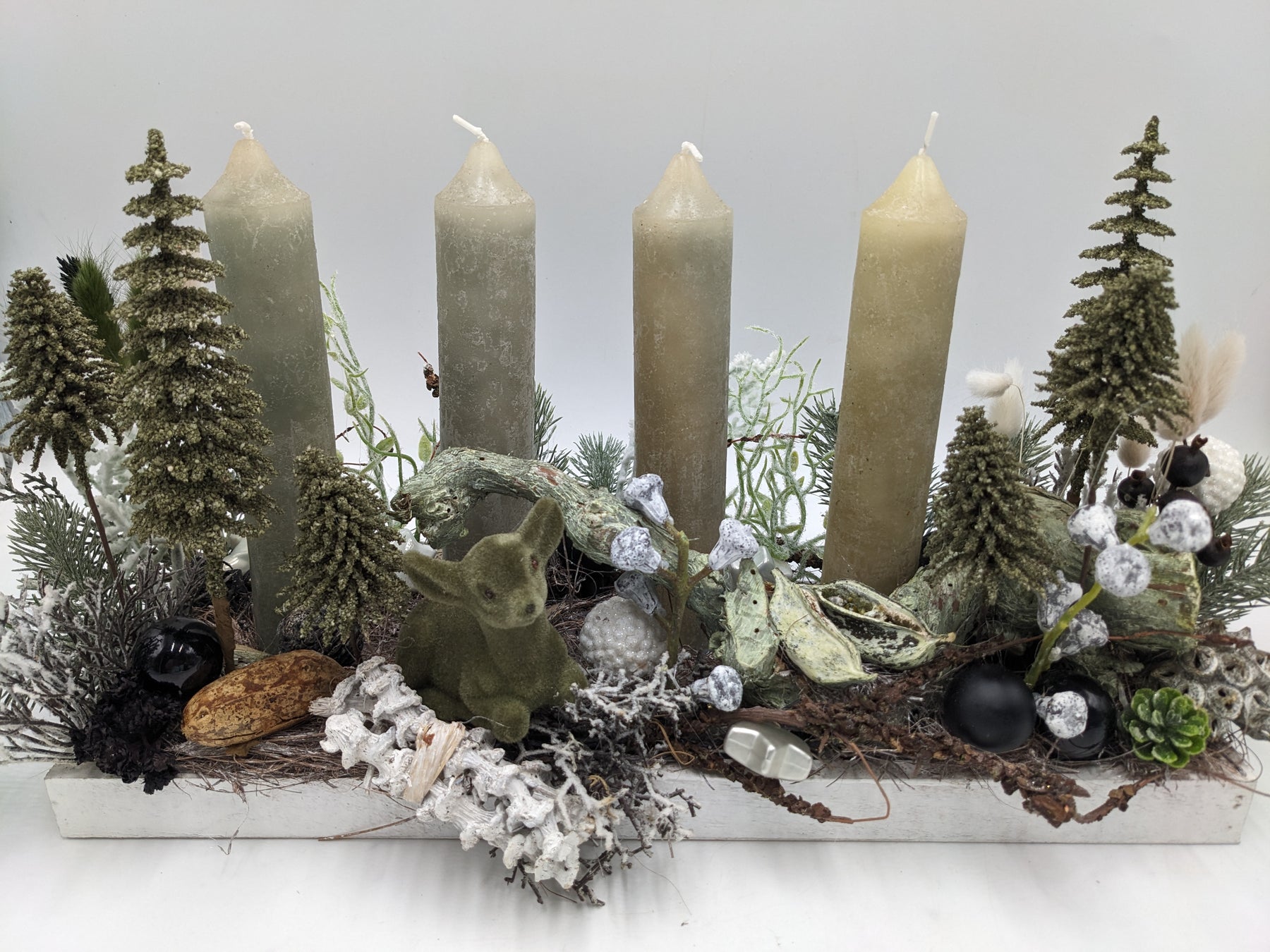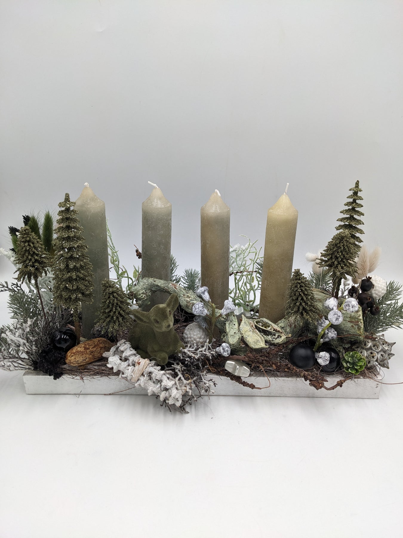 Adventsgesteck Kugel Rehkitz Tannenbäumchen grün