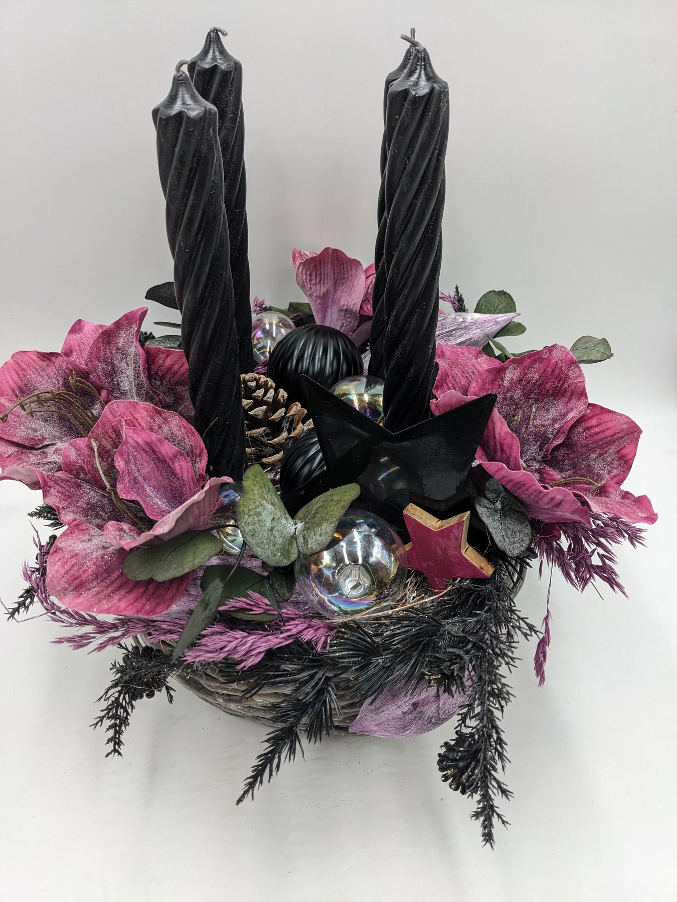 Tischgesteck im Korb mit Kerzen, Kugeln, Sterne, Zapfen, Amaryllis und Tanne, Farbe: lila, schwarz, Höhe: ca. 40 cm, Durchmesser: ca. 33 cm, 3701-2025