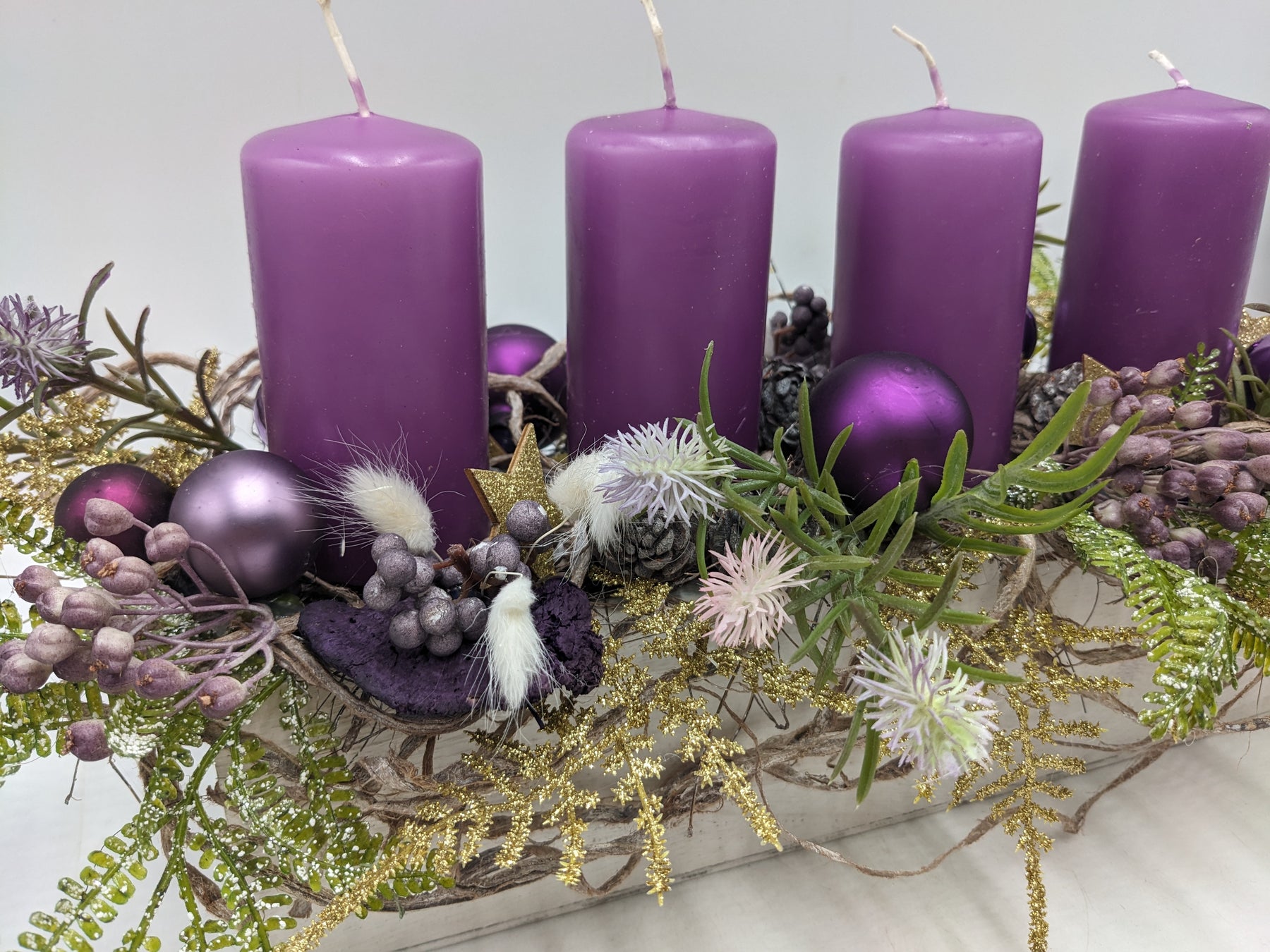 Tischgesteck im Tablett mit Kerzen, Kugeln, Sterne, Beeren, Farn und Gräser, Farbe: lila, gold, Höhe: ca. 19 cm, Breite: ca. 32 cm, Tiefe: ca. 9 cm, 3644-2025