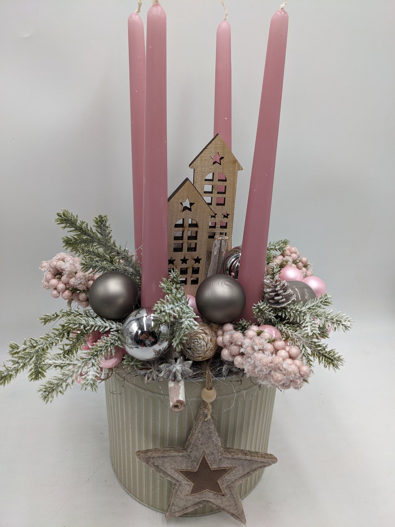 Adventsgesteck Kugel Stern Haus rosa