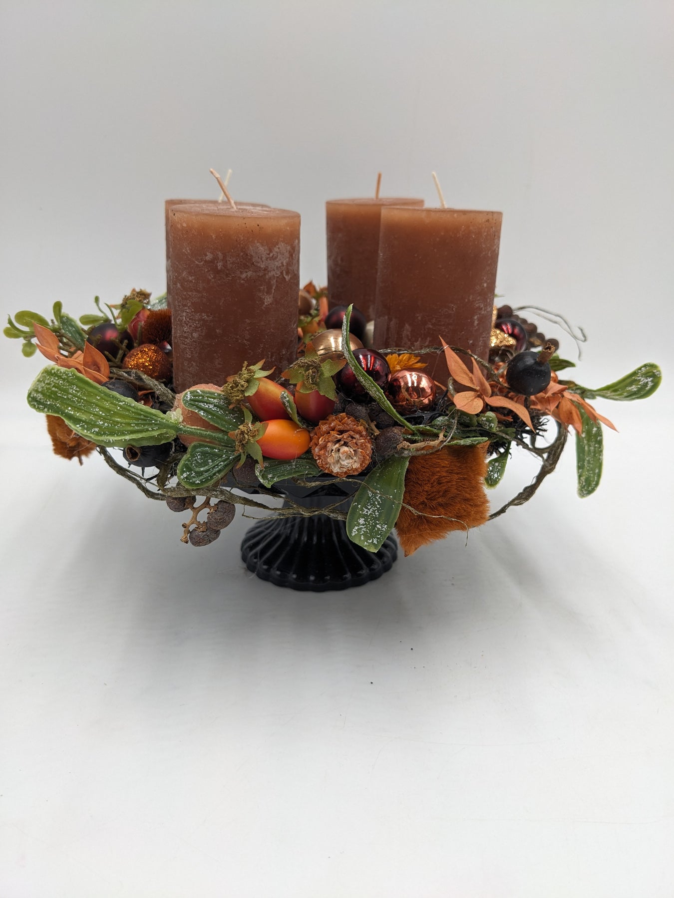 Tischgesteck auf Empore mit Kerzen, Kugeln, Zapfen, Beeren und Gräser, Farbe: orange, schwarz, Höhe: ca. 18 cm, Durchmesser: ca. 20 cm, 3703-2025