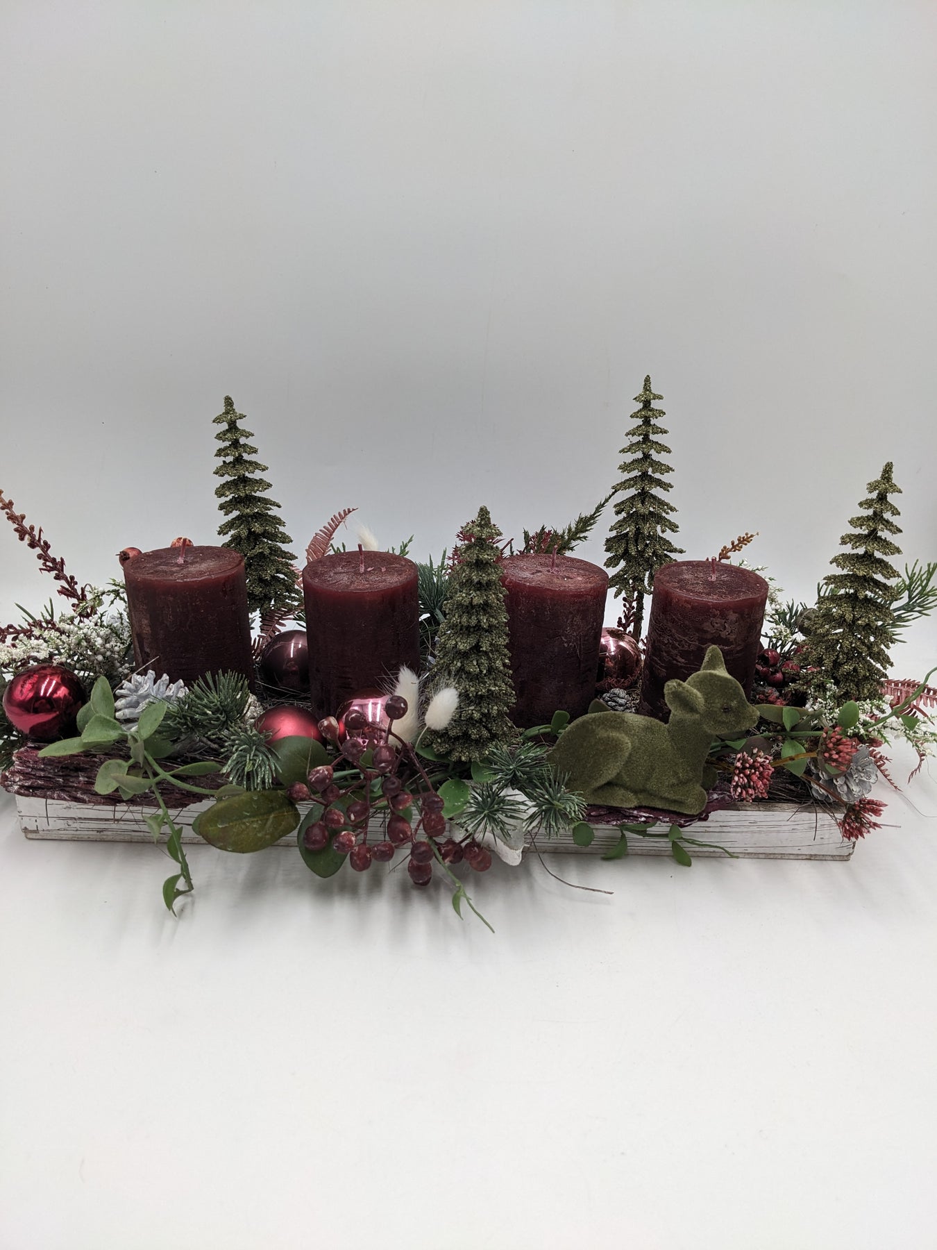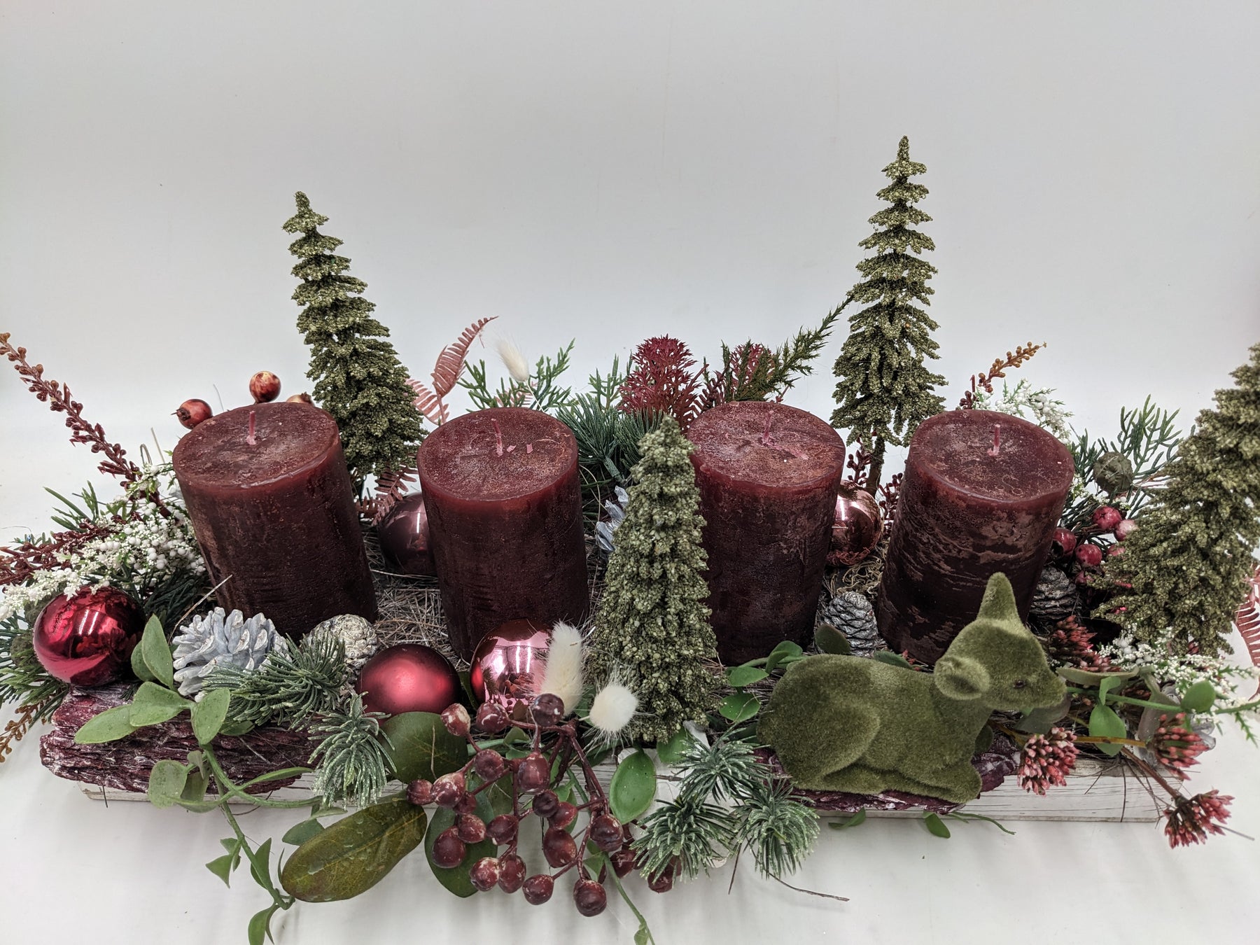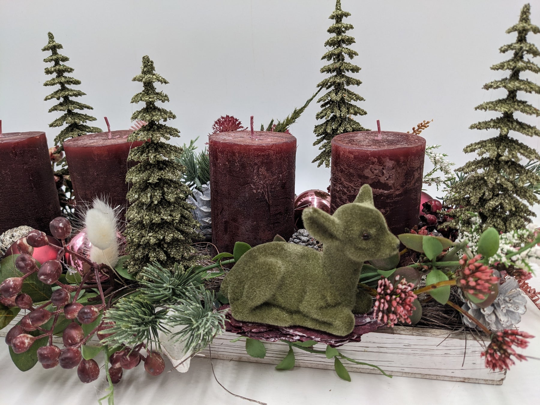Adventsgesteck Kugel Zapfen Rehkitz dunkelrot