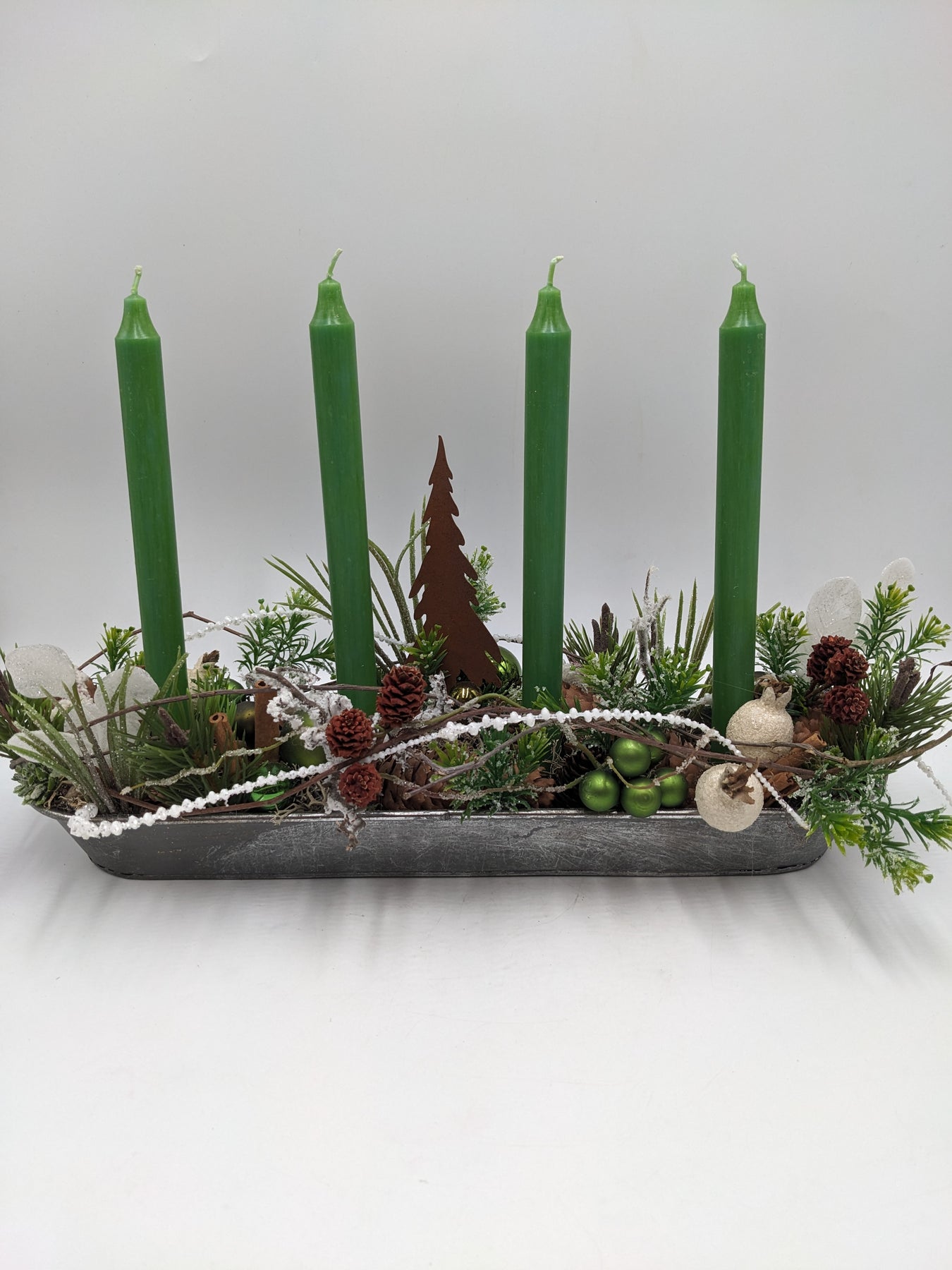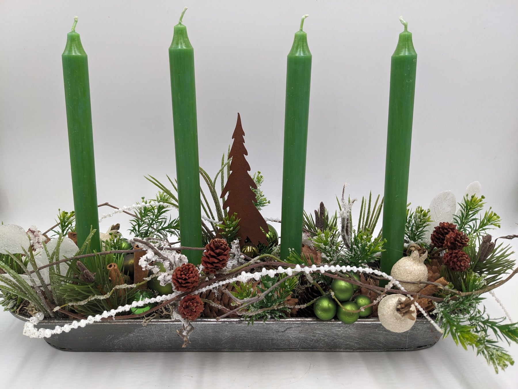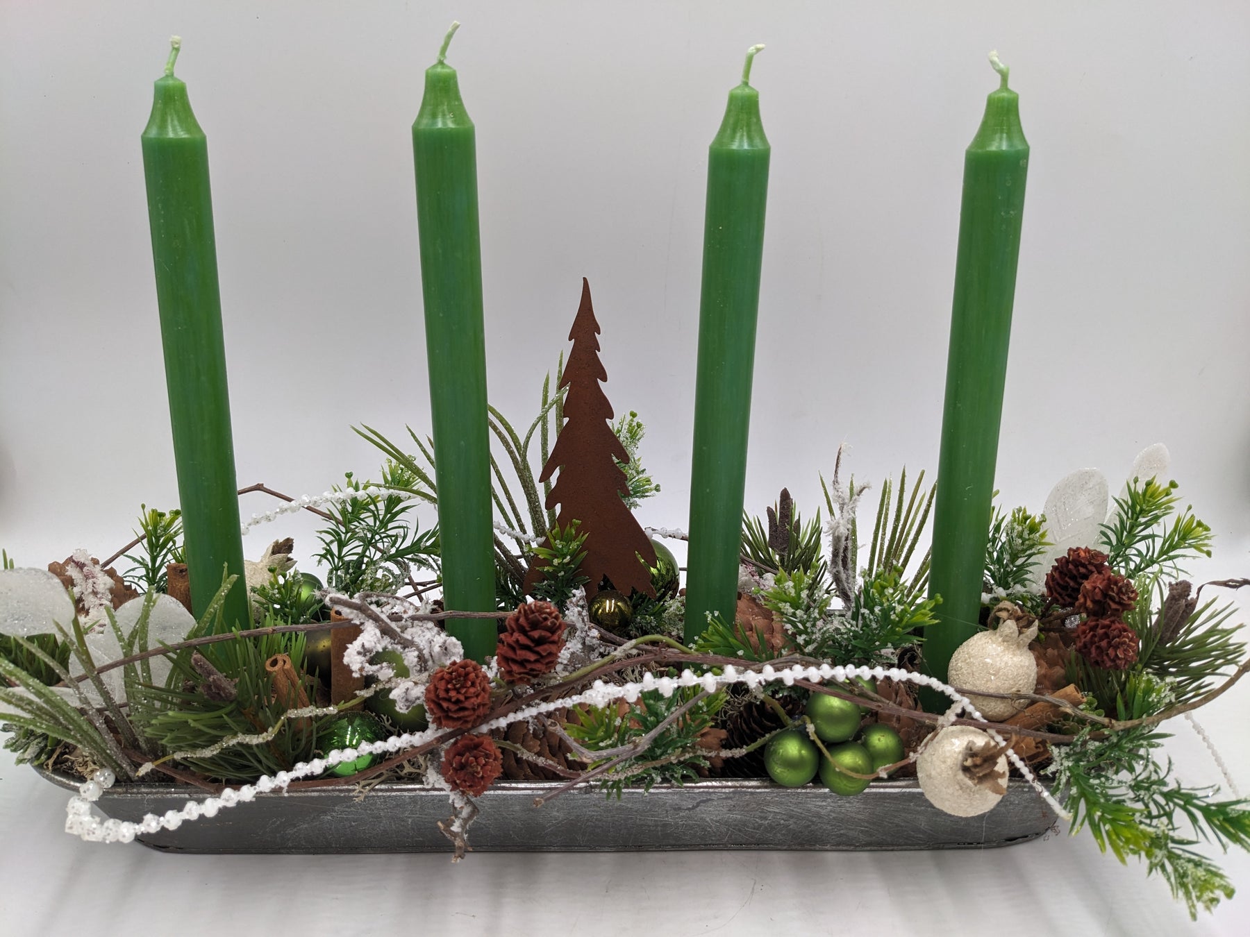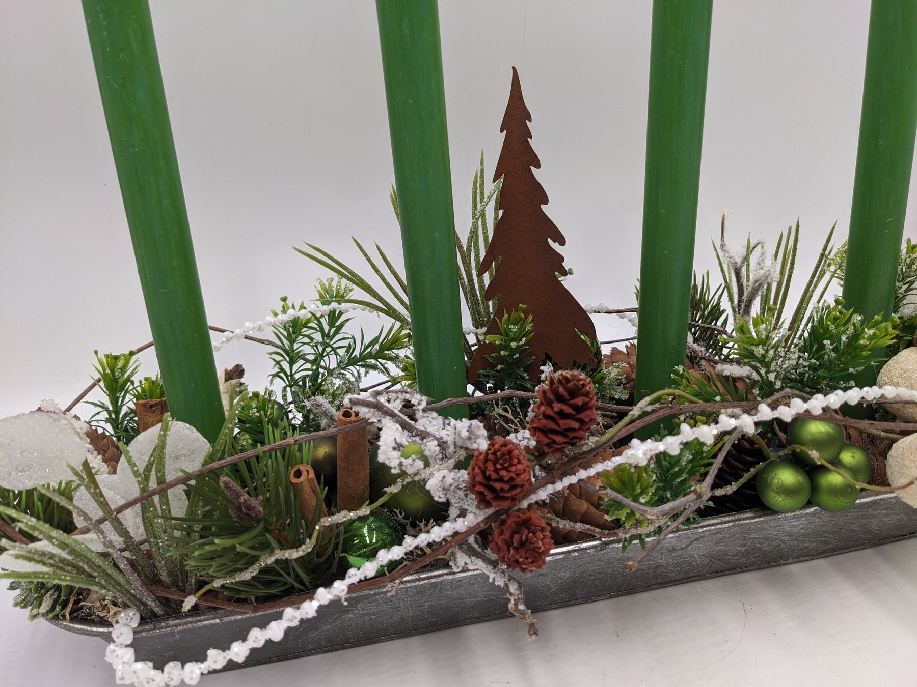 Tischgesteck im Tablett mit Kerzen, Kugeln, Zapfen, Zimt, Rosttanne, Beeren und Tanne, Farbe: grün, creme, Höhe: ca. 30 cm, Breite: ca. 45 cm, 3746-2025