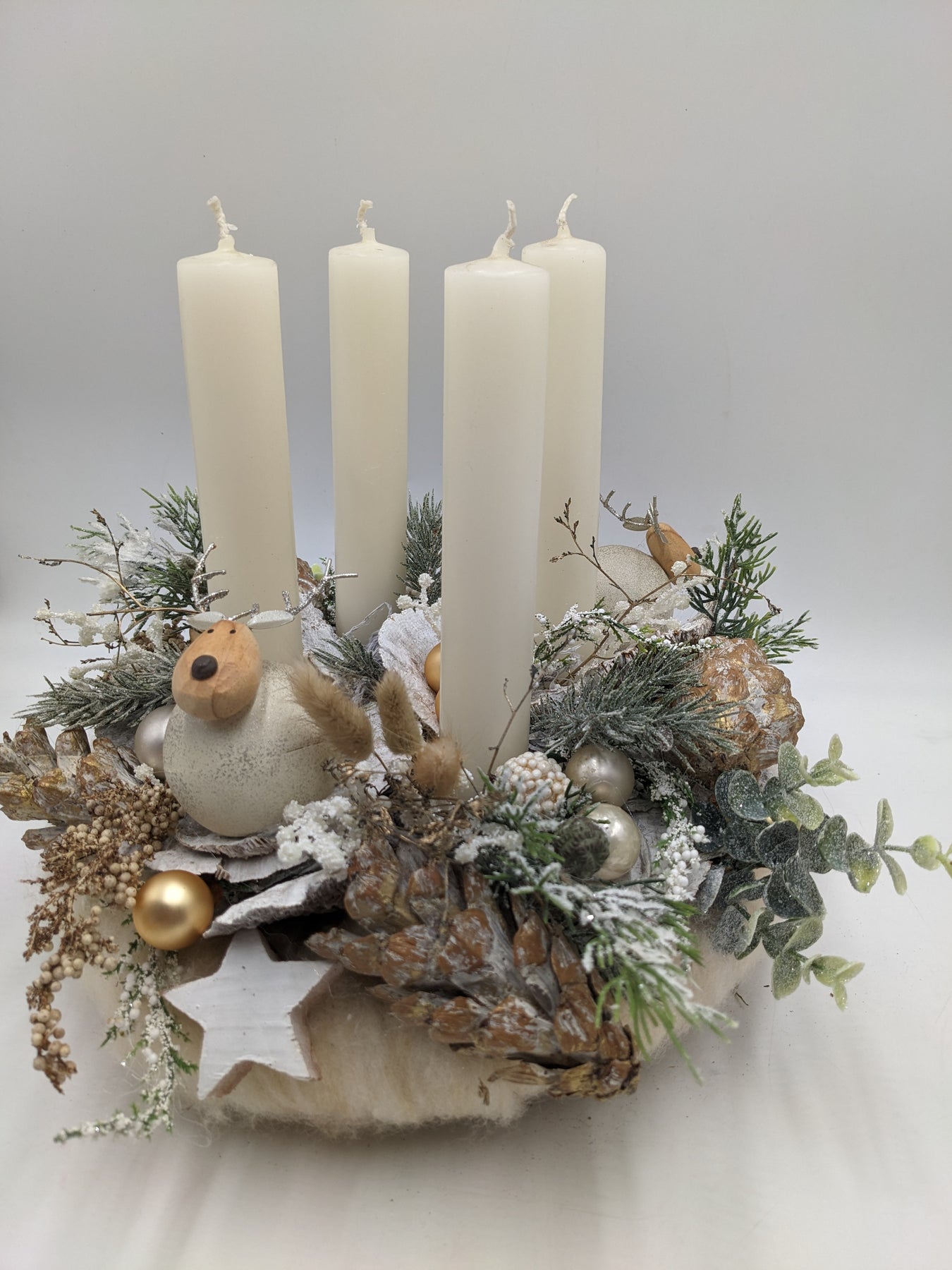 Tischkranz mit Kerzen, Kugeln, Zapfen, Sterne, Elche, Gräser und Tanne, Farbe: creme, natur, Höhe: ca. 29 cm, Durchmesser: ca. 30 cm, 3688-2025