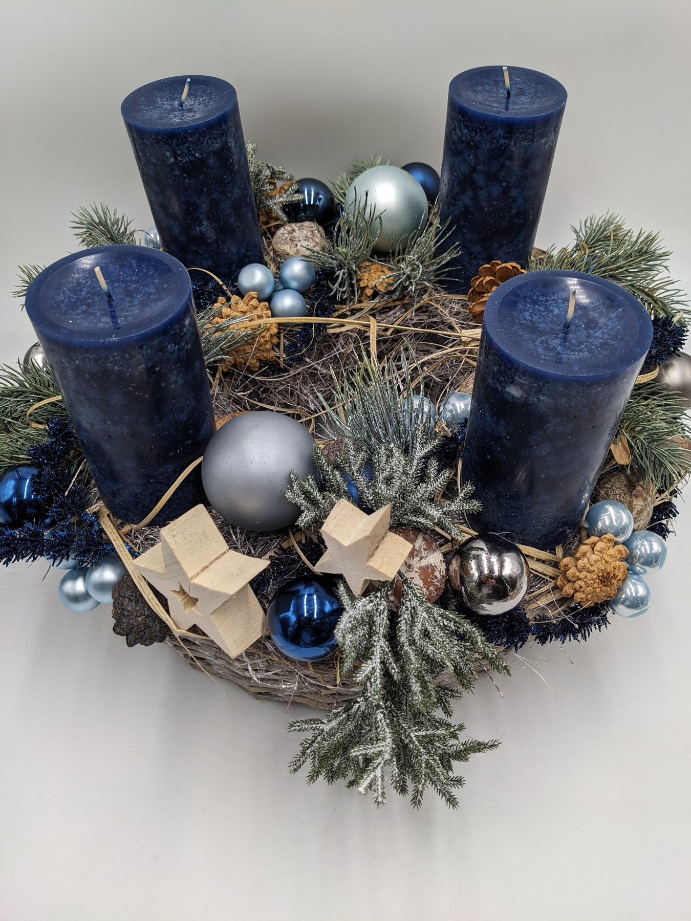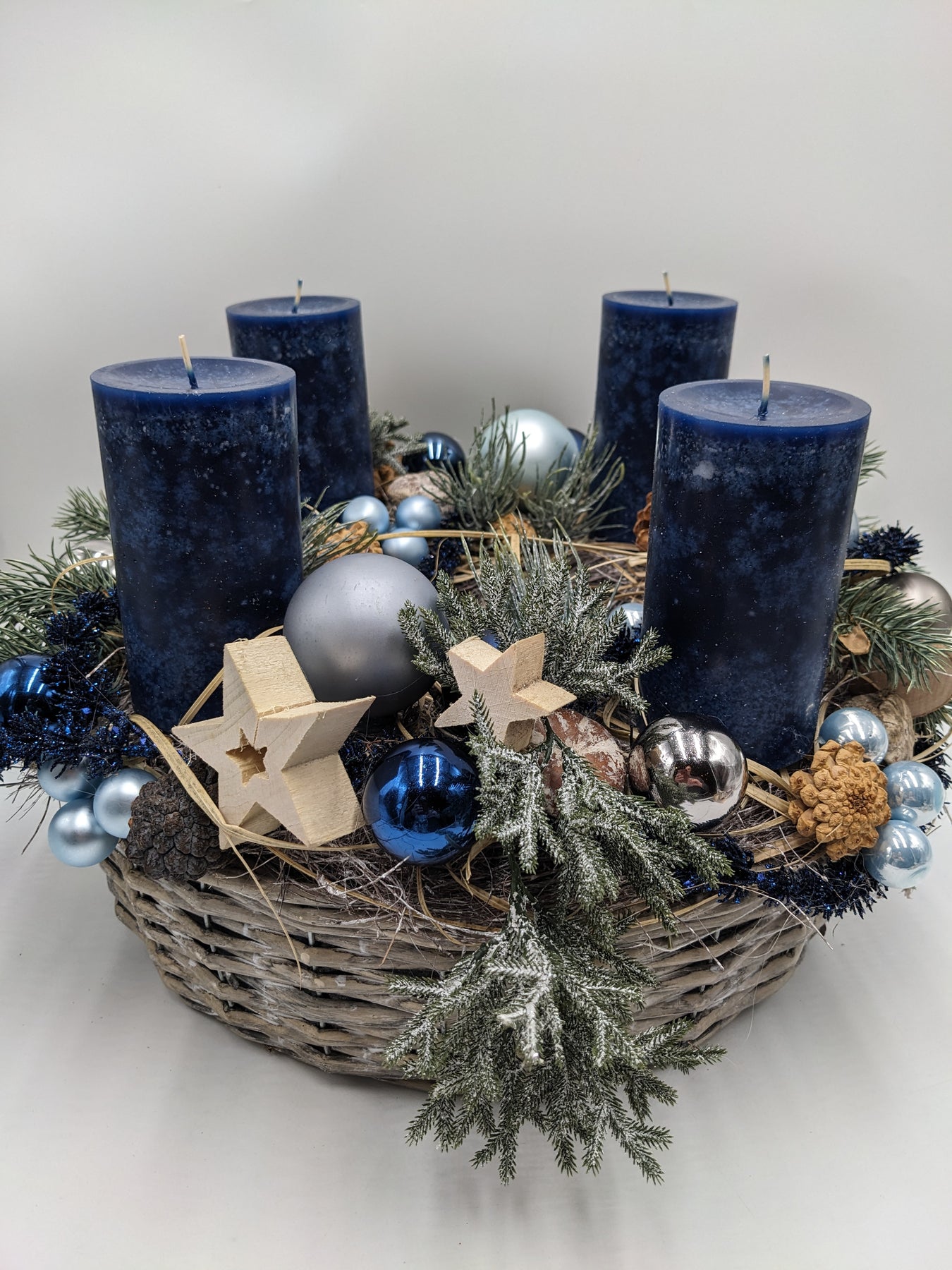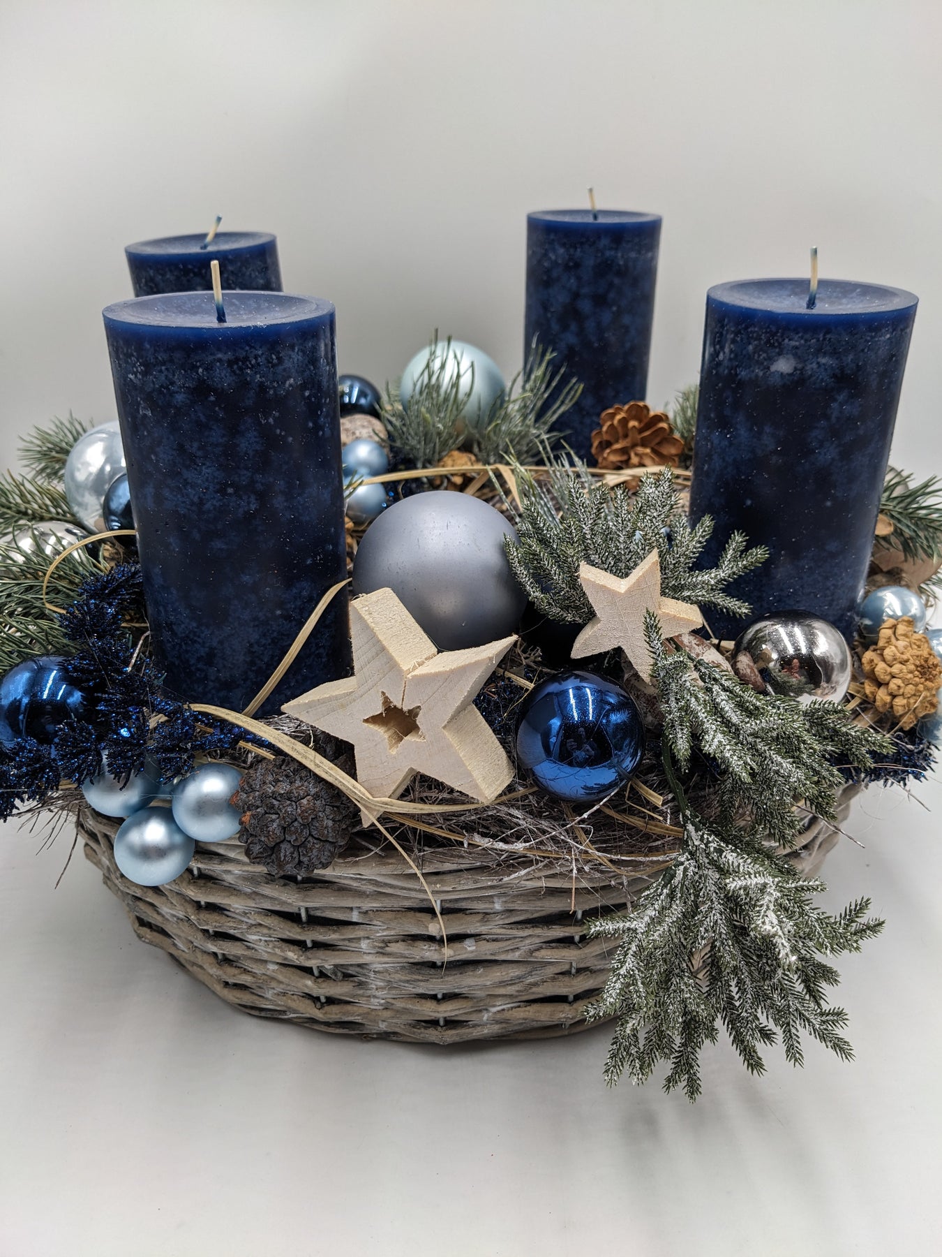 Tischkranz im Korb mit Kerzen, Kugeln, Sterne, Zapfen, Beiwerk und Tanne, Farbe: blau, natur, Höhe: ca. 27 cm, Durchmesser: ca. 40 cm, 3912-2025