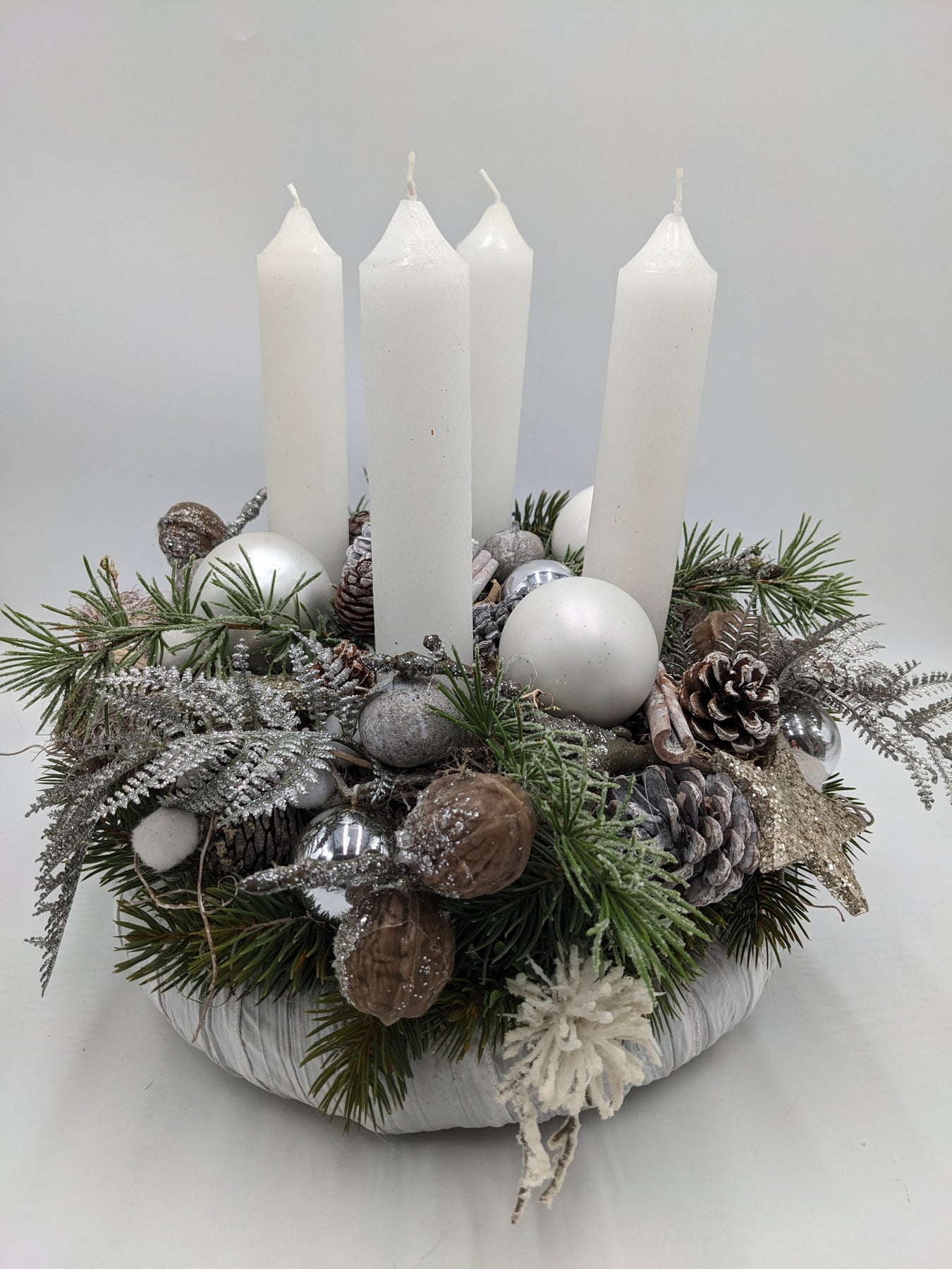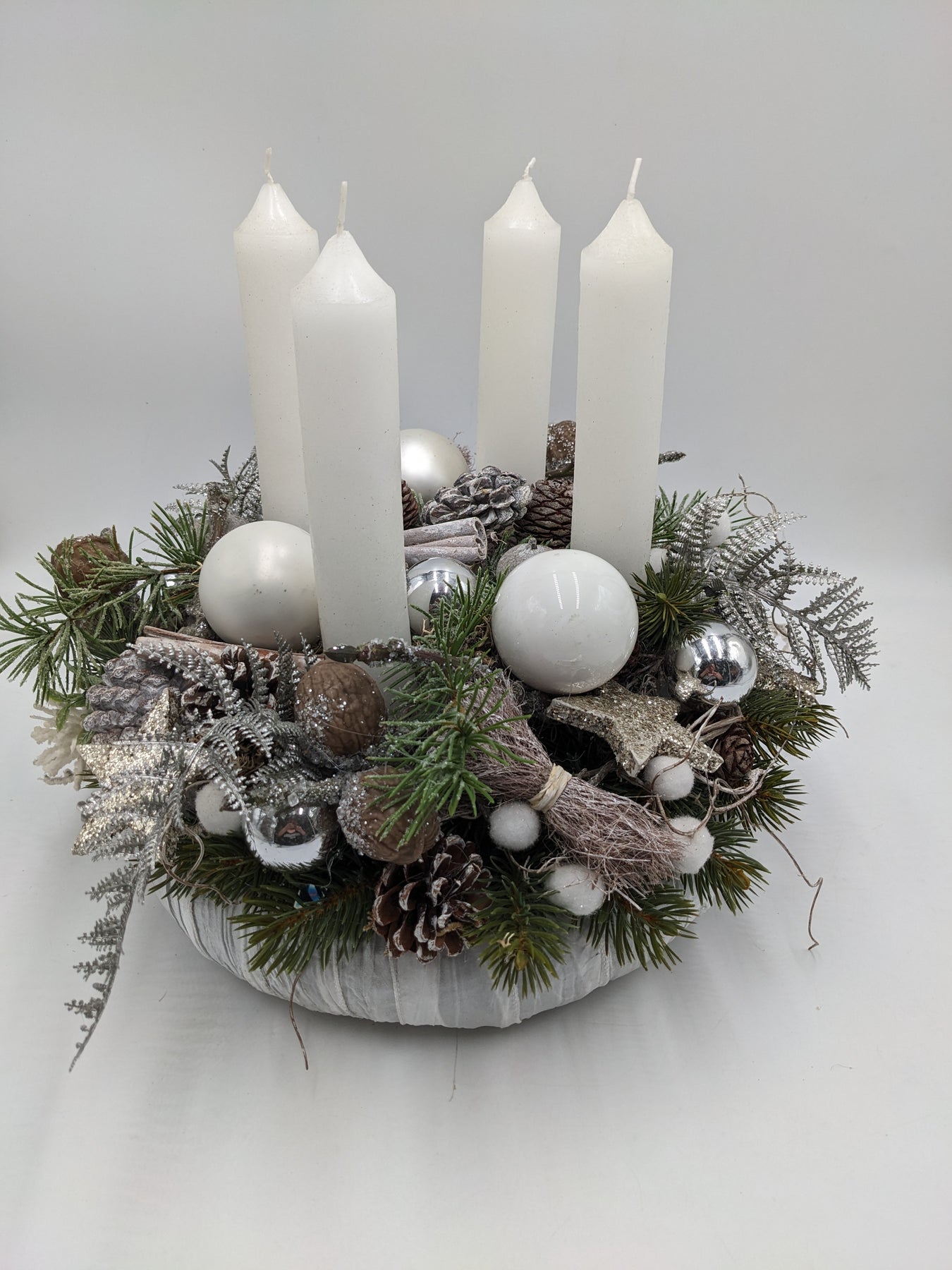 Tischkranz mit Kerzen, Kugeln, Zapfen, Sterne, Nüsse, Farn und Tanne, Farbe: weiß, silber, Höhe: ca. 33 cm, Durchmesser: ca. 34 cm, 3632-2025