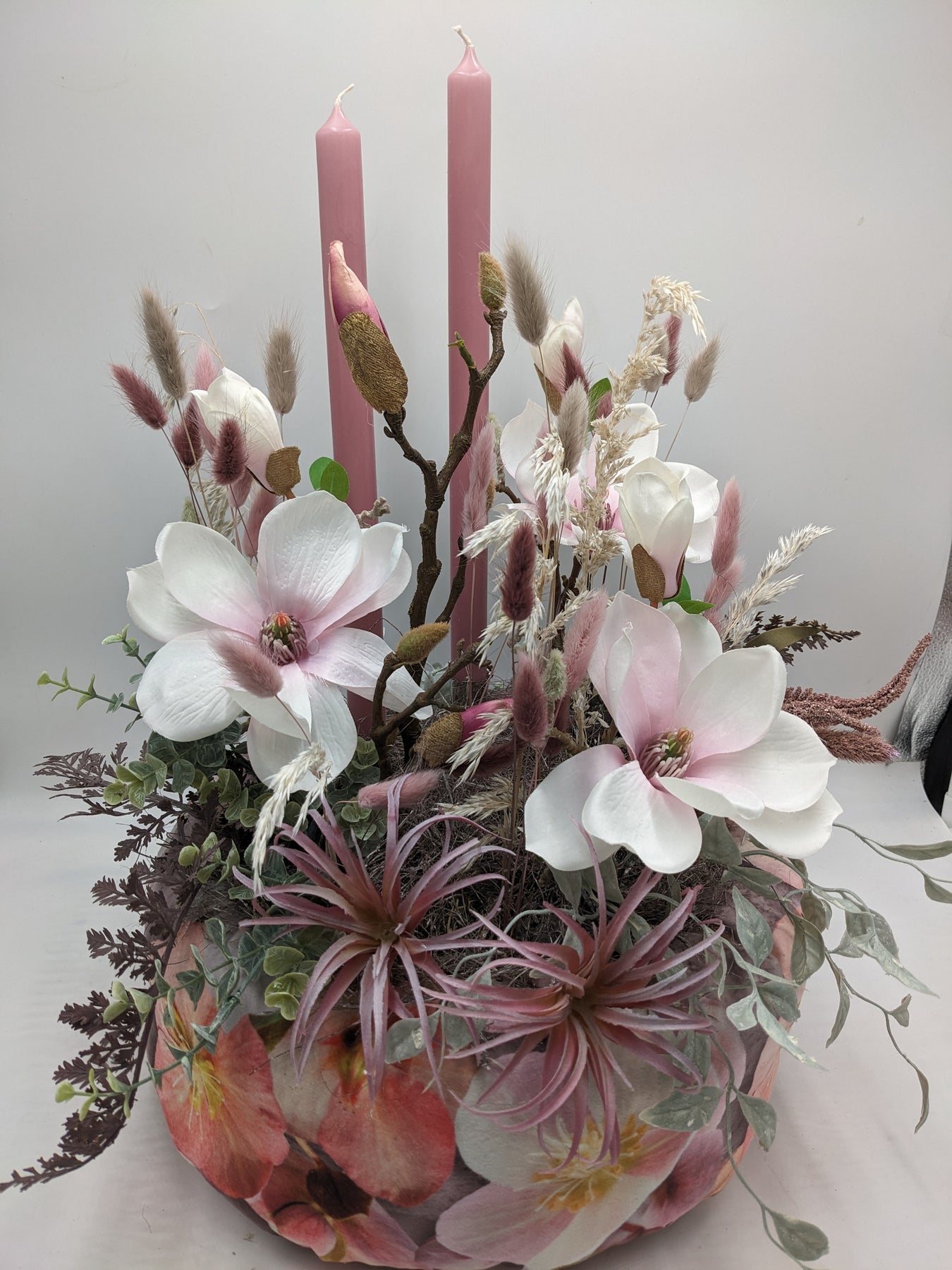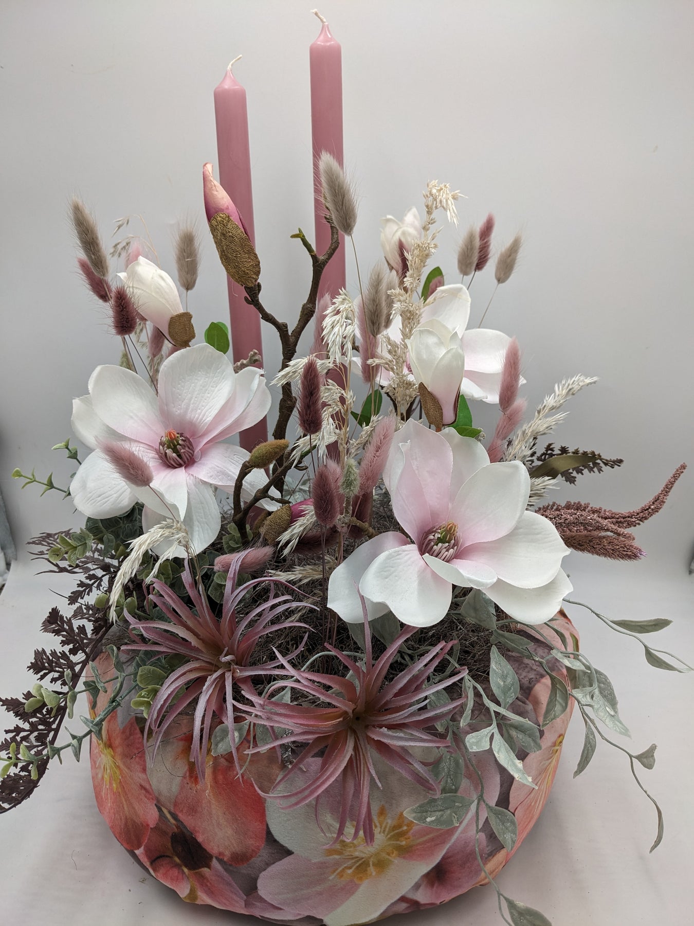 Tischgesteck im runden Gefäß mit Blumenmuster, gestaltet mit Magnolien, Trockenblumen, zwei Stabkerzen, Gräsern und feinem Grün, Farbe: rosa, Höhe: ca. 54 cm, Durchmesser: ca. 35 cm, 4019-2026