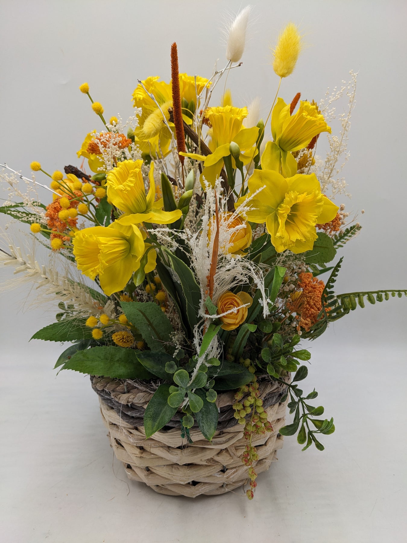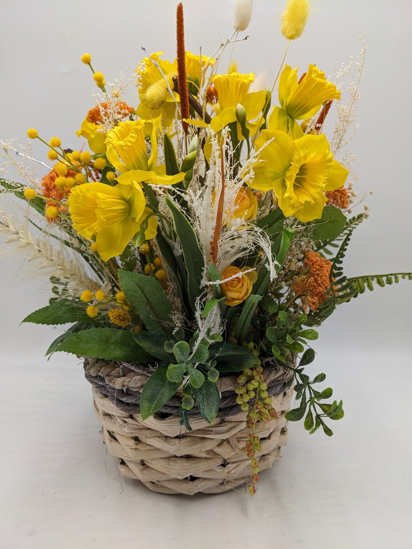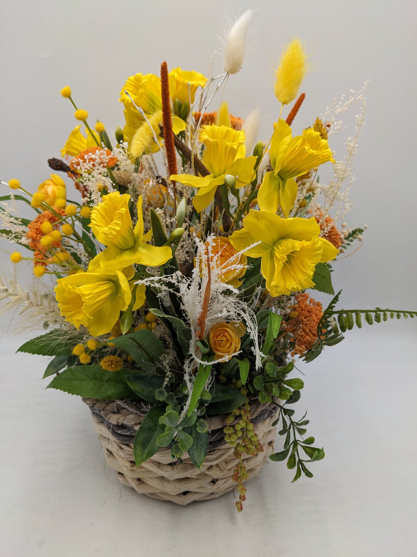Tischgesteck im Korb, dekoriert mit Blüten, Beeren, Gräsern und Blattgrün, Farbe: gelb, orange, Höhe: ca. 39 cm, Durchmesser: ca. 20 cm, 4001-2026