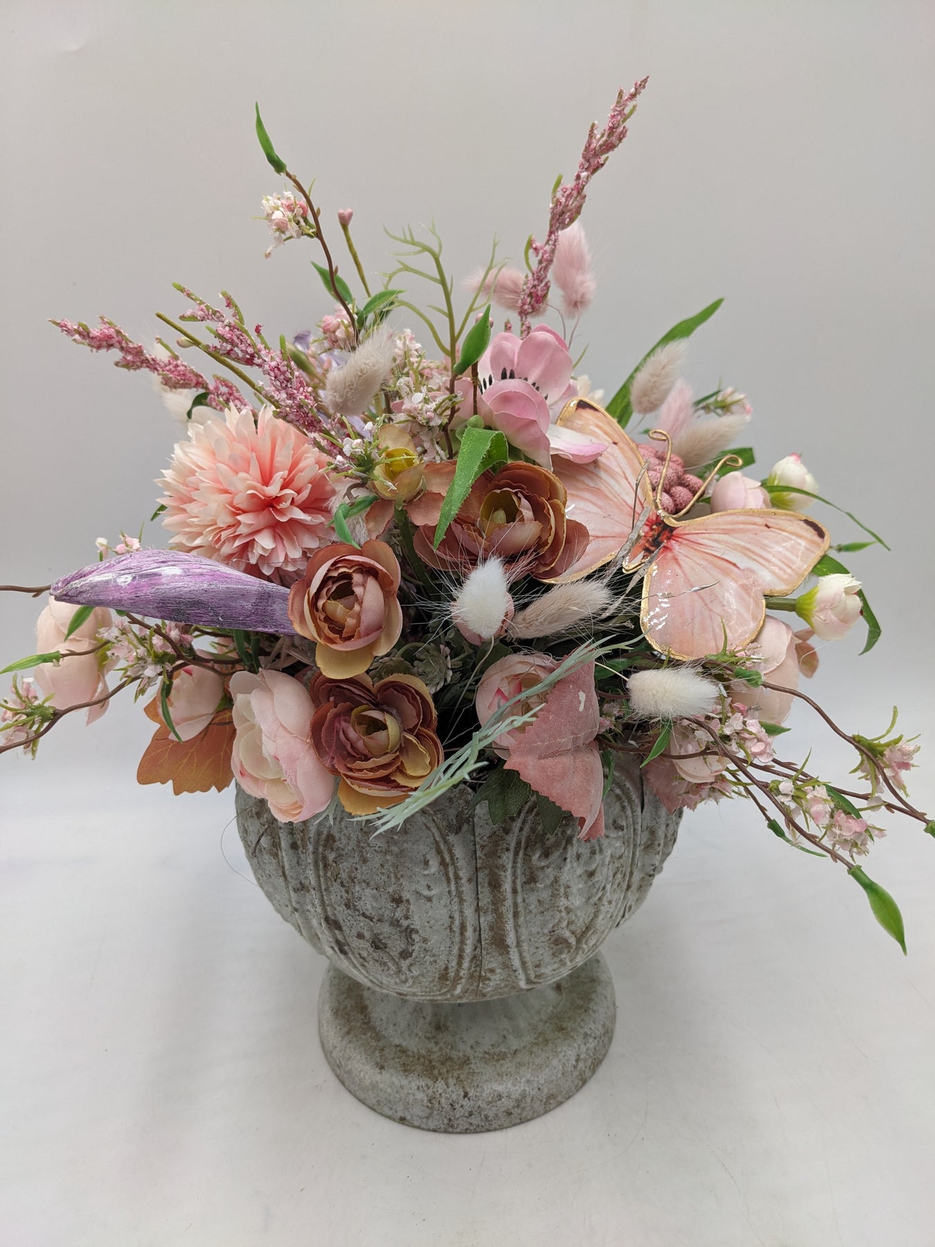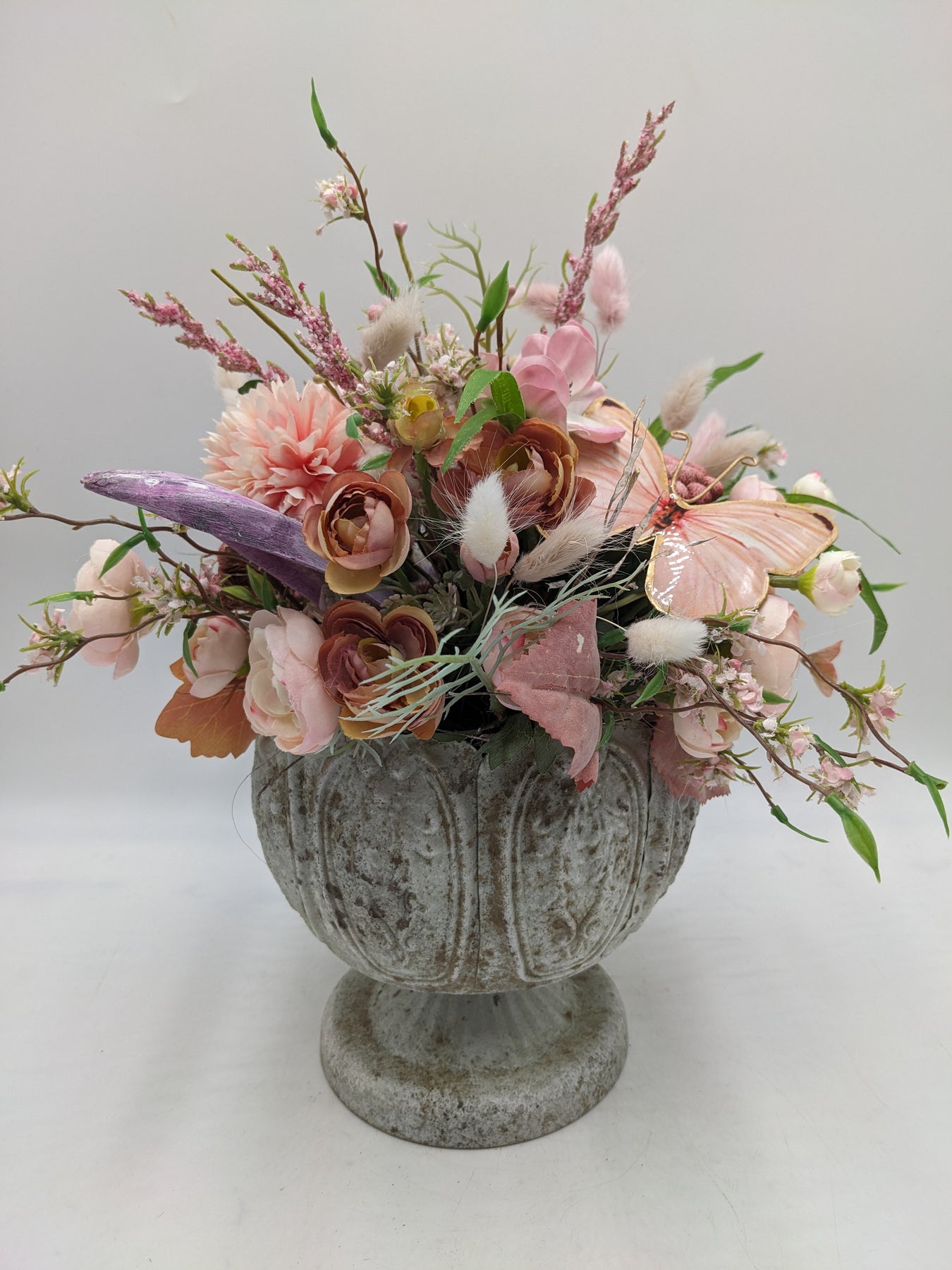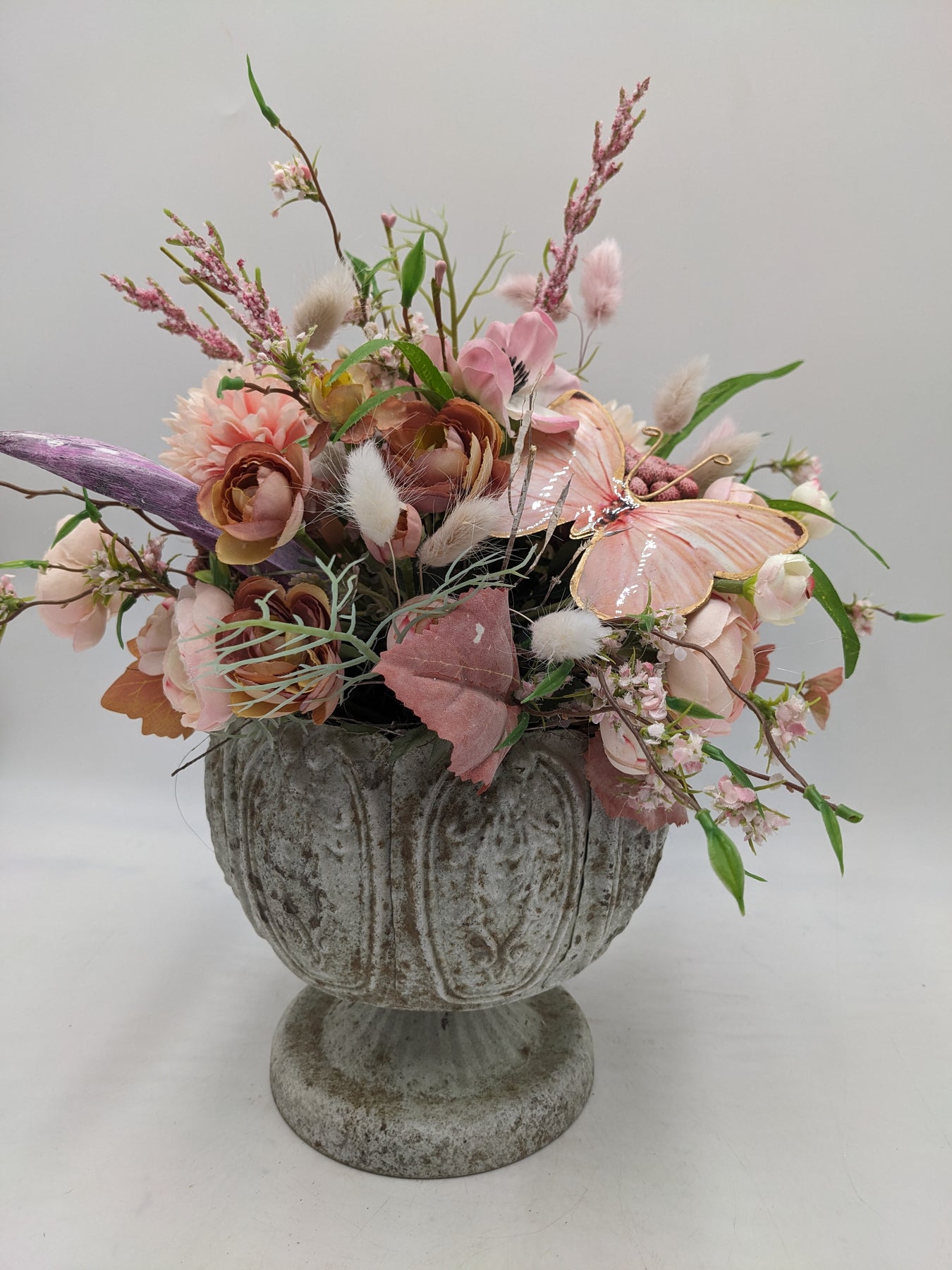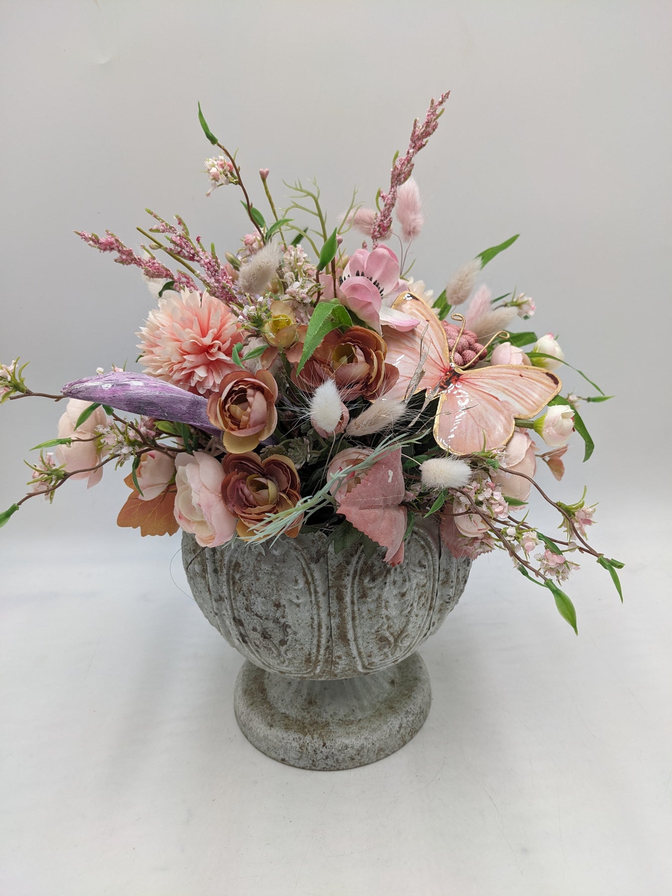 Tischgesteck im Pokal, Schmetterling, Ranunkeln, Anemonen, Blätter und Gräser, Farbe: rosa, apricot, Höhe: ca. 32 cm, Durchmesser: ca. 18 cm, 3693-2025