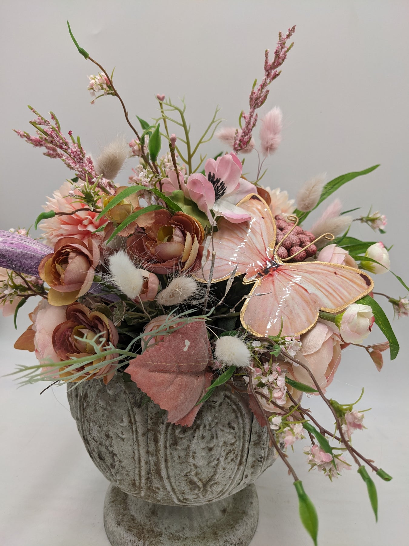 Frühlingsgesteck Schmetterling Ranunkel Anemone rosa