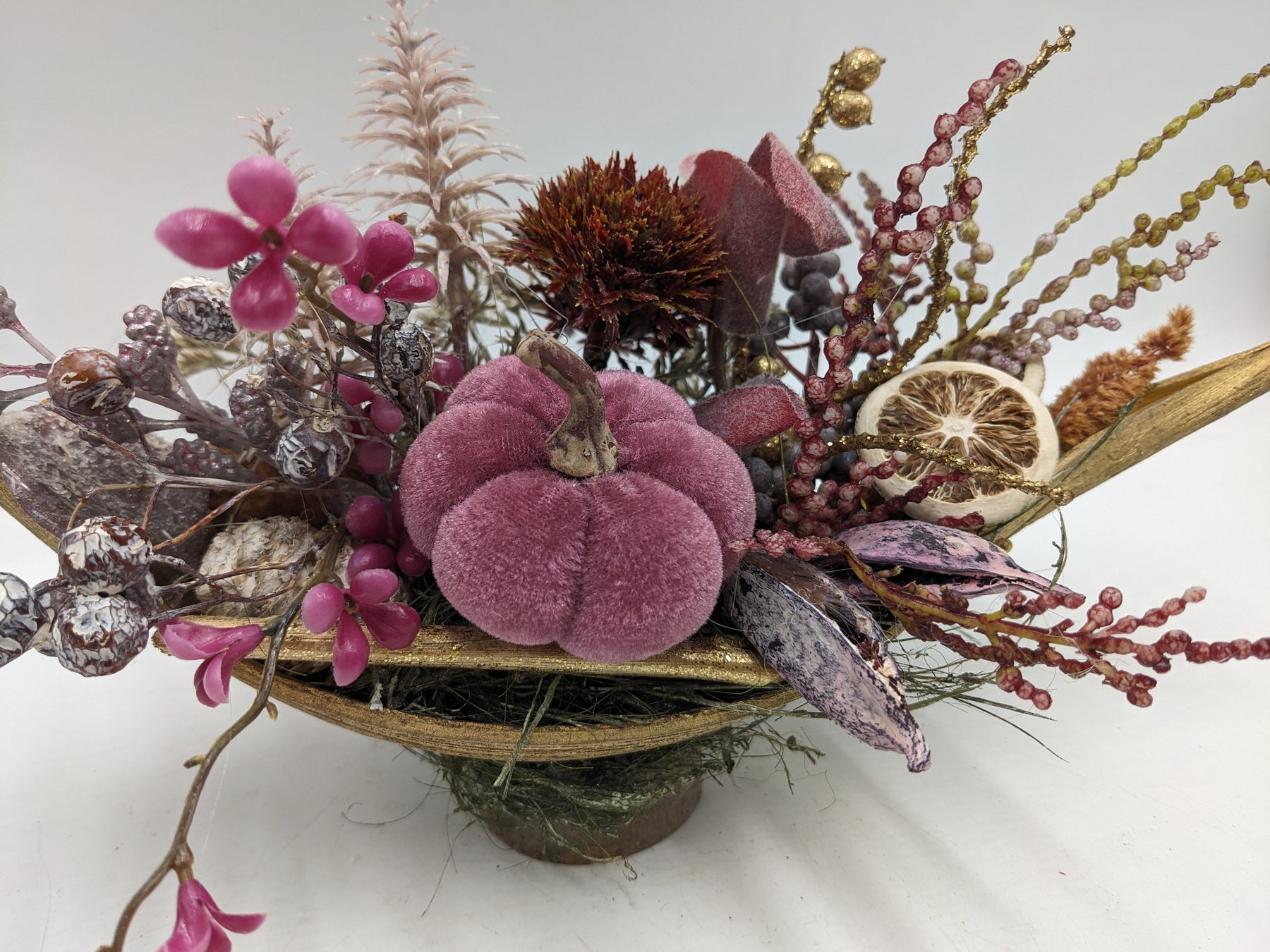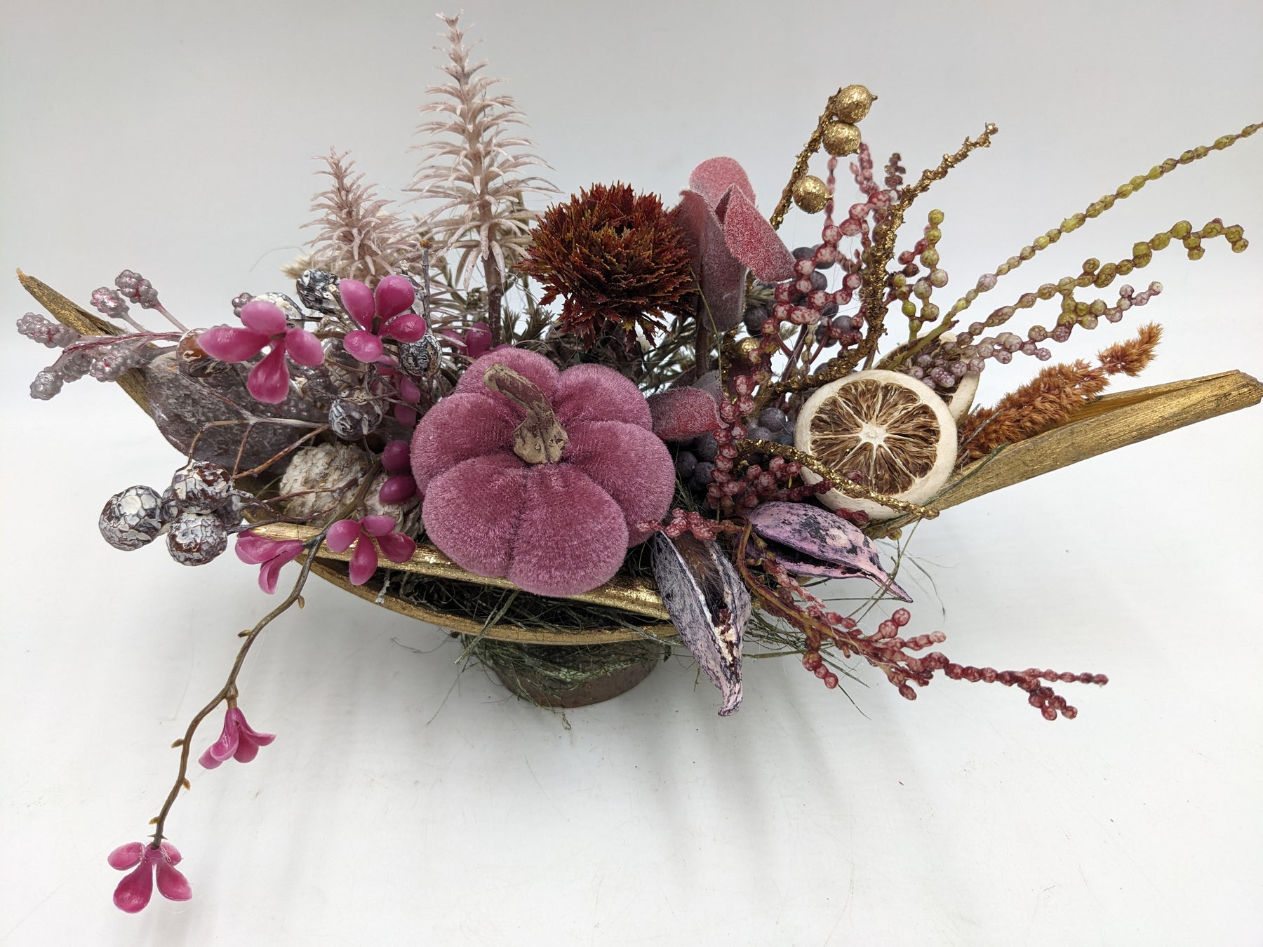 Tischgesteck im Schiffchen, Kürbis, Orangenscheibe, Blüten, Beiwerk, Beeren und Gräser, Farbe: lila, natur, Höhe: ca. 15 cm, Breite: ca. 27 cm, 3850-2025