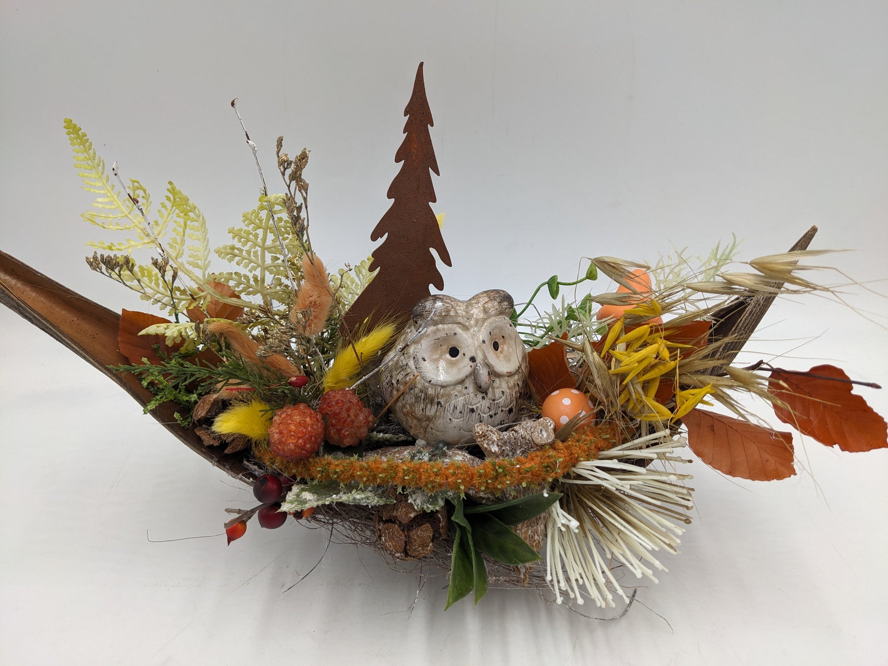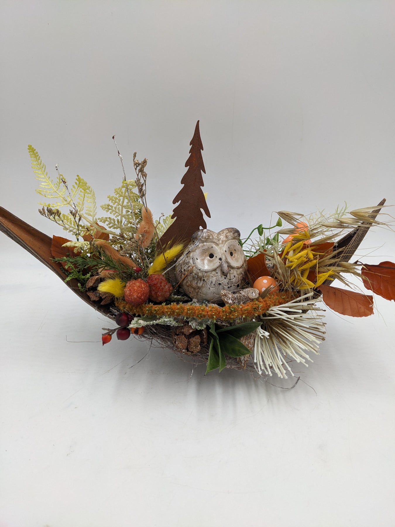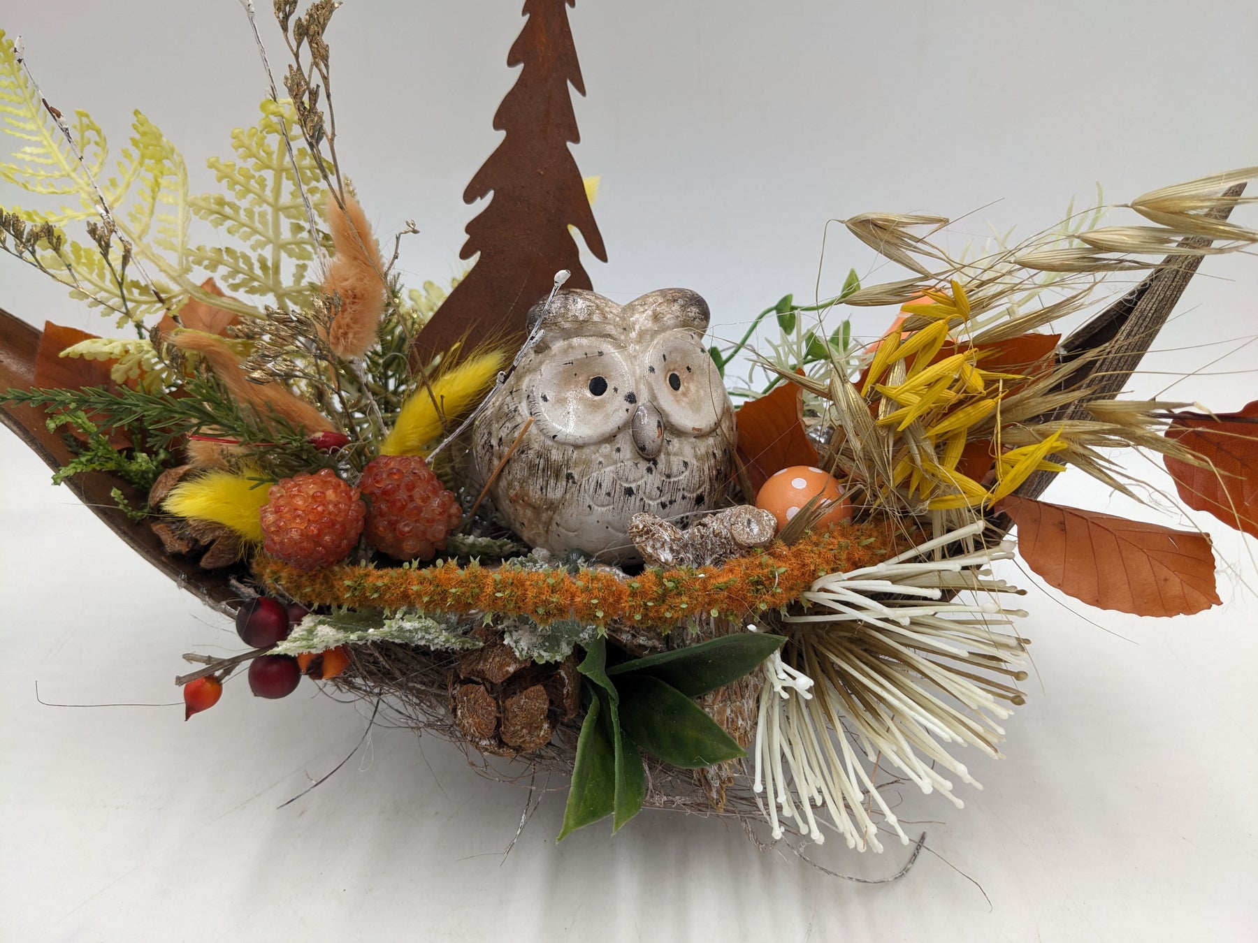 Tischgesteck im Schiffchen, Eule, Rosttanne, Zapfen, Spider, Beeren und Gräser, Farbe: orange, gelb, Höhe: ca. 22 cm, Breite: ca. 34 cm, 3791-2025