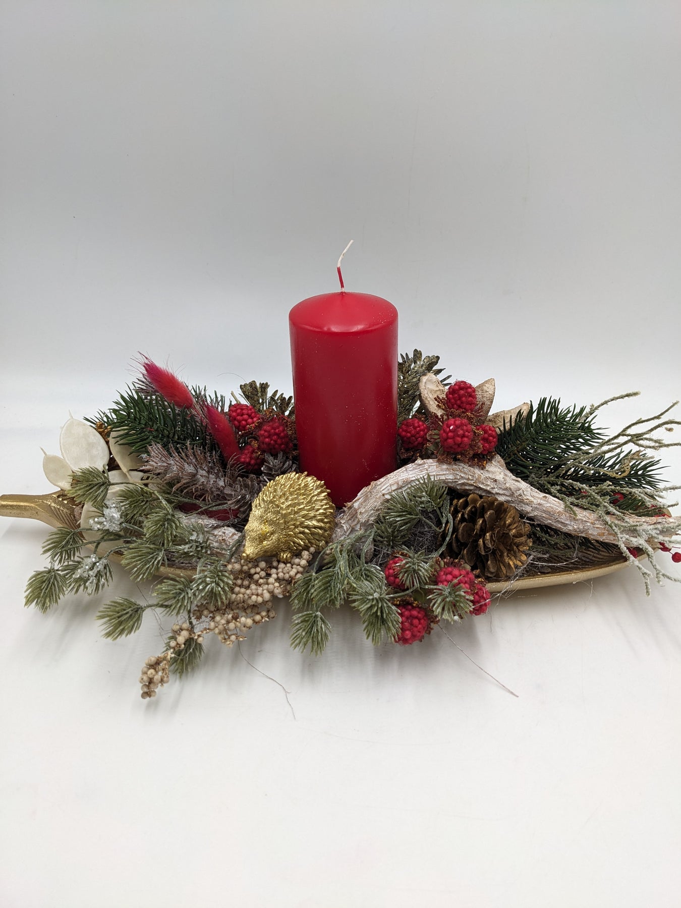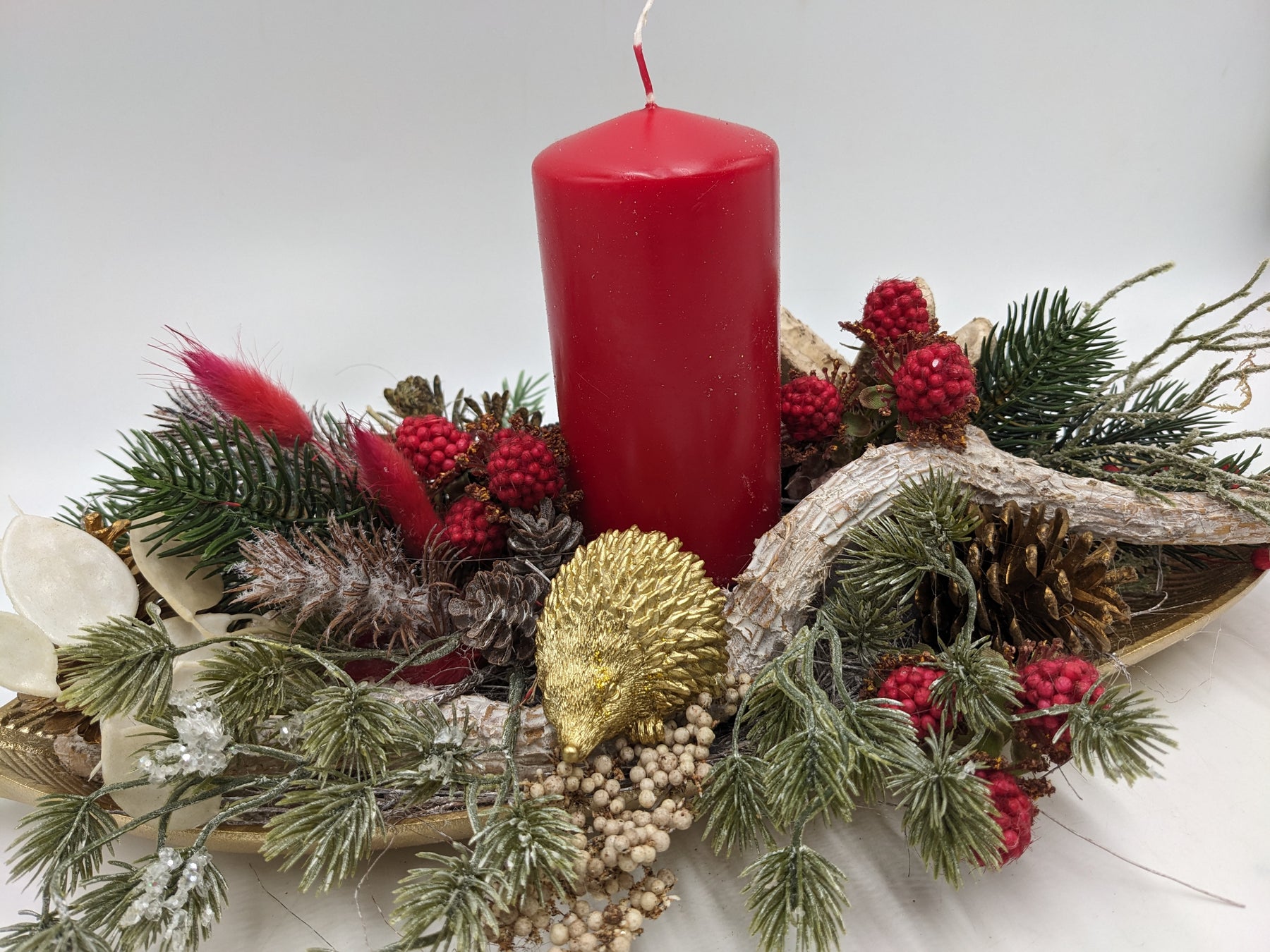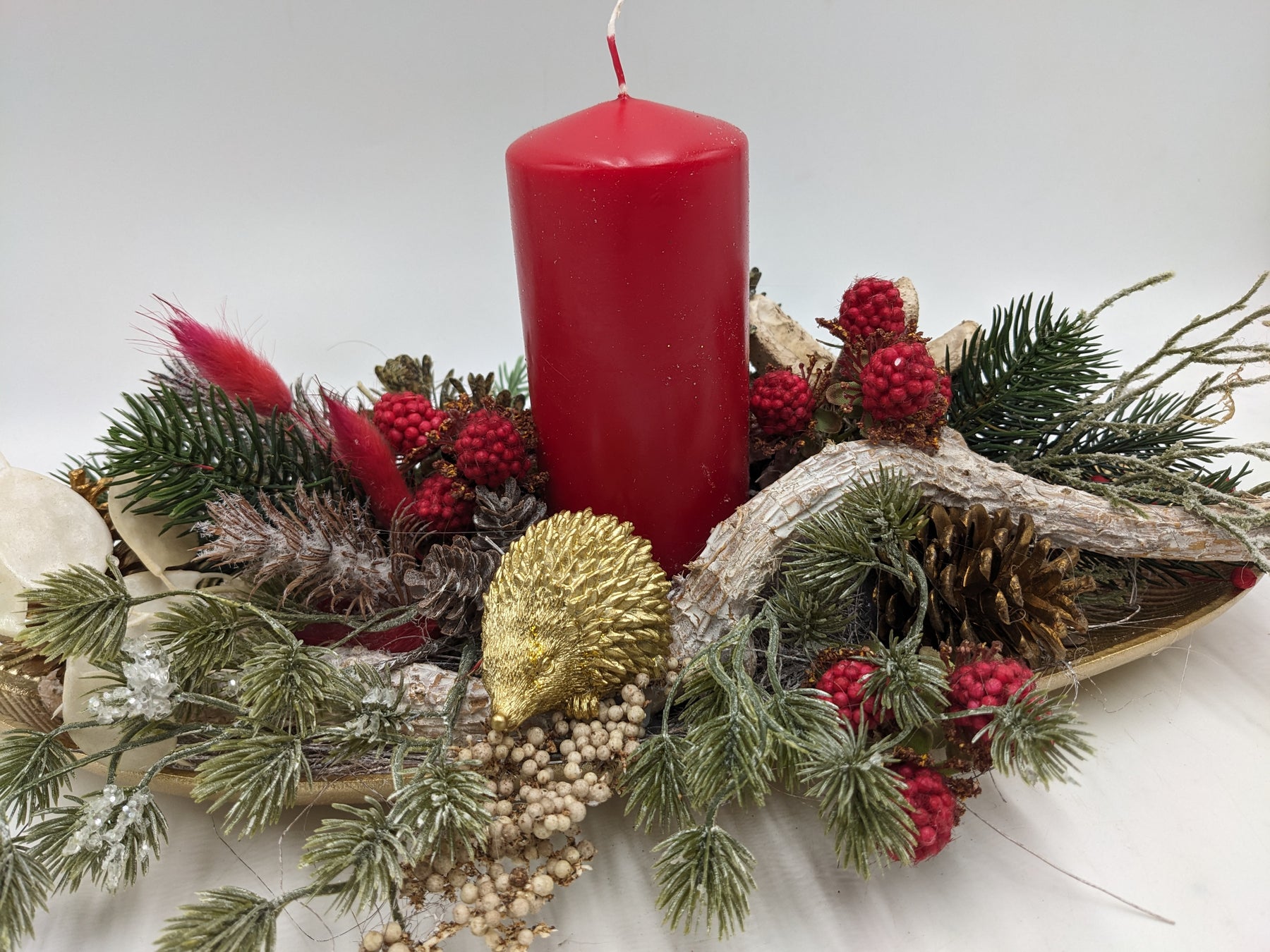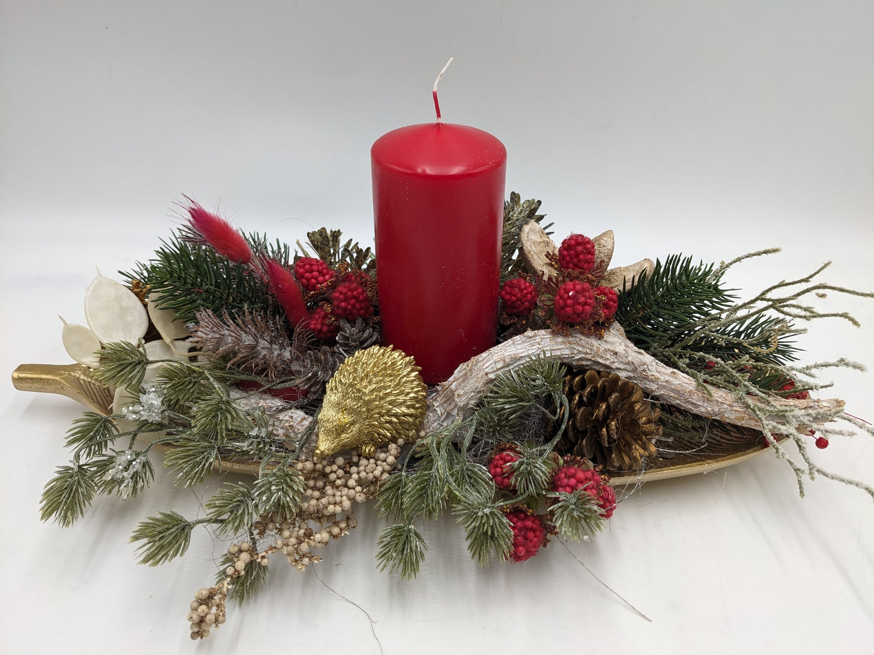 Tischgesteck in Schale mit Kerze, Igel, Beeren, Geäst, Zapfen, Gräser und Tanne, Farbe: rot, gold, Höhe: ca. 17 cm, Breite: ca. 40 cm, 3767-2025