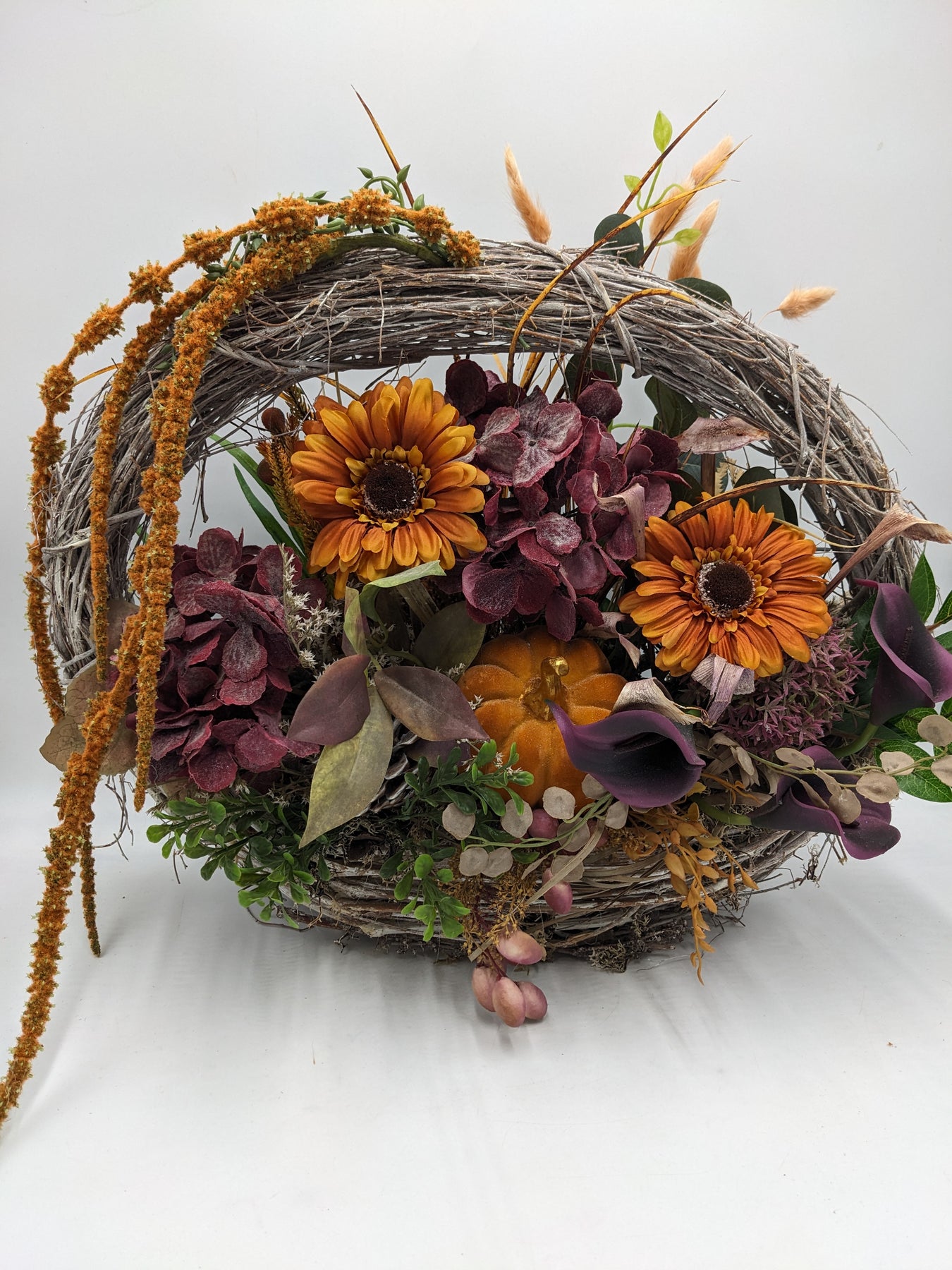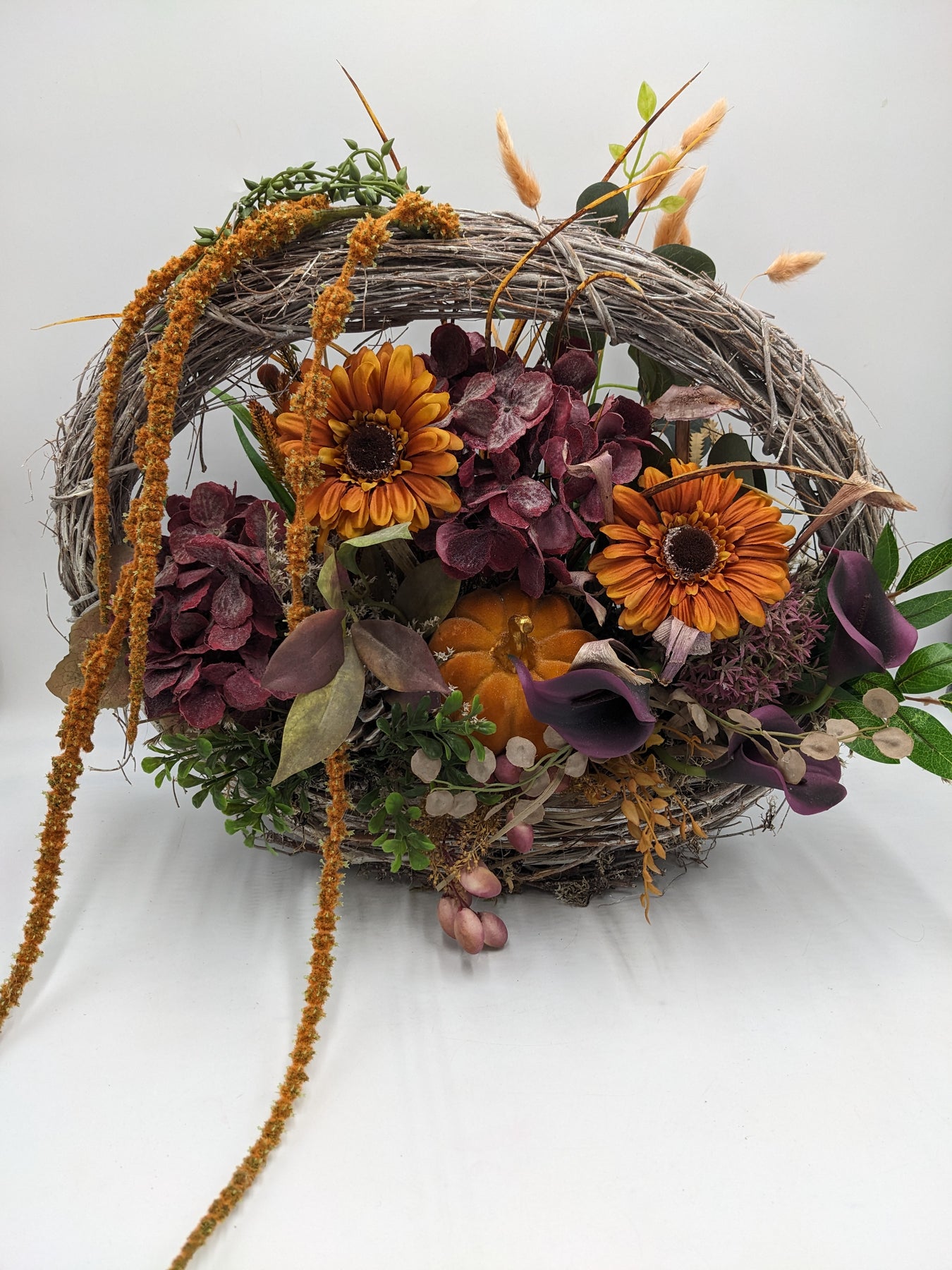 Tischgesteck im Schiffchen, Kürbis, Gerbera, Hortensien, Calla, Allium, Beeren und Gräser, Farbe: orange, lila, Höhe: ca. 43 cm, Breite: ca. 48 cm, 3678-2025