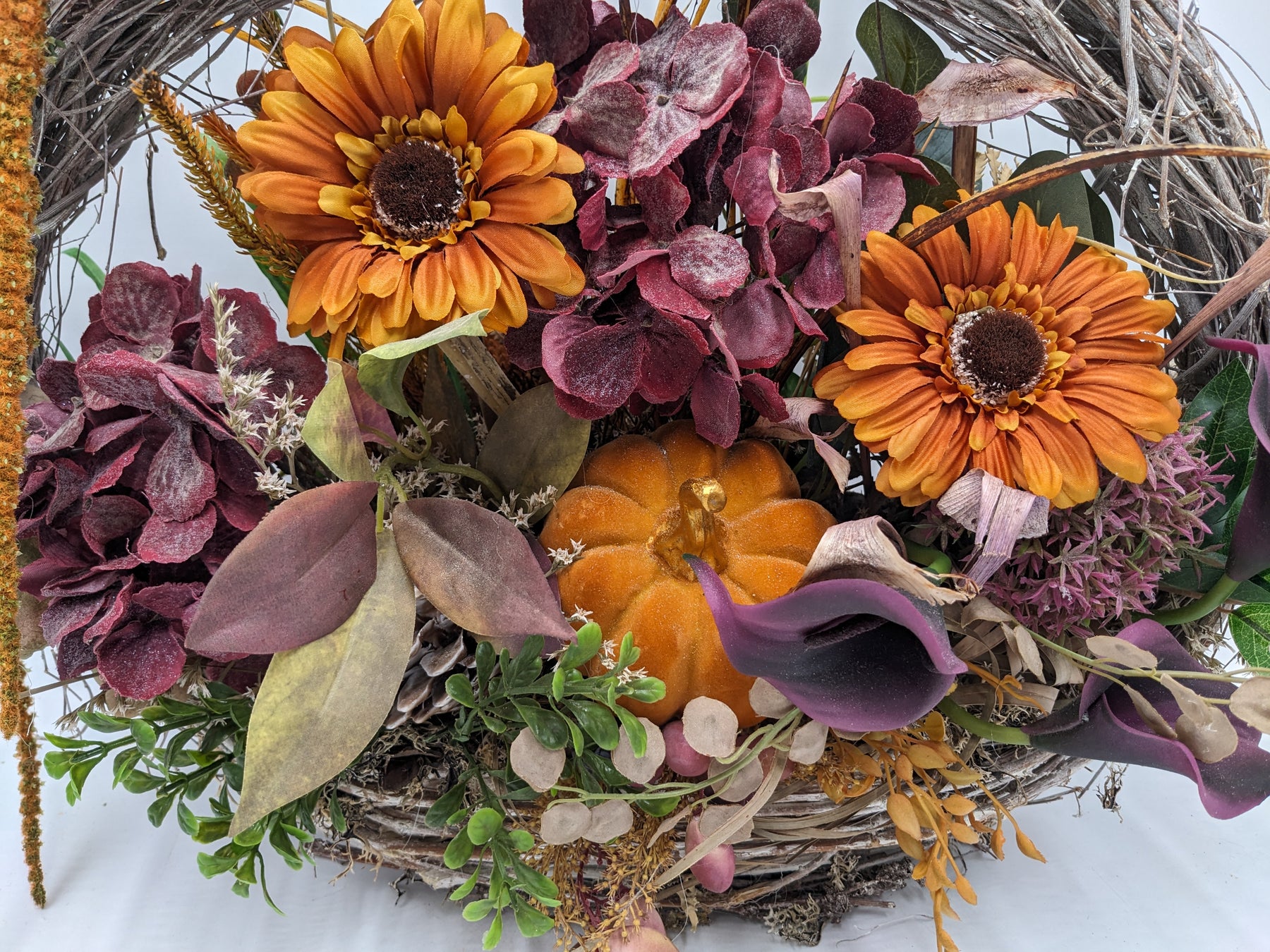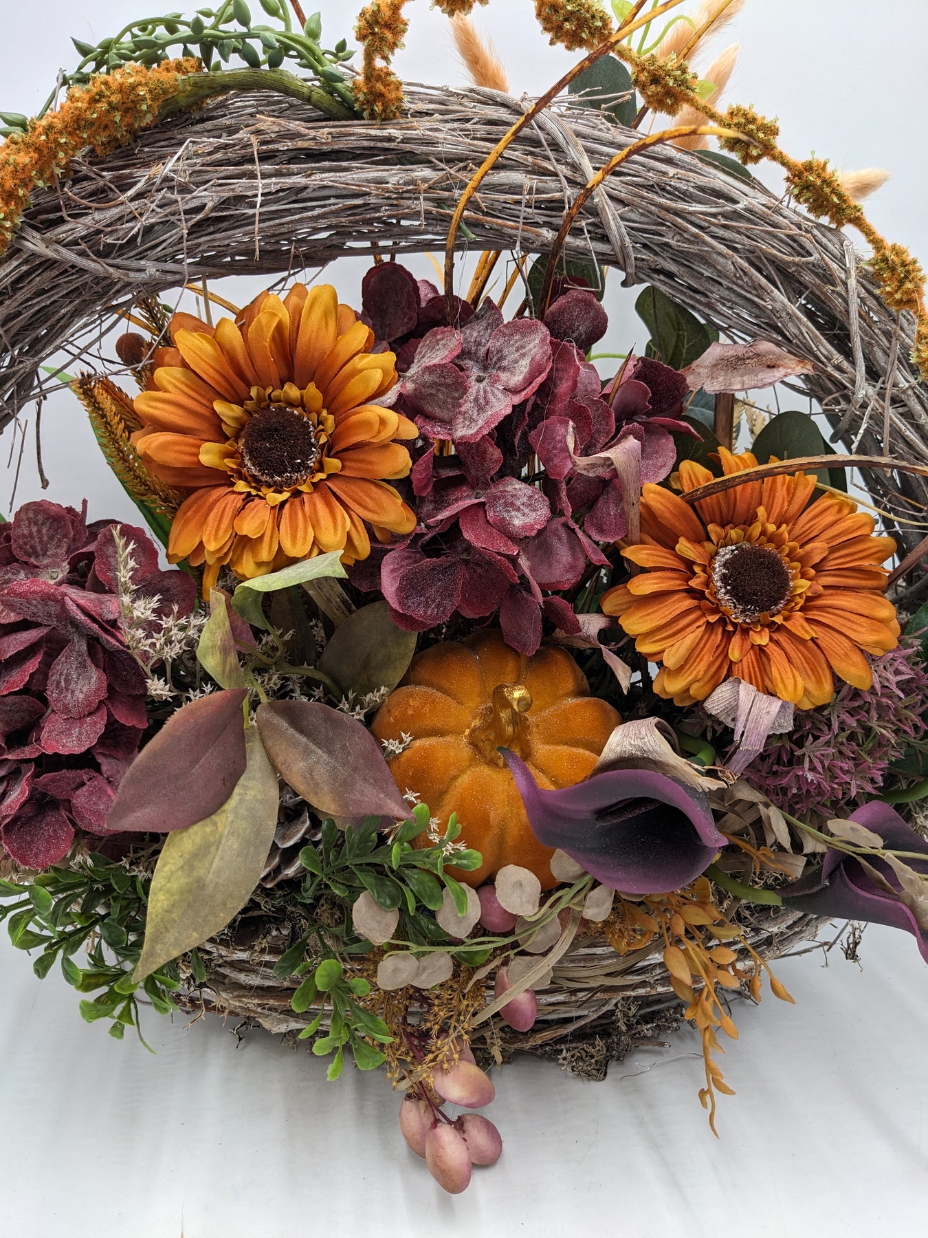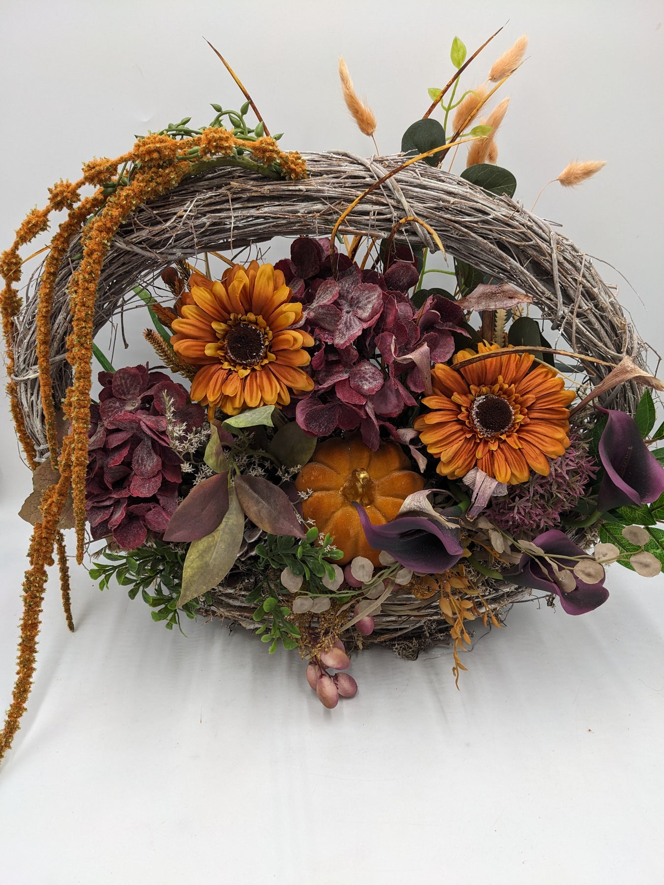 Herbstgesteck Kürbis Gerbera Hortensie orange