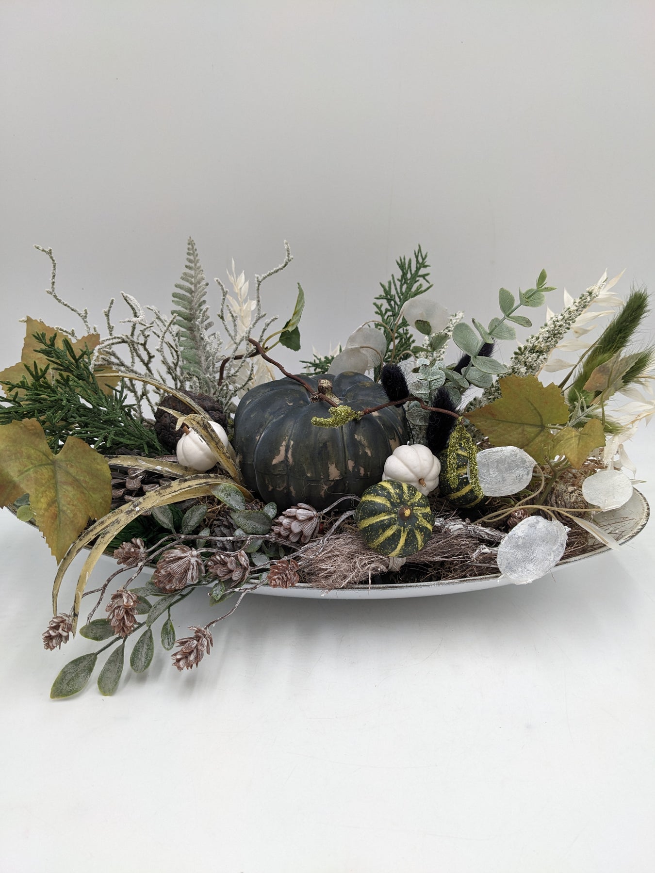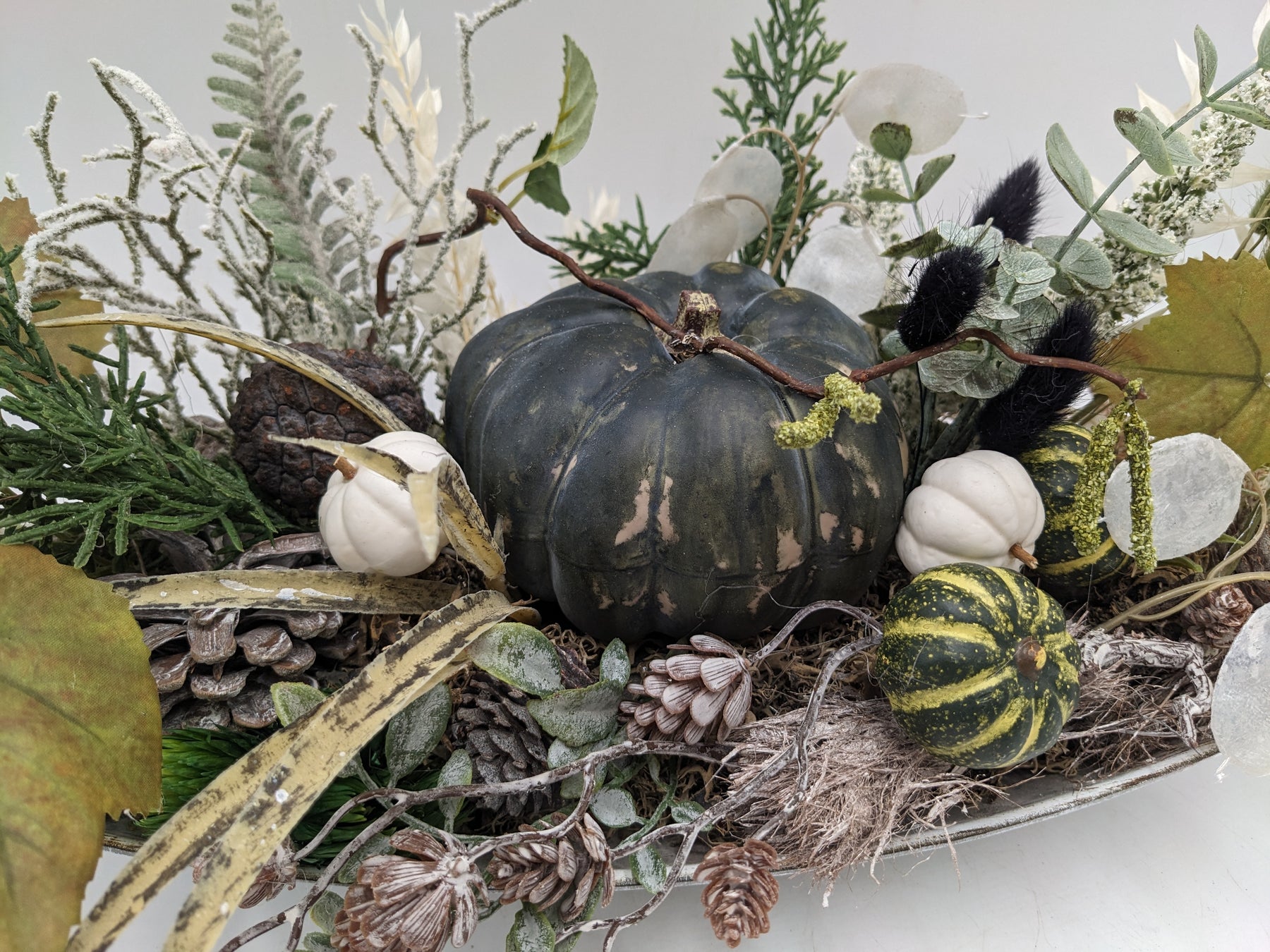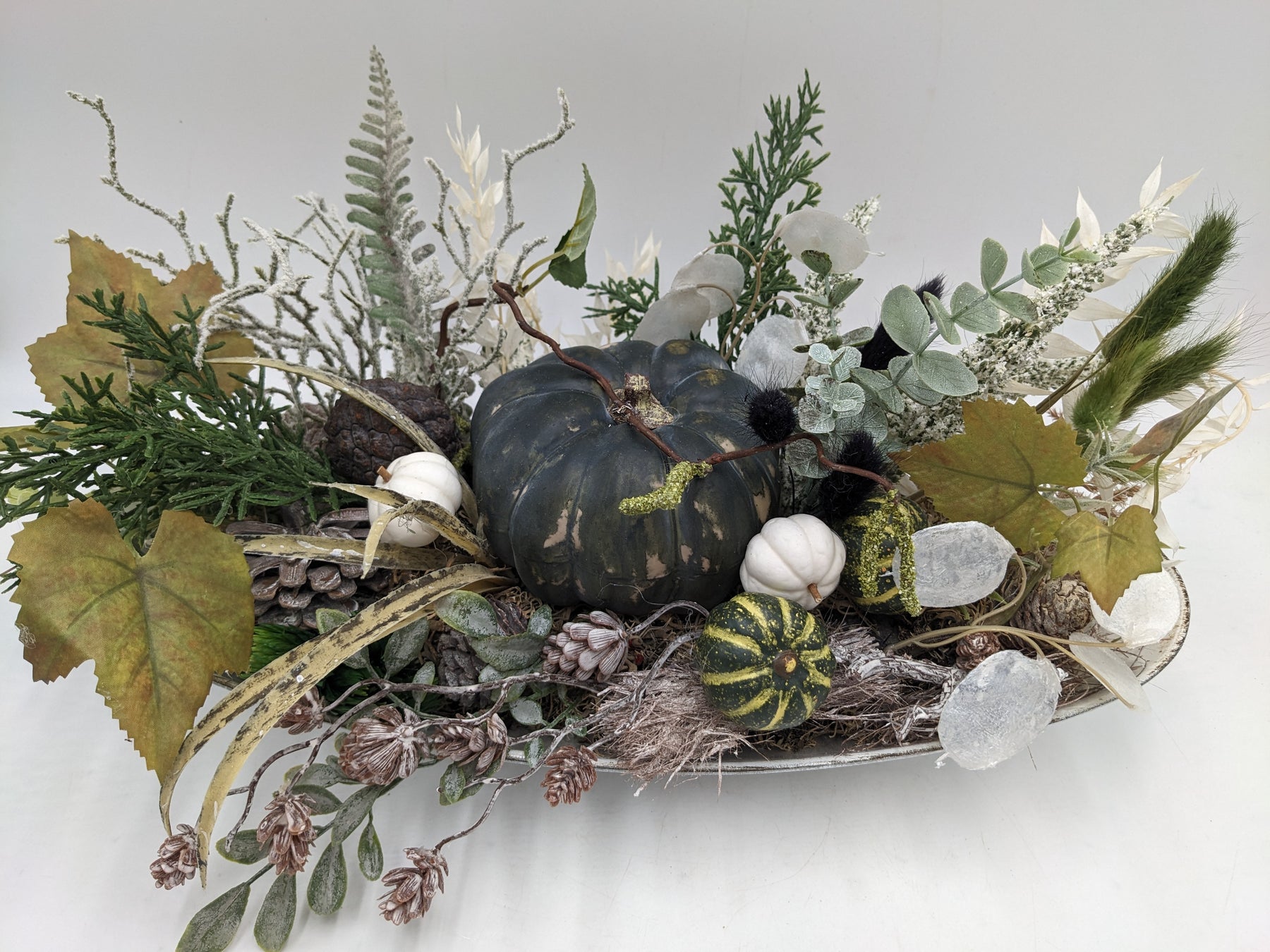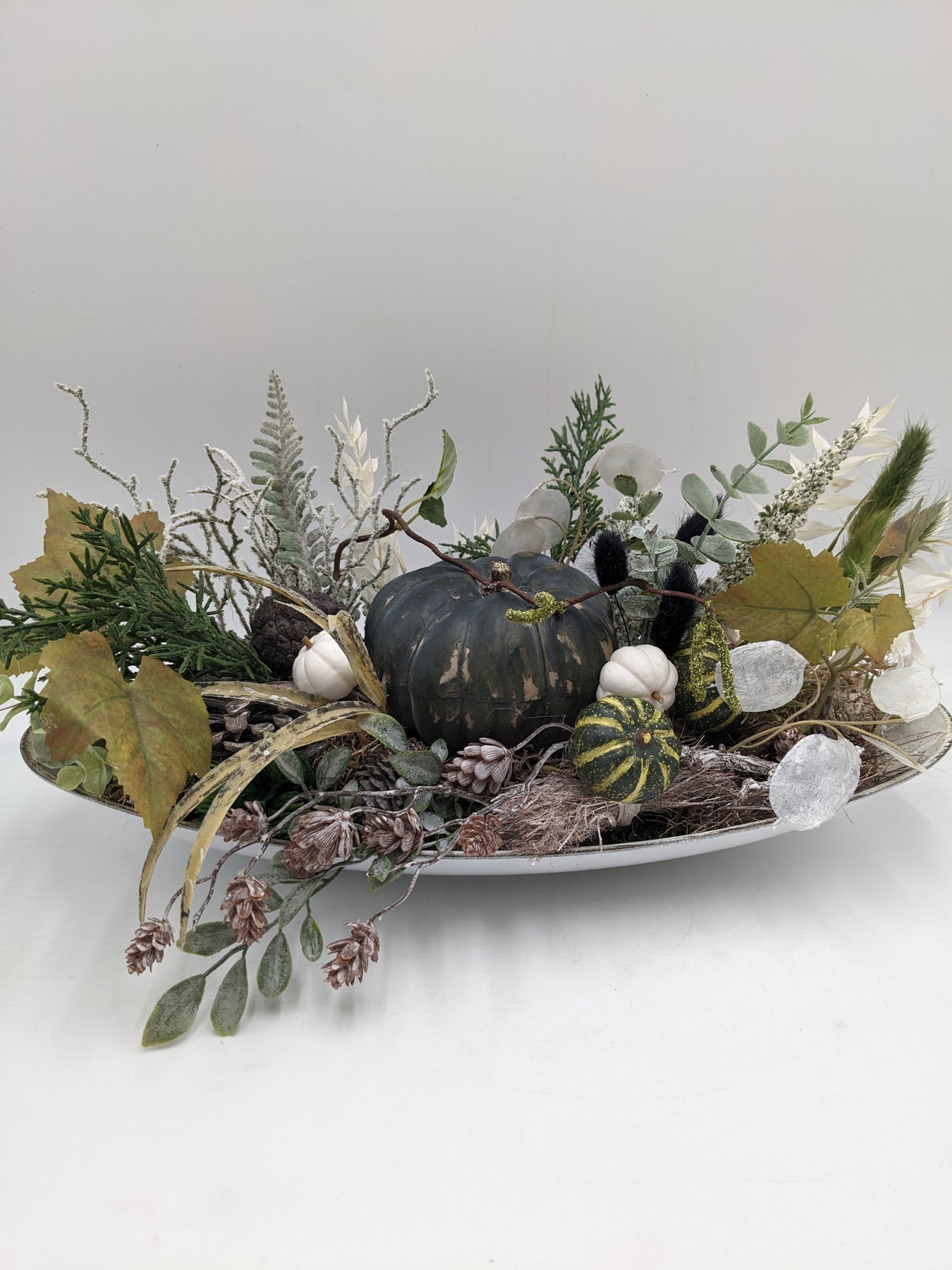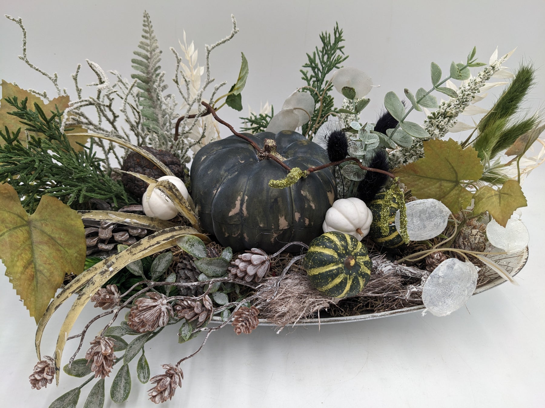 Tischgesteck in Schale, Kürbisse, Zapfen, Eukalypthus und Gräser, Farbe: grün, weiß, Höhe: ca. 20 cm, Breite: ca. 40 cm, 3675-2025
