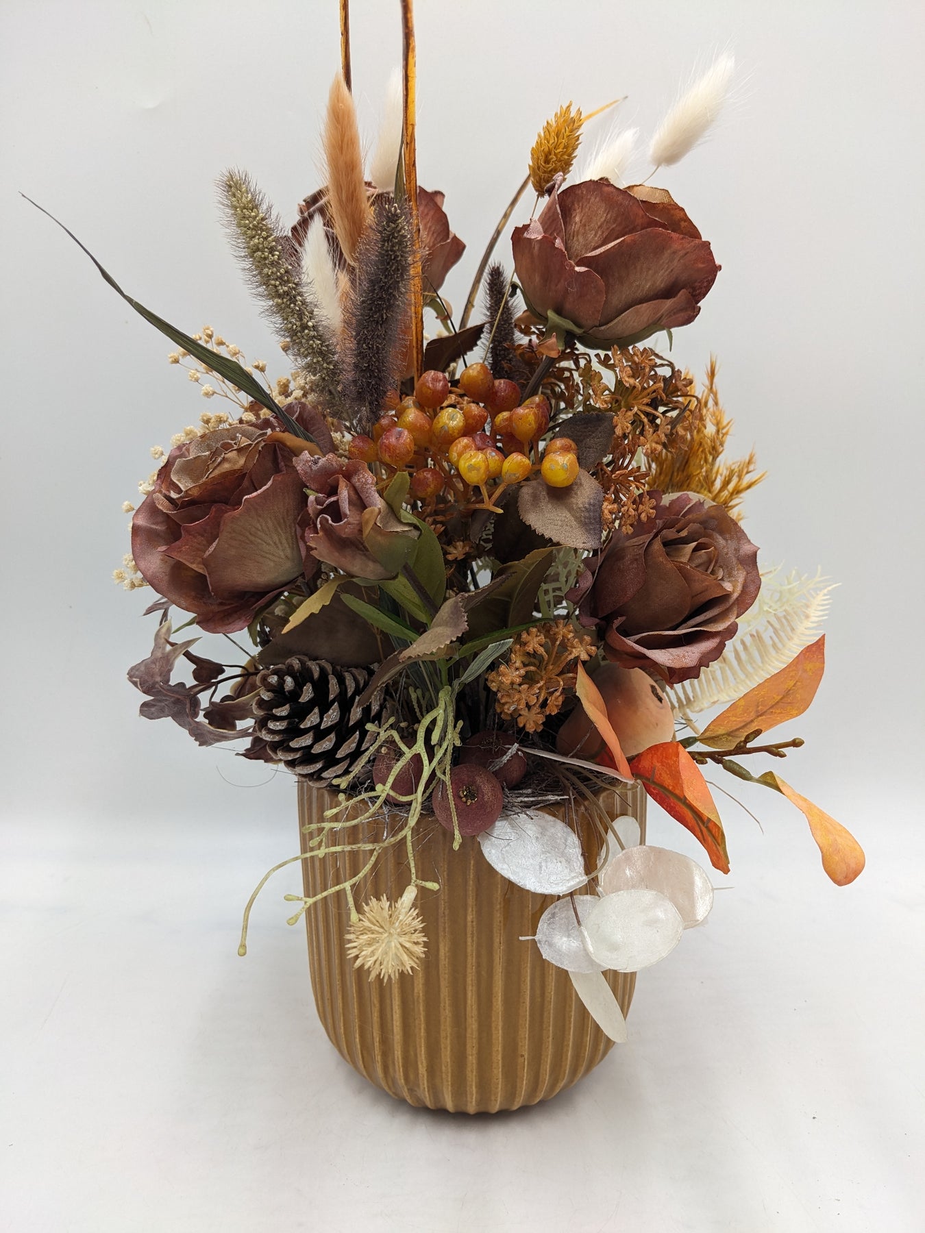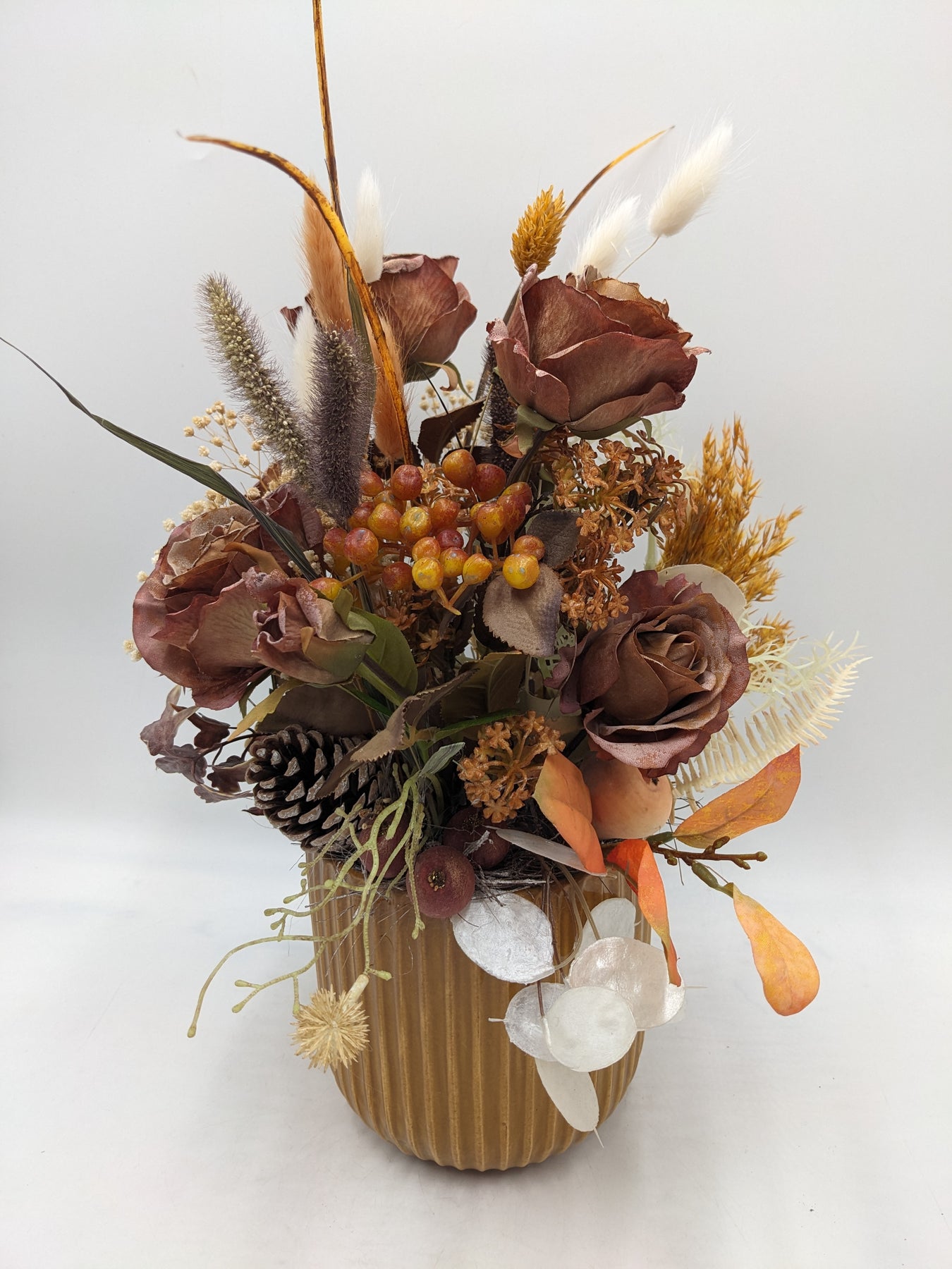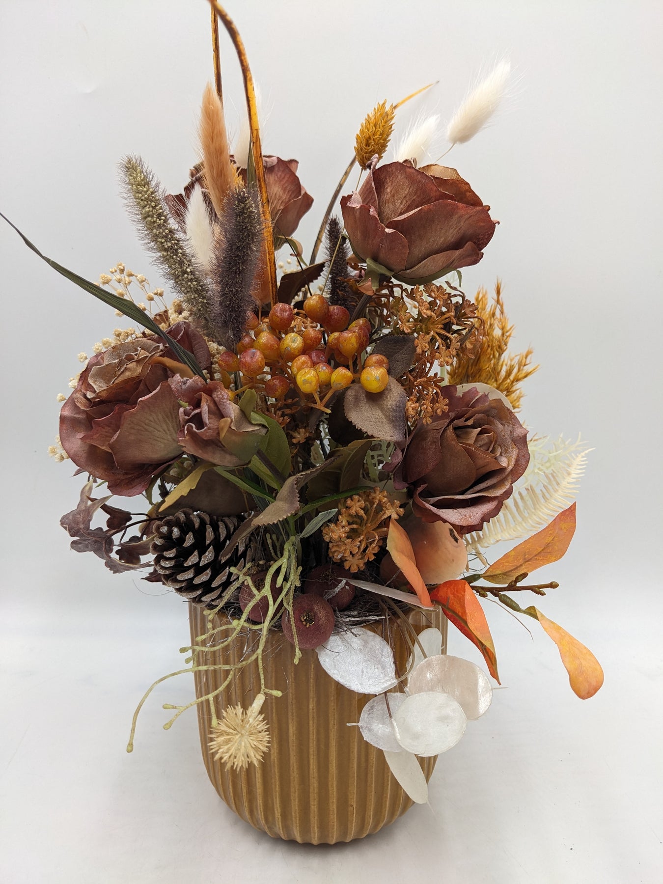Tischgesteck im Topf, Rosen, Zapfen, Beeren und Gräser, Farbe: orange, occer, Höhe: ca. 38 cm, Durchmesser: ca. 14 cm, 3698-2025