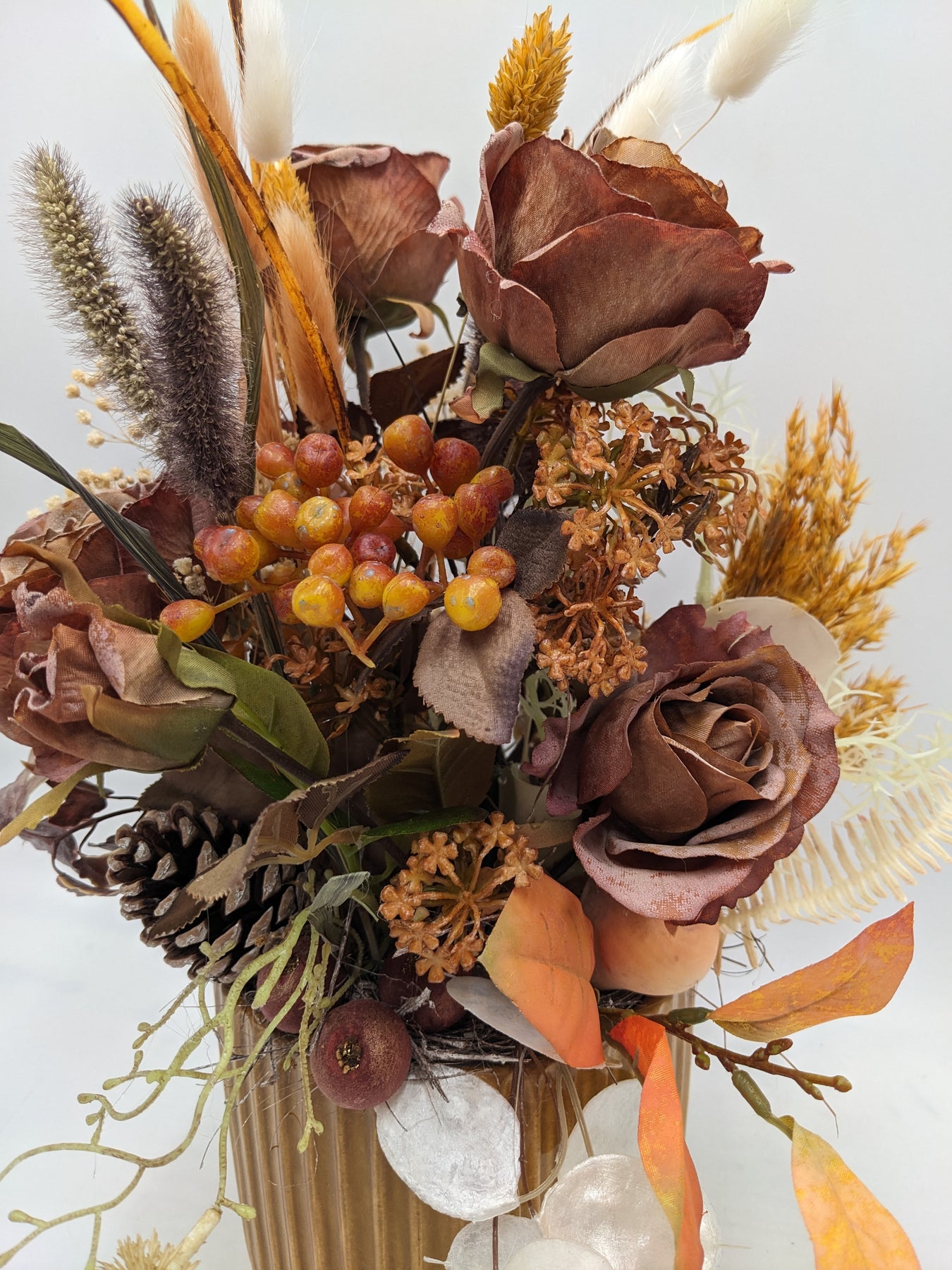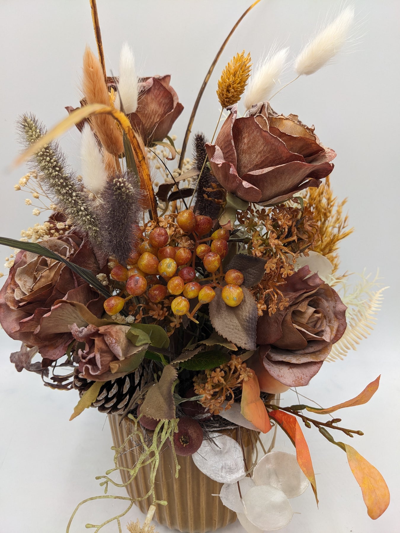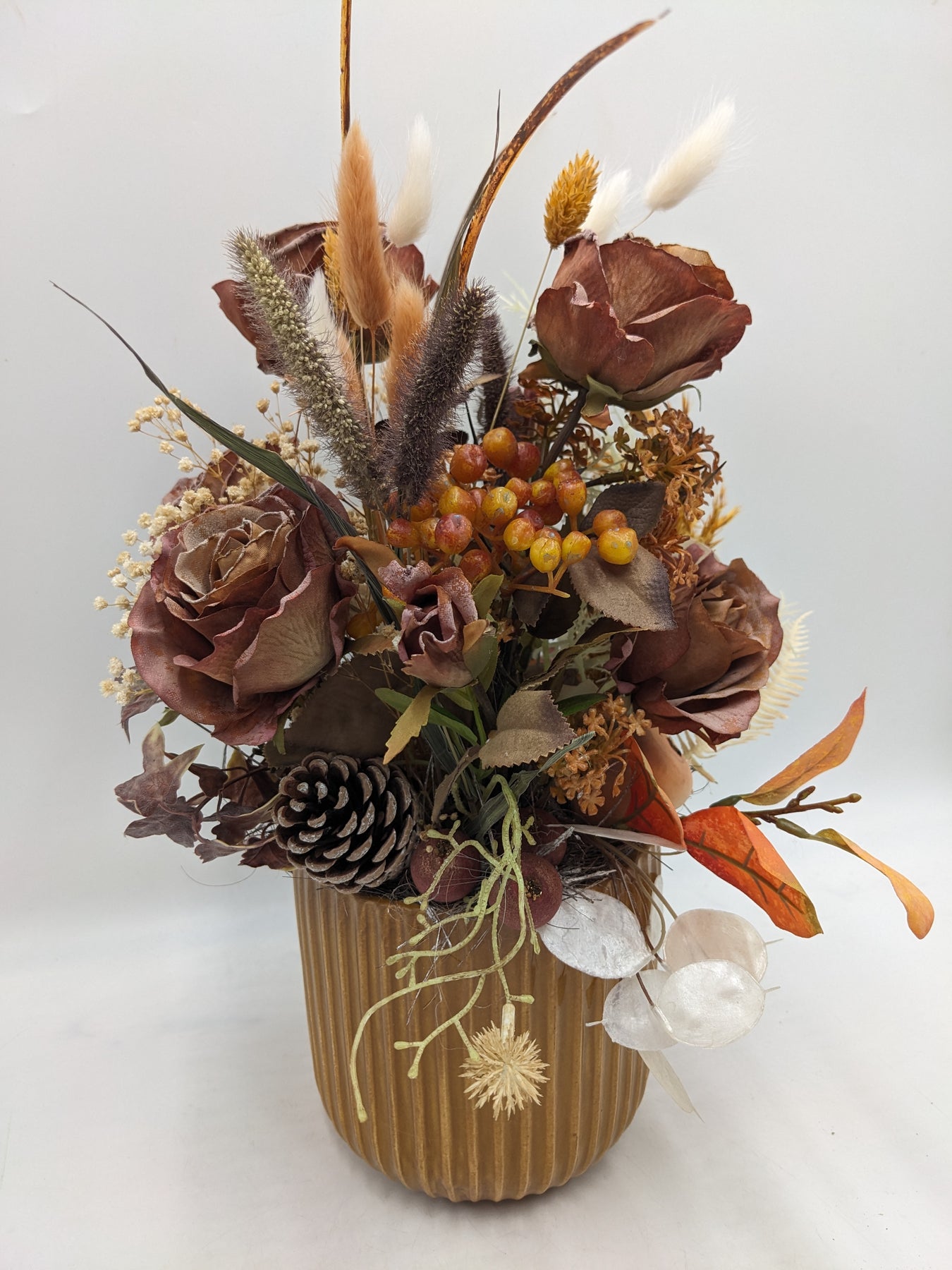 Tischgesteck im Topf, Rosen, Zapfen, Beeren und Gräser, Farbe: orange, occer, Höhe: ca. 38 cm, Durchmesser: ca. 14 cm, 3698-2025