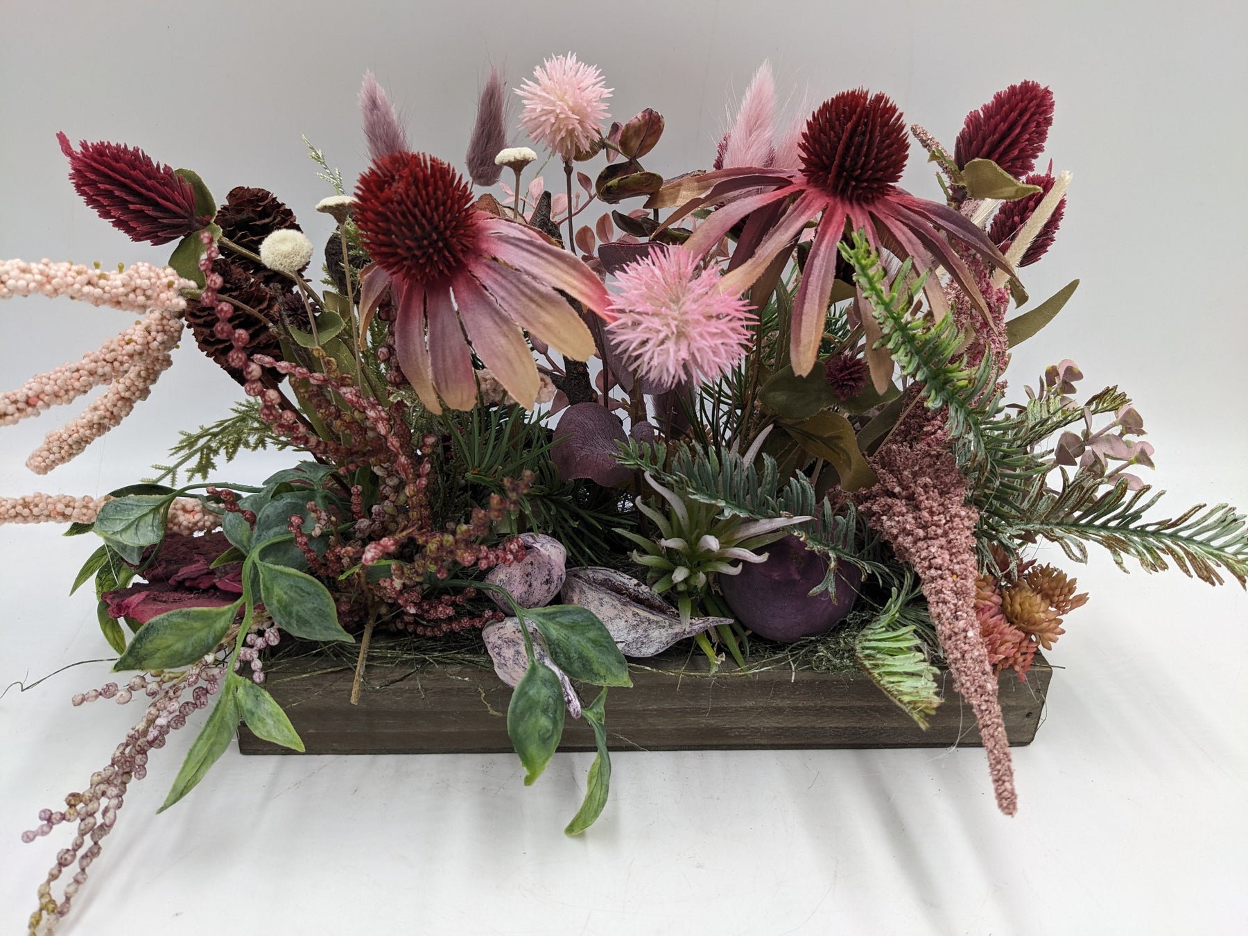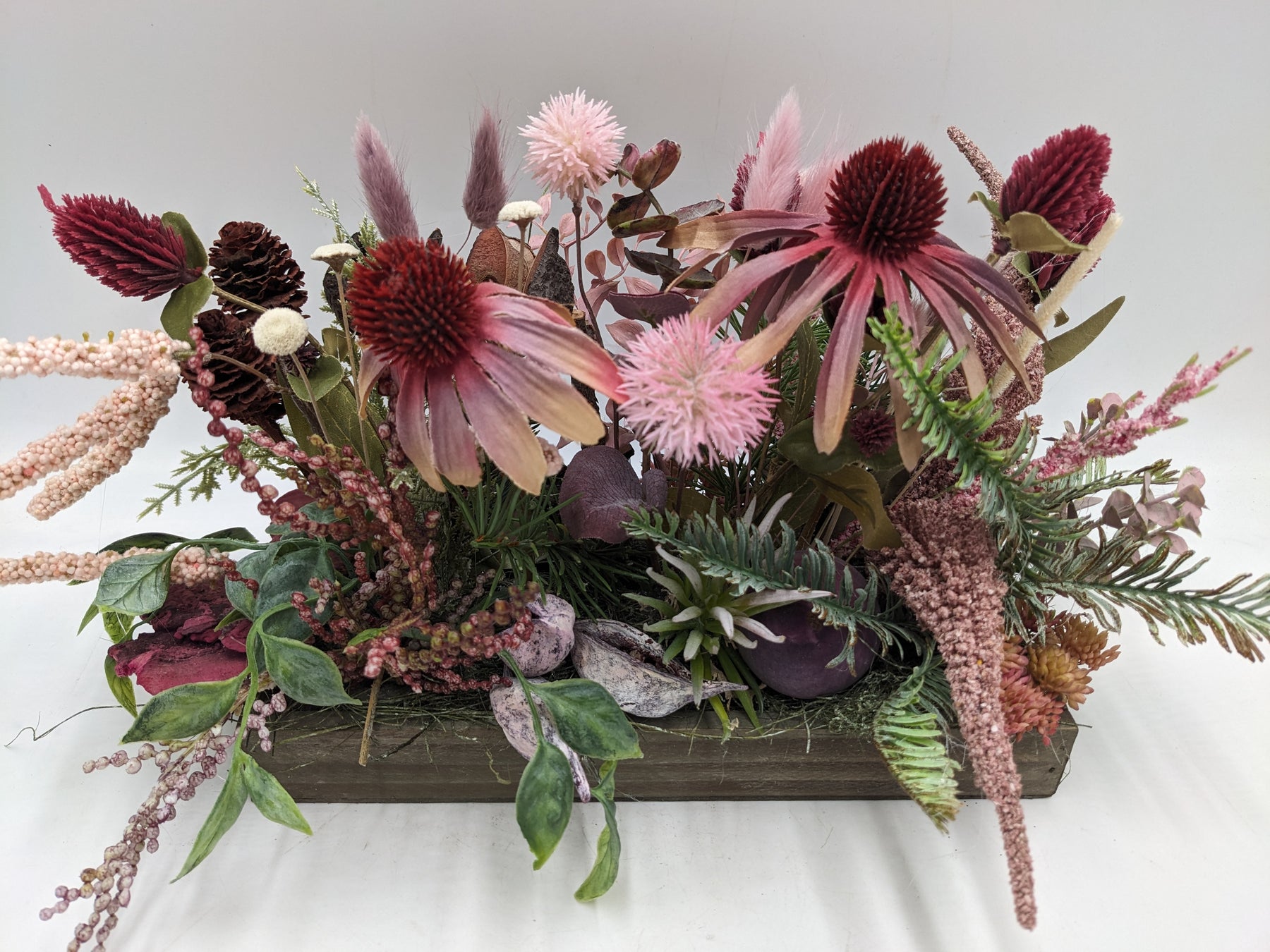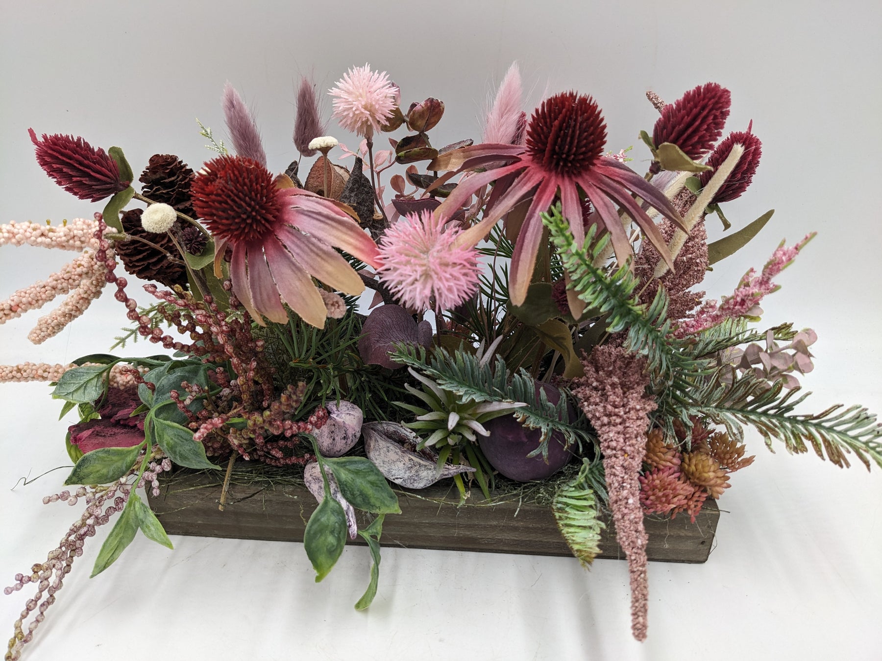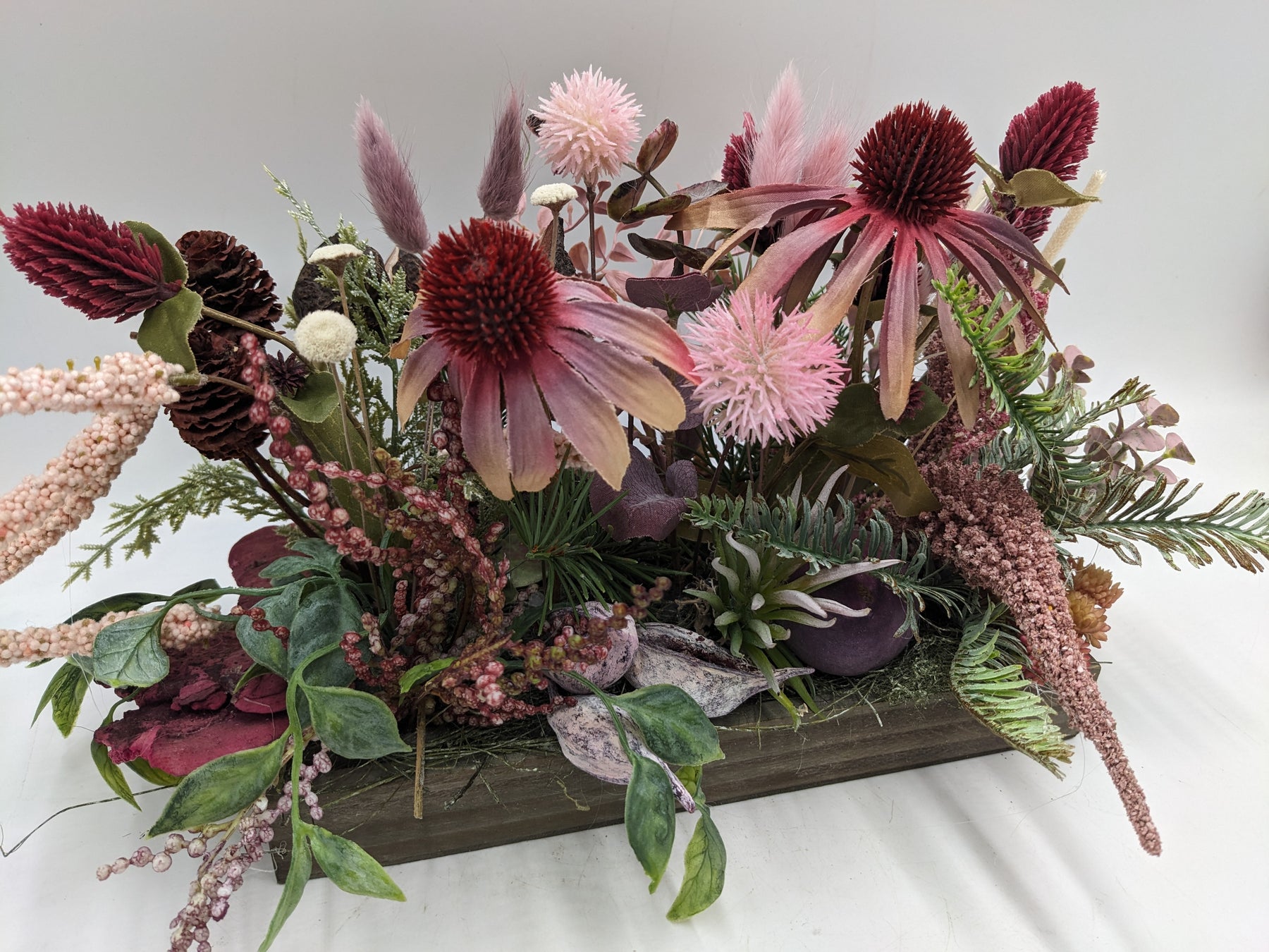 Tischgesteck im Tablett, Sonnenhut, Zapfen, Beiwerk, Beeren, Heide und Gräser, Farbe: rosa, dunkelrot, Höhe: ca. 20 cm, Breite: ca. 25 cm, Tiefe: ca. 10 cm, 3832-2025