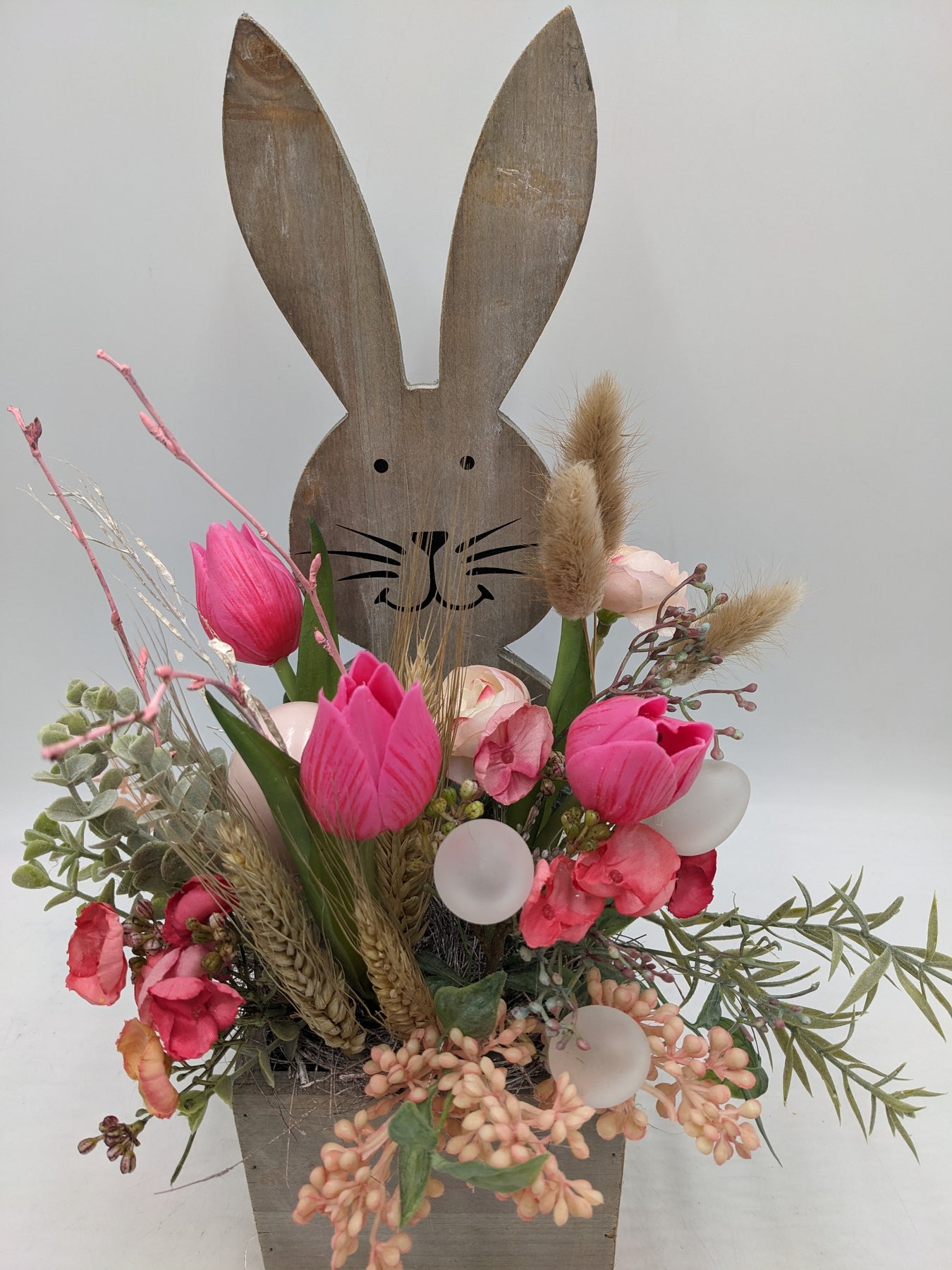 Ostergesteck Frühlingsgesteck Tulpen Gräser Eier rosa