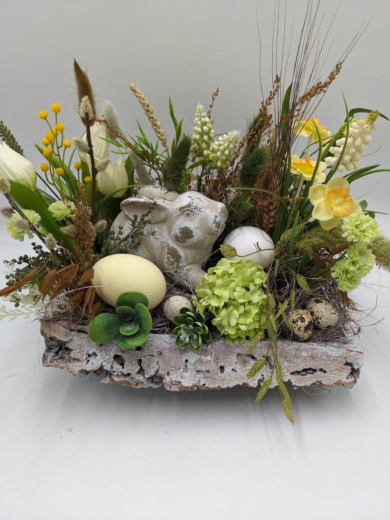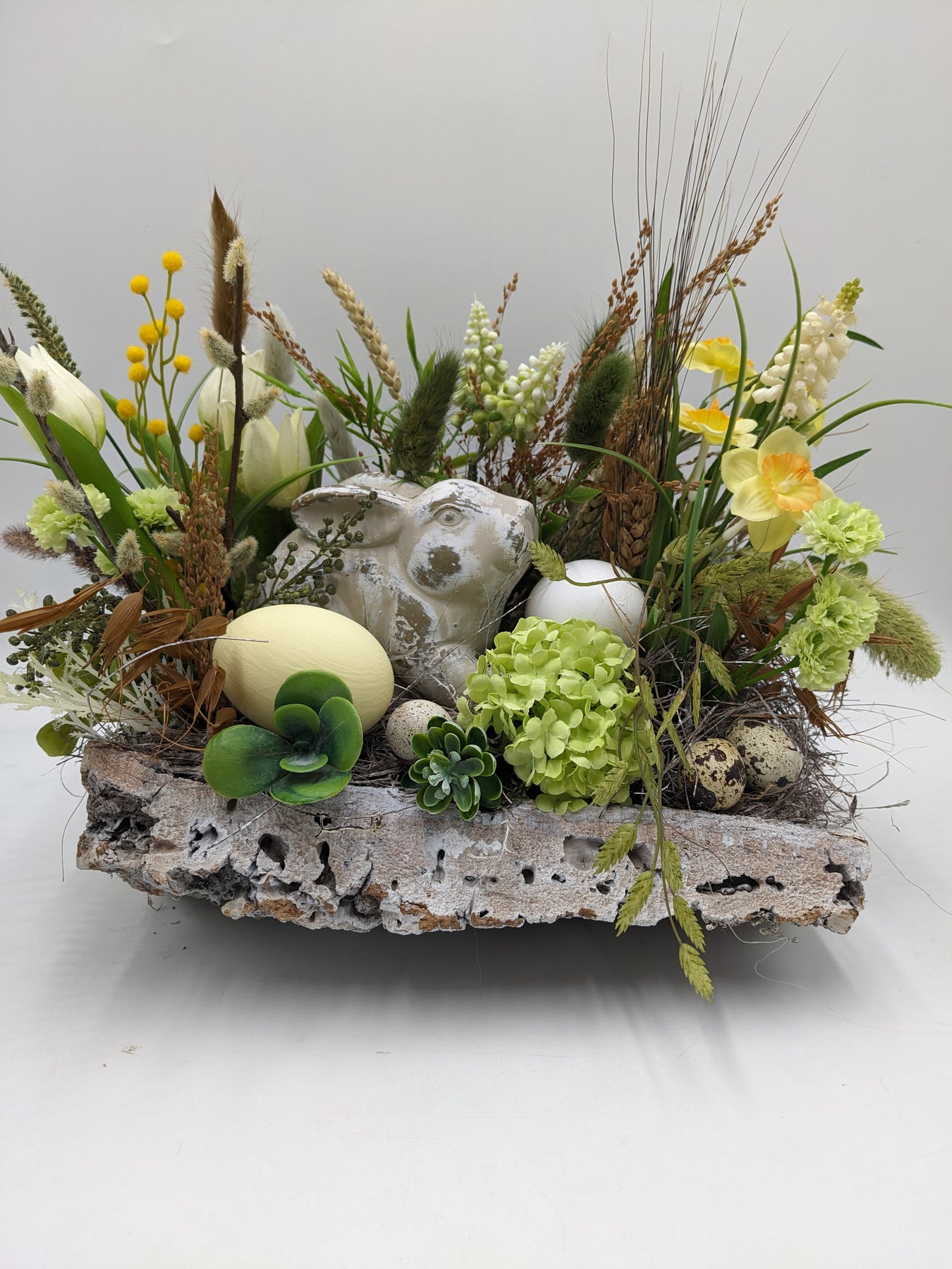 Tischgesteck im länglichen Rindengefäß, gestaltet mit Blüten, Tulpen, Hyazinthen, Sukkulenten, Gräsern, Zweigen, Beeren, Steinhase, Eiern und Naturmaterialien, Farbe: gelb, weiss, Höhe: ca. 28 cm, Breite: ca. 28 cm, Tiefe: ca. 26 cm, 4008-2026
