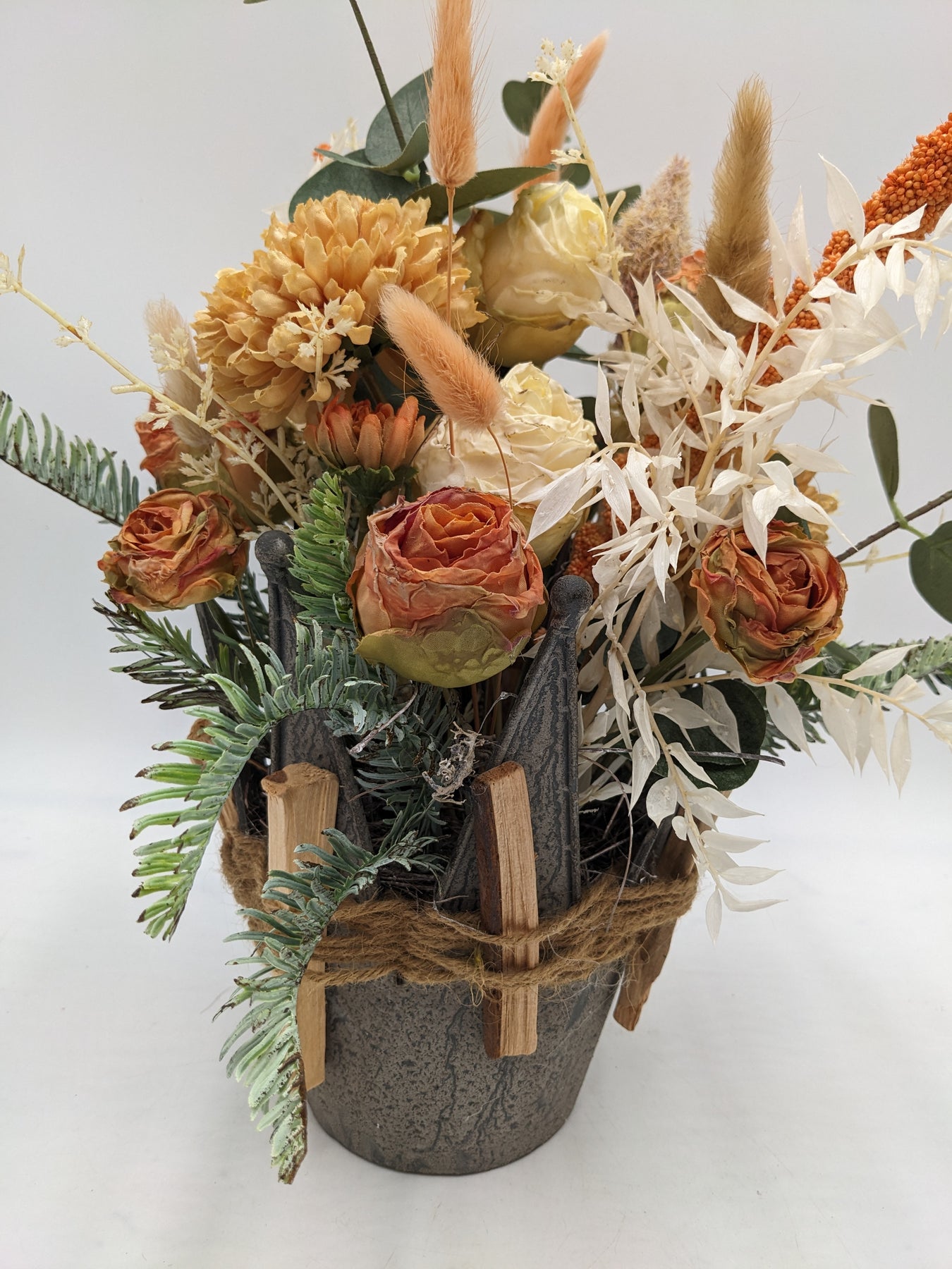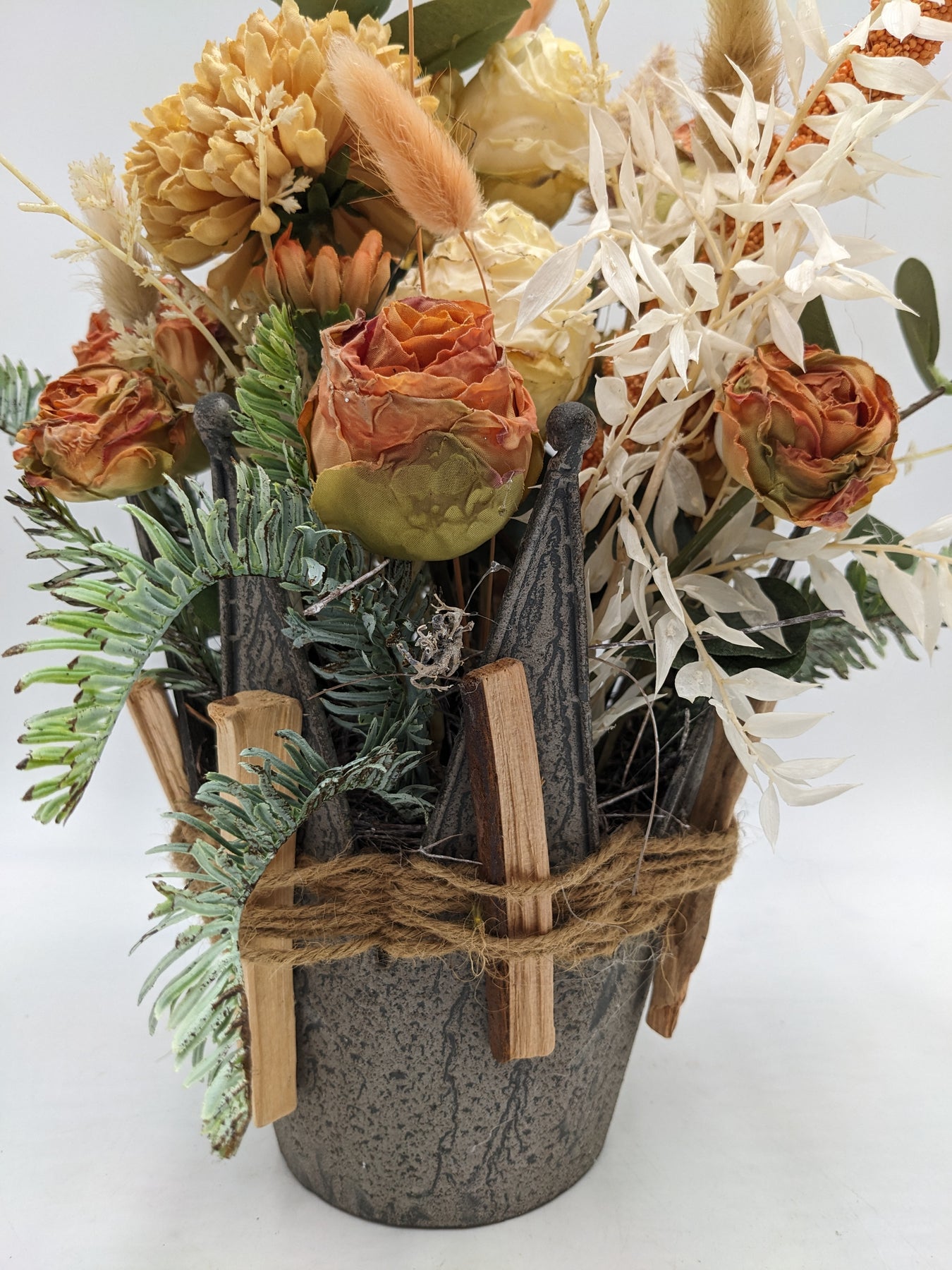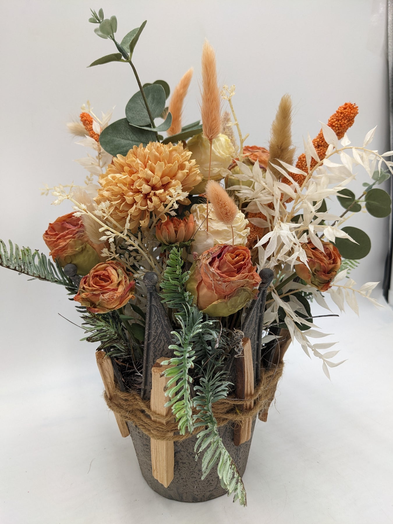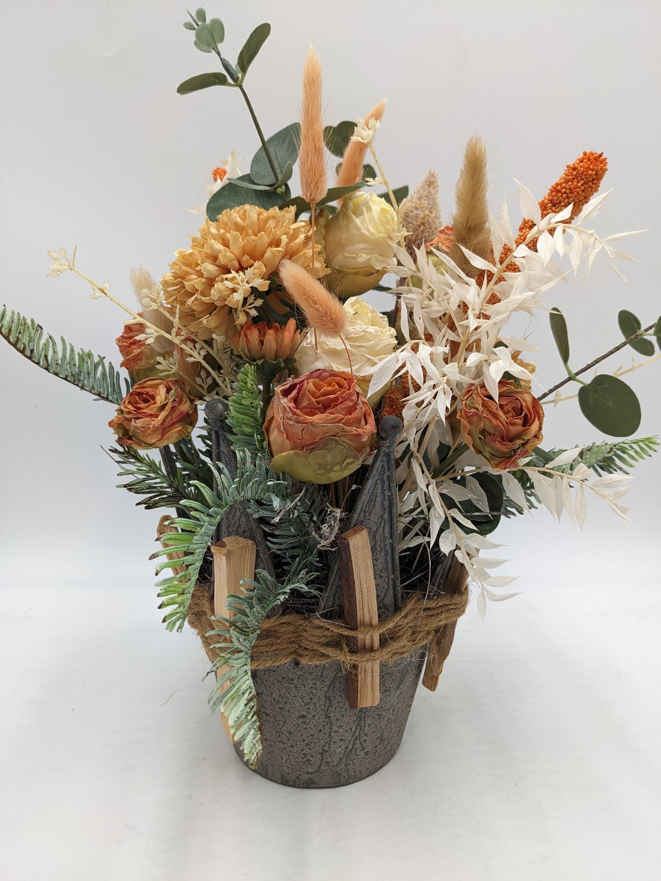 Tischgesteck im Kronentopf, Rosen, Eukalypthus, Gräser und Tanne, Farbe: orange, creme, natur, Höhe: ca. 35 cm, Durchmesser: ca. 17 cm, 3610-2025