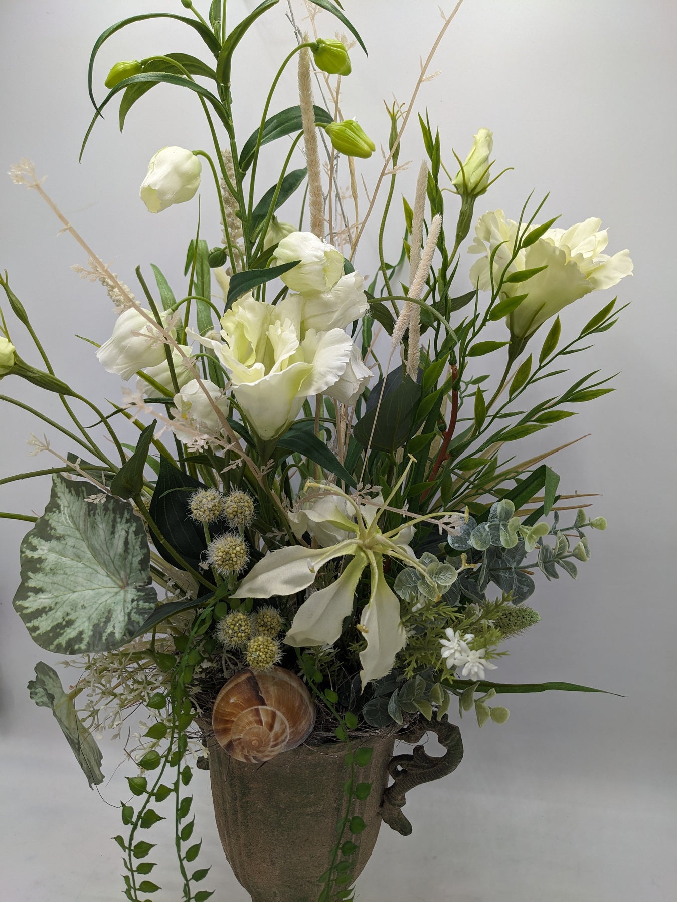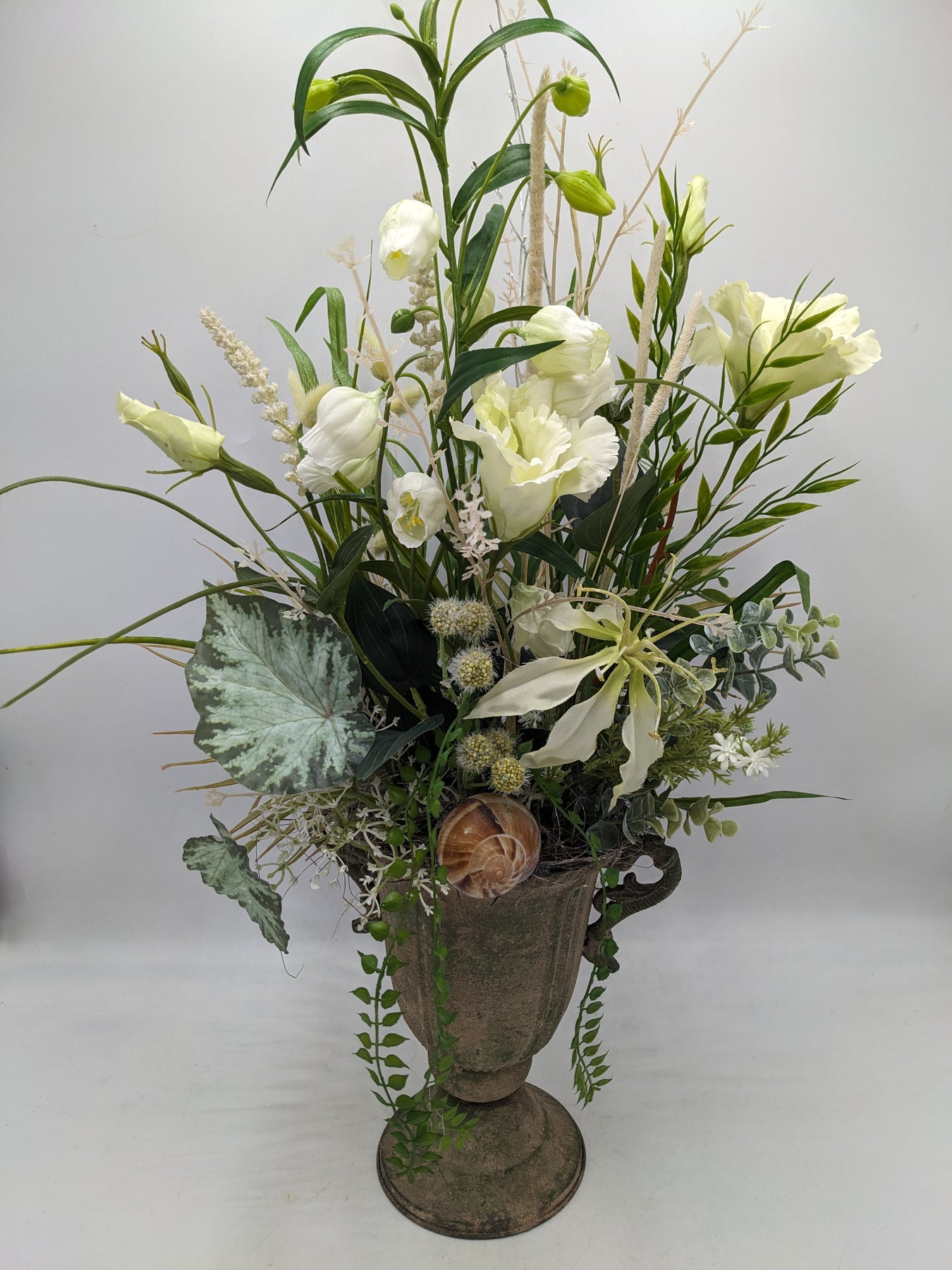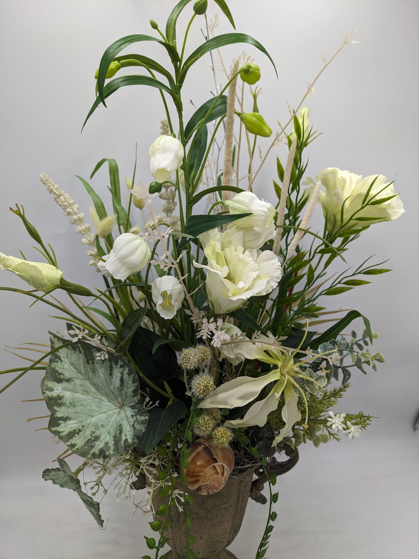 Tischgesteck im Pokal, Schnecke, Blüten, Blätter und Gräser, Farbe: weiß, grün, Höhe: ca. 62 cm, Breite: ca. 21 cm, 3966-2025
