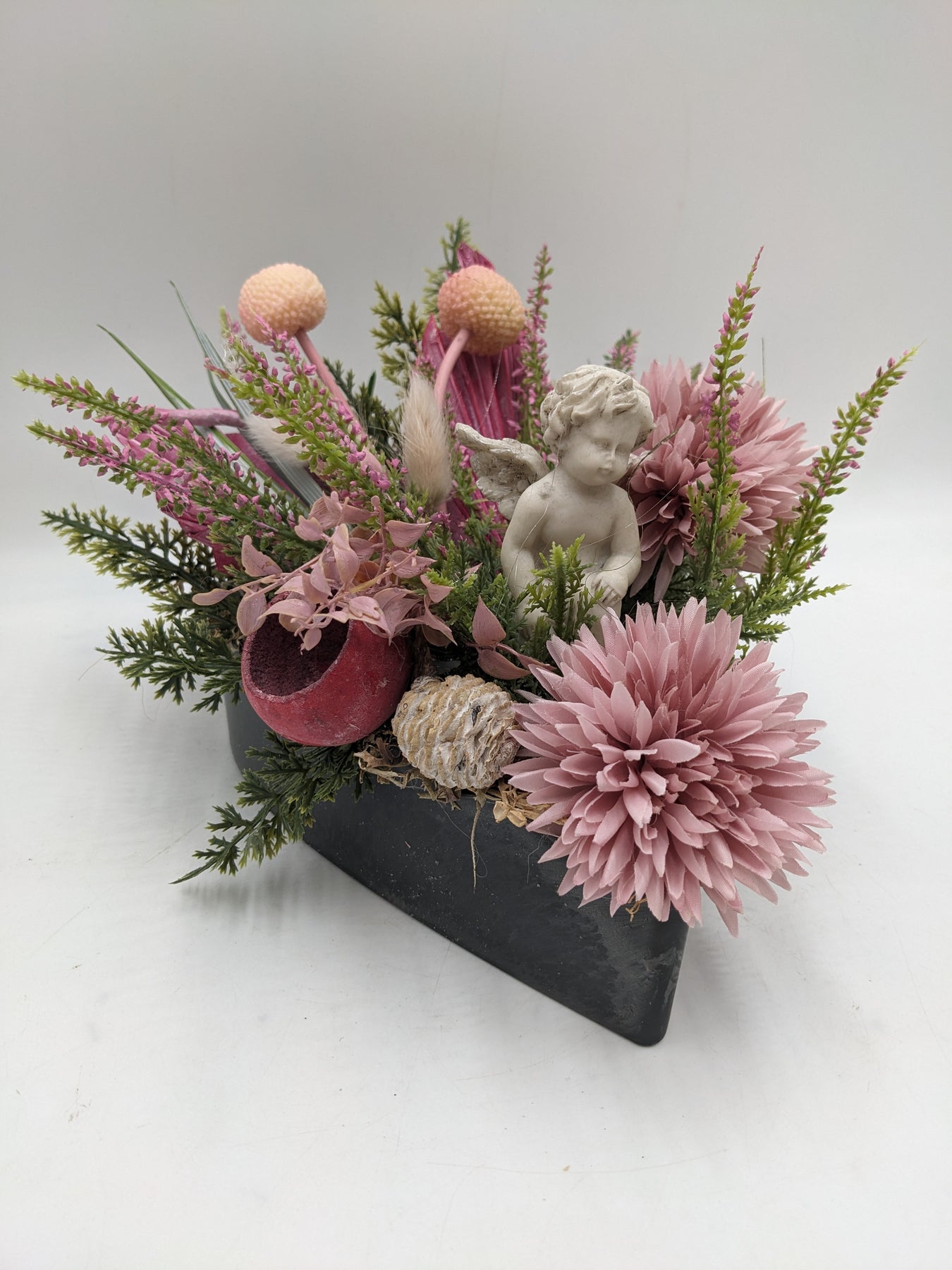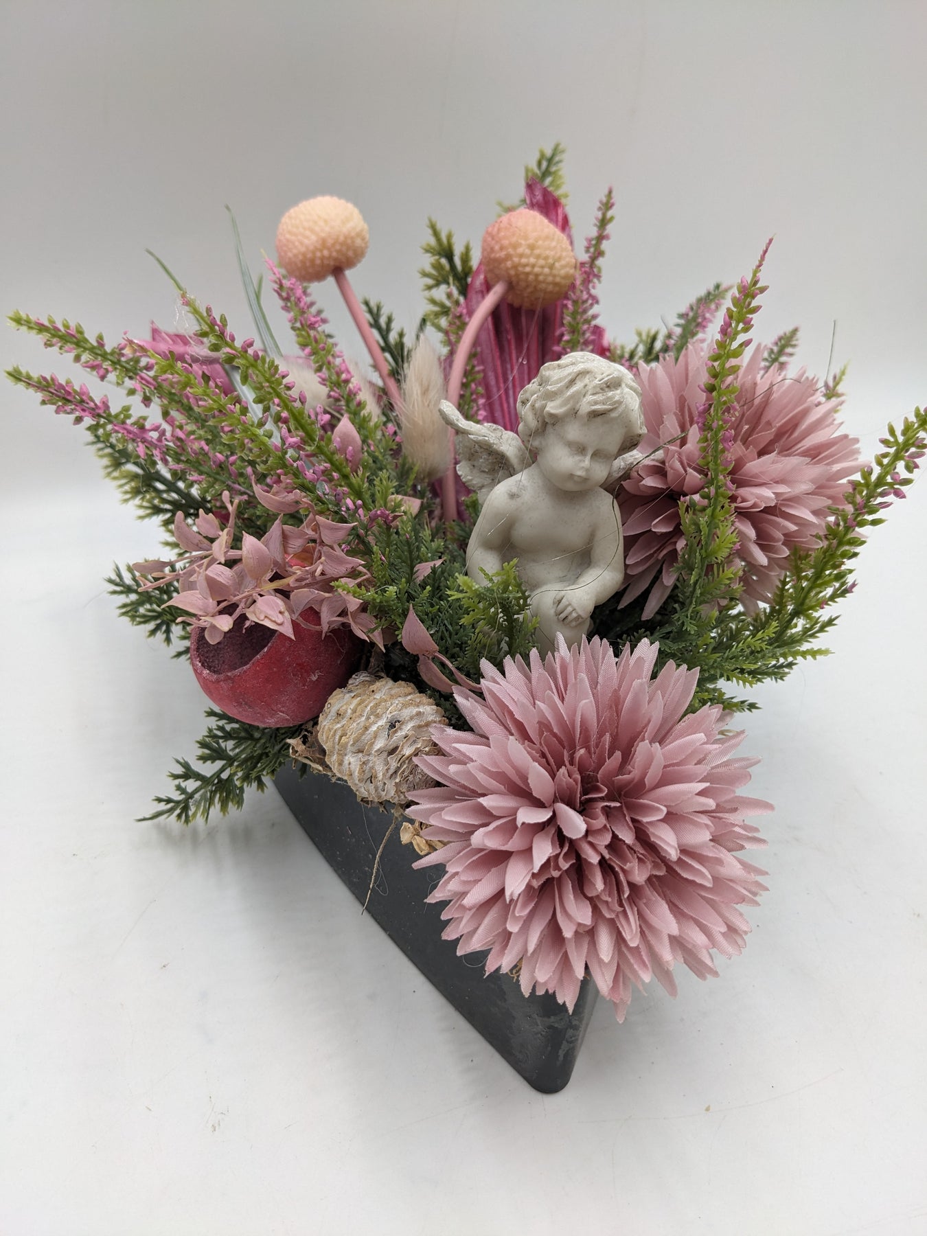 Trauergesteck im Herz, Chrysanthemen, Engel, Zapfen, Craspedia, Heide und Gräser, Farbe: rosa, grün, weiß, Höhe: ca. 16 cm, Breite: ca. 15 cm, Tiefe: ca. 21 cm, 3874-2025