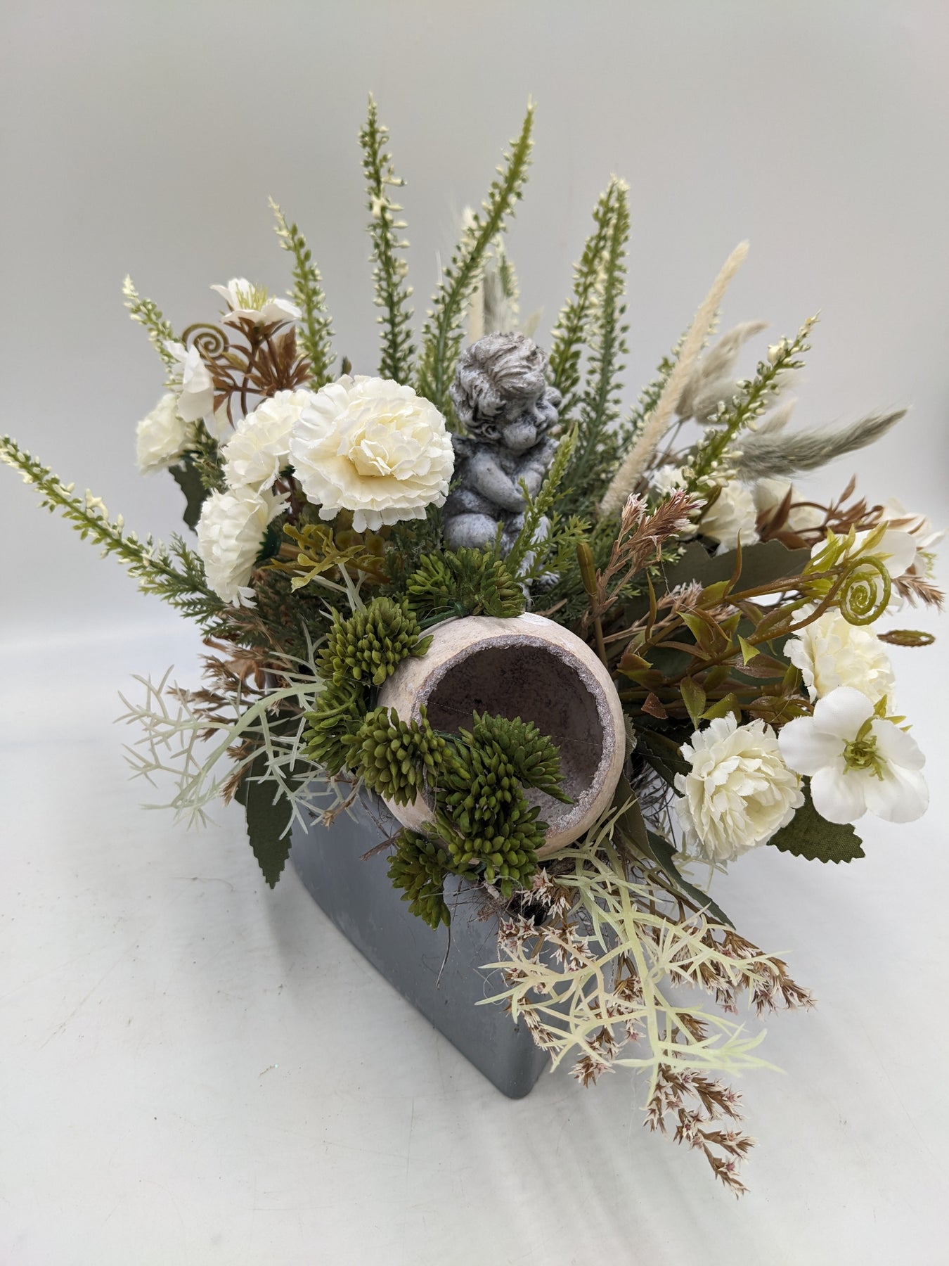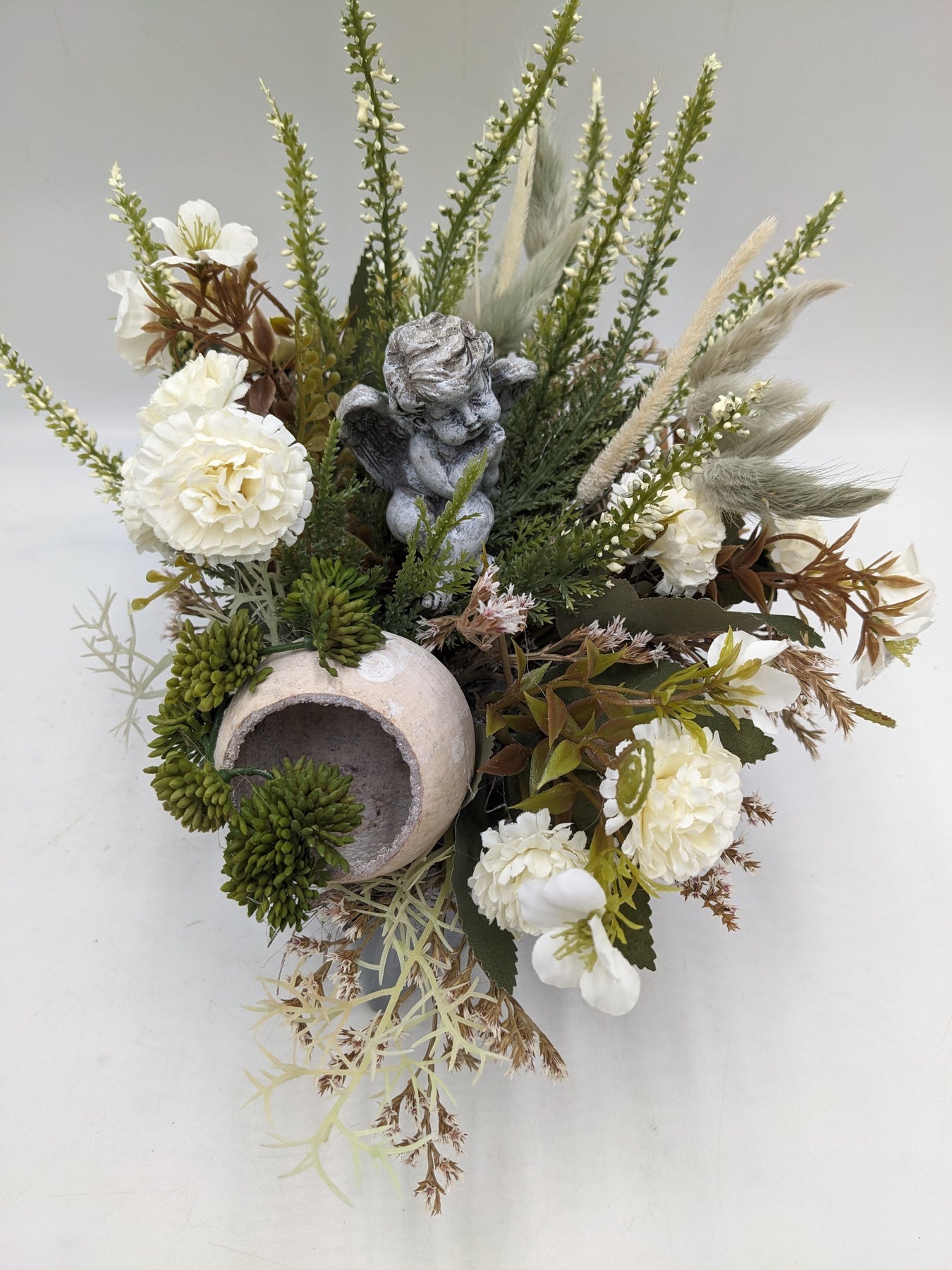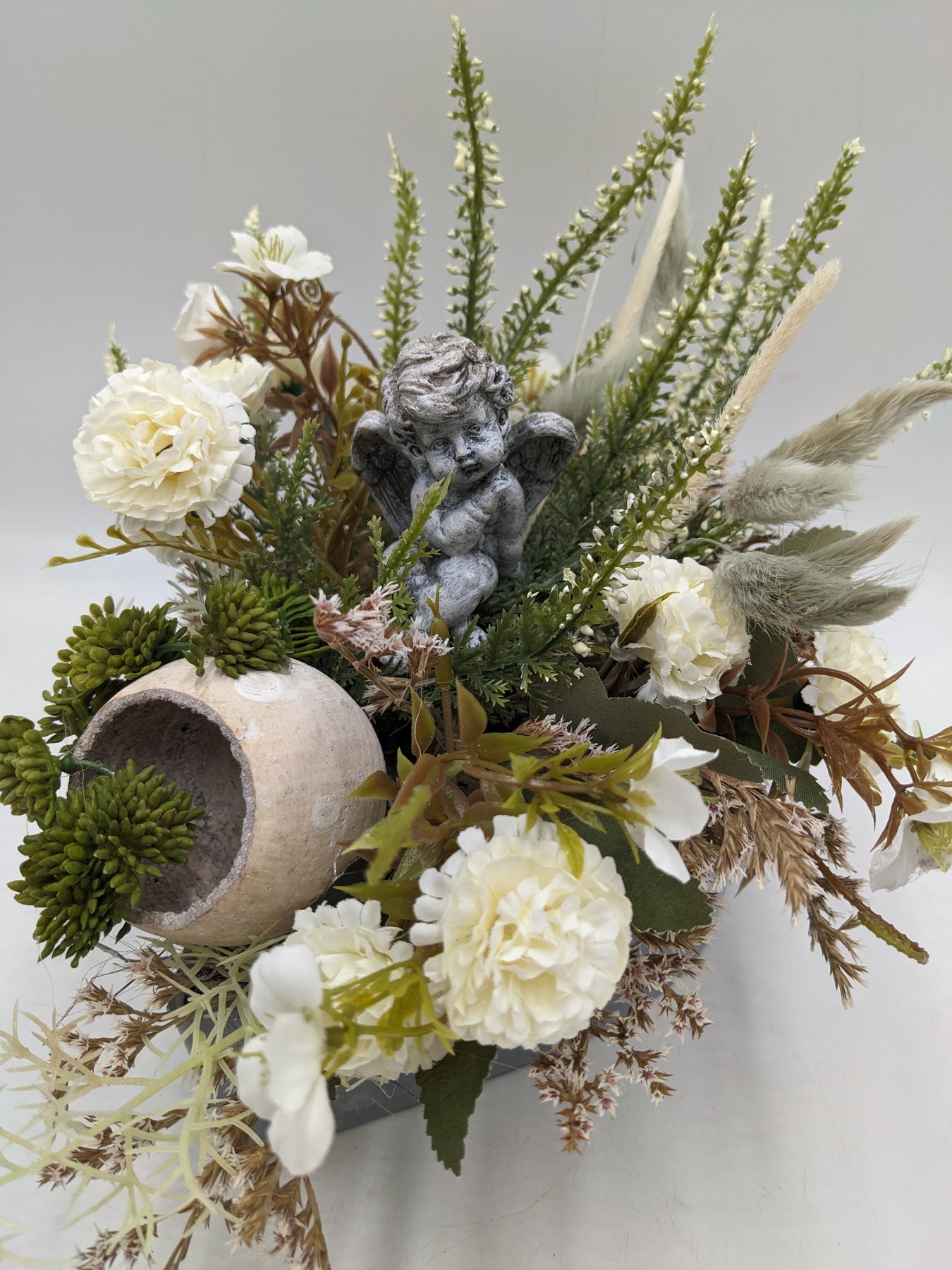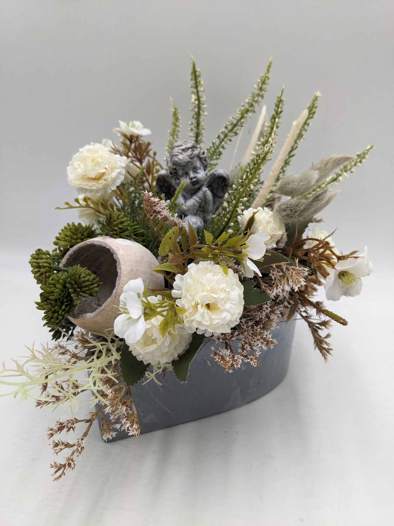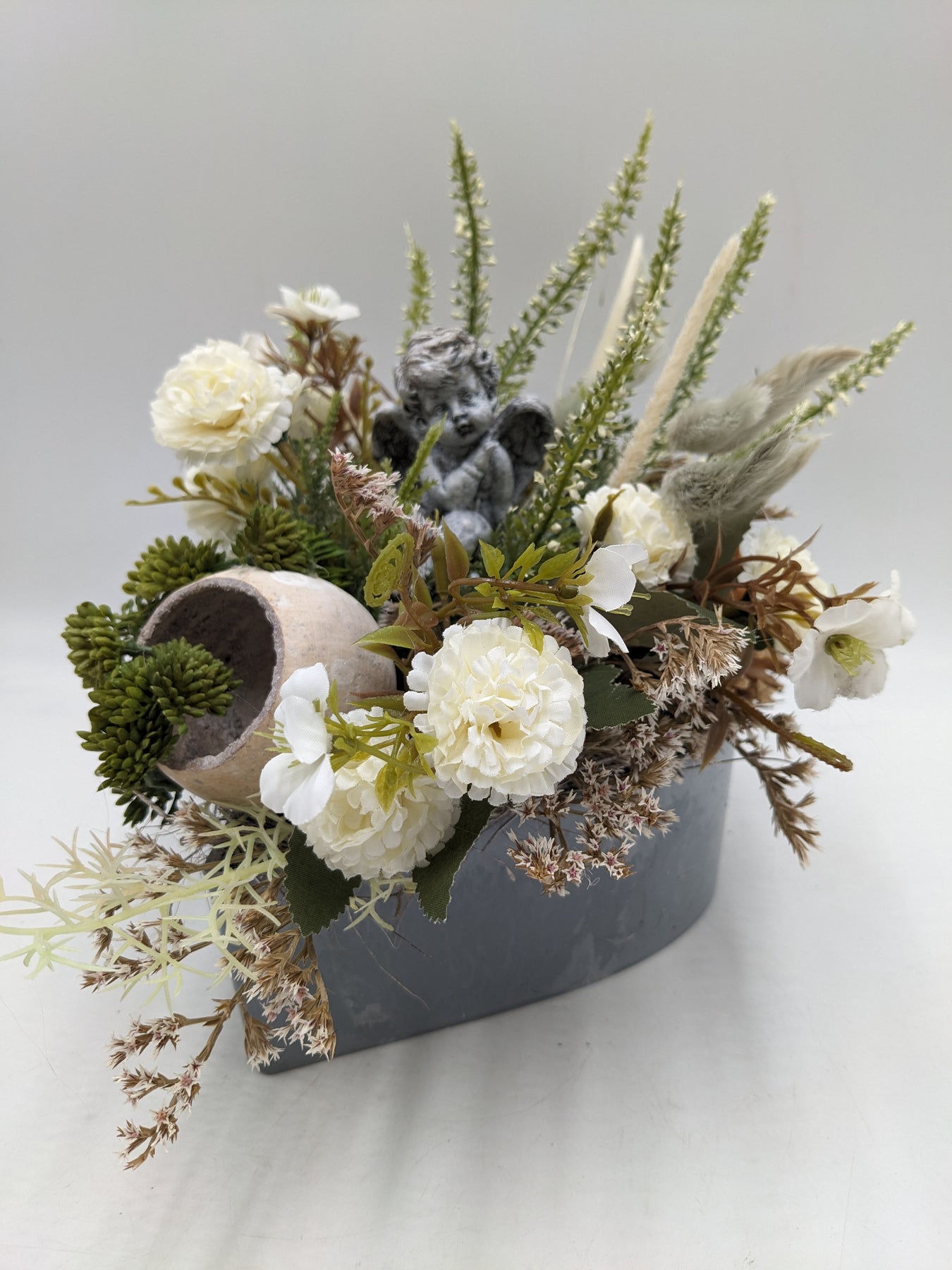 Trauergesteck im Herz, Chrysanthemen, Engel, Heide und Gräser, Farbe: weiß, grün, Höhe: ca. 22 cm, Breite: ca. 13 cm, Tiefe: ca. 16 cm, 3887-2025