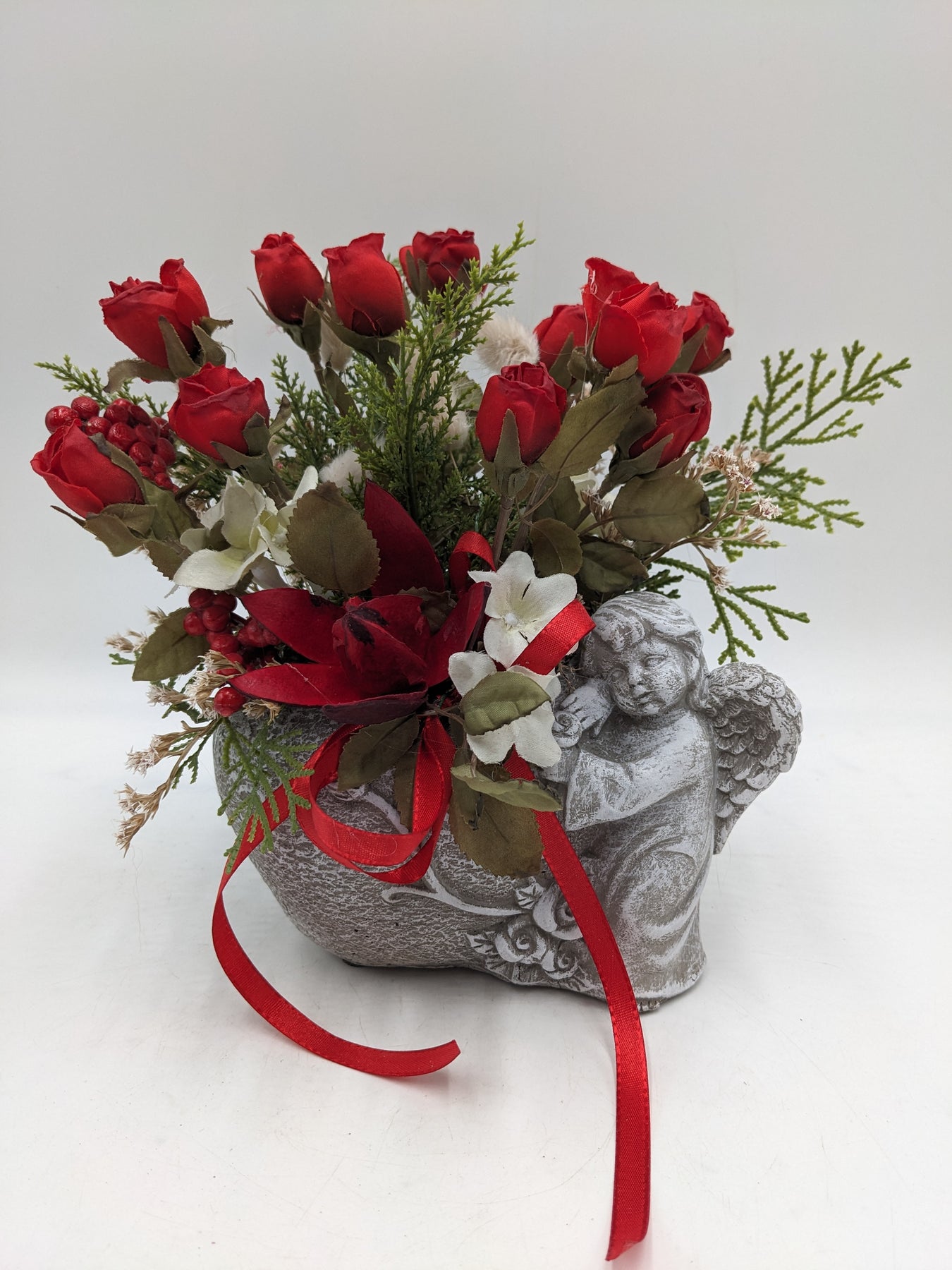 Trauergesteck im Topf, Schleife, Engel, Rosen, Beeren und Gräser, Farbe: rot, grau, Höhe: ca. 22 cm, Breite: ca. 17 cm, 3691-2025