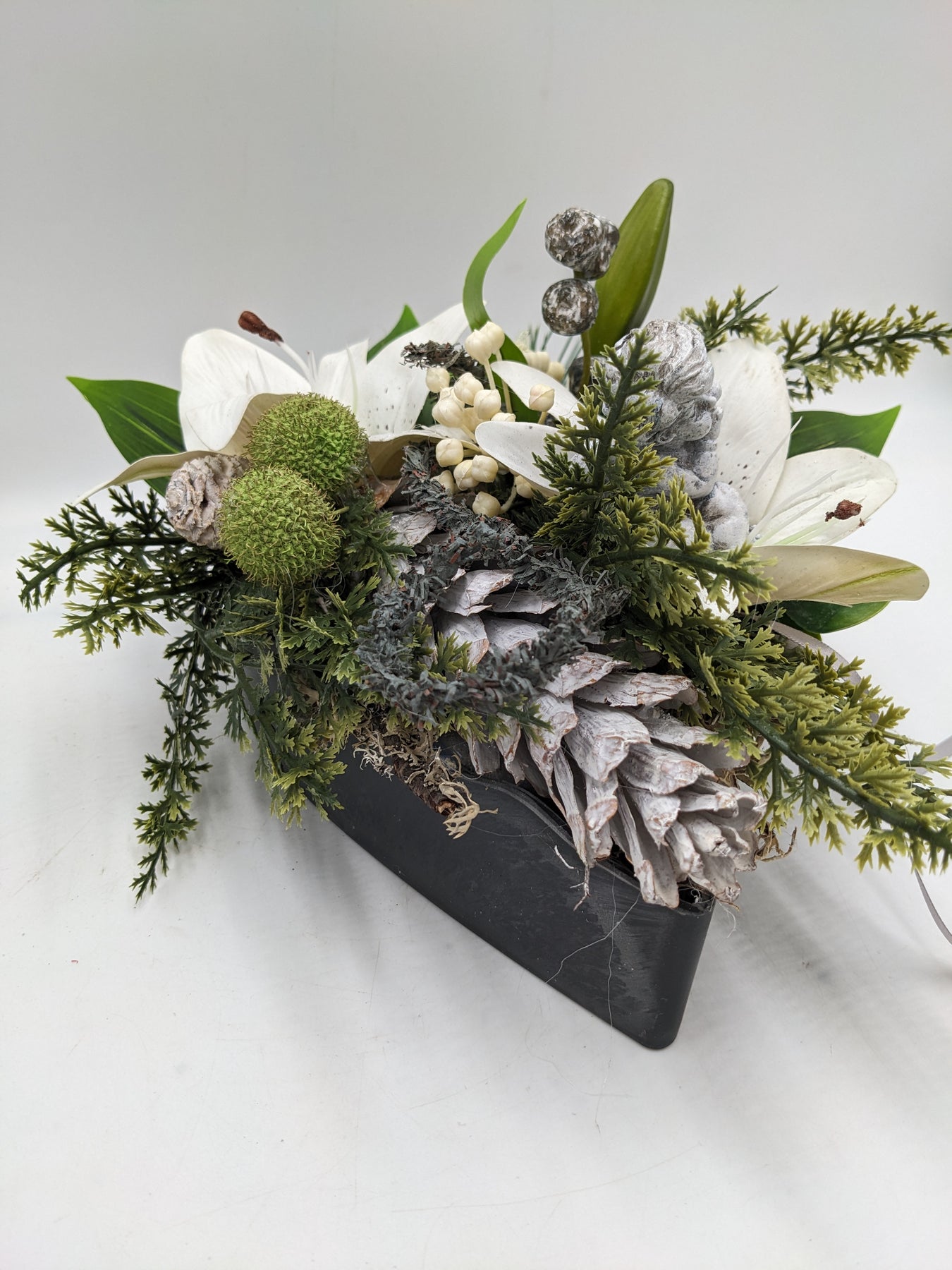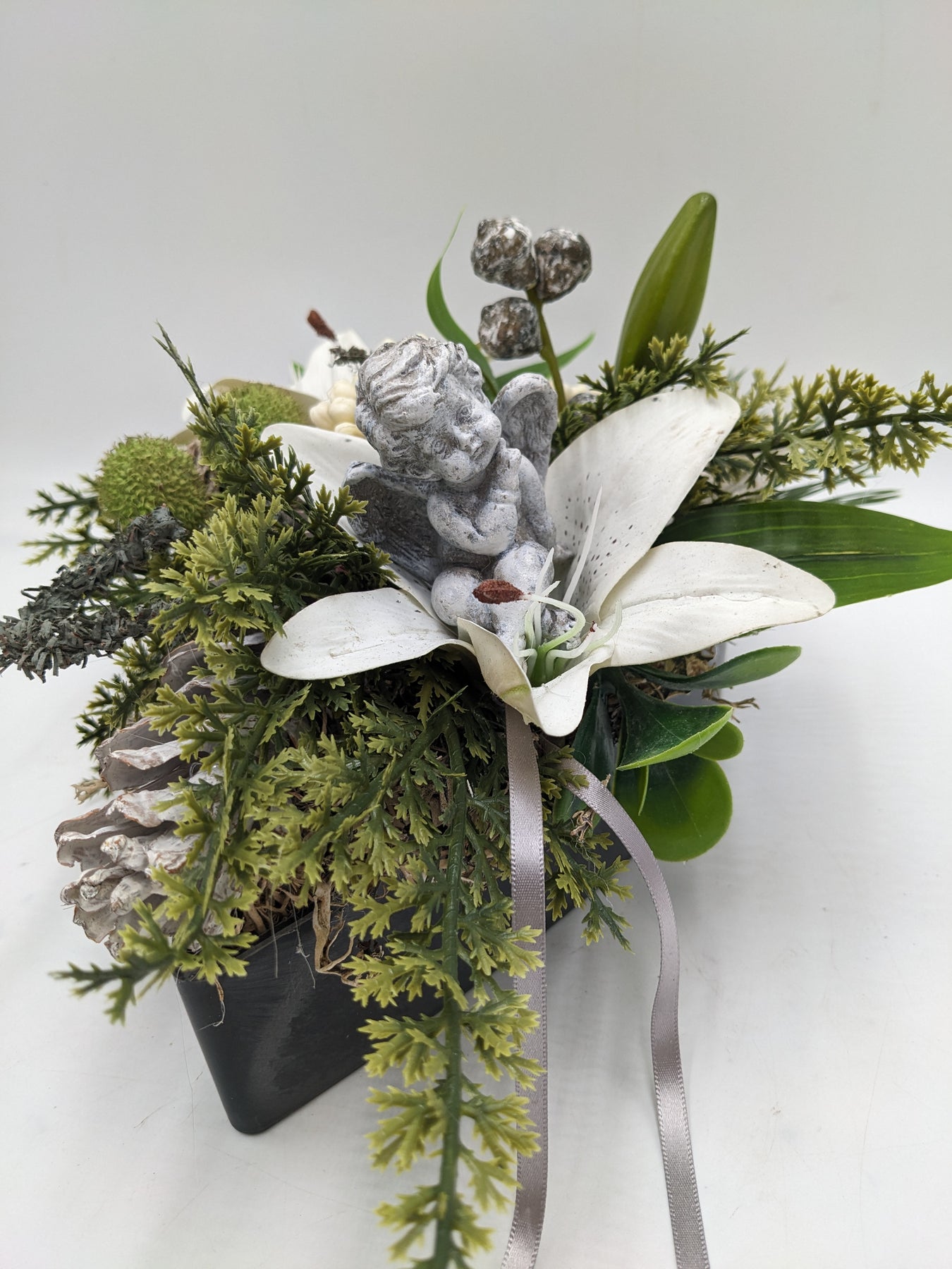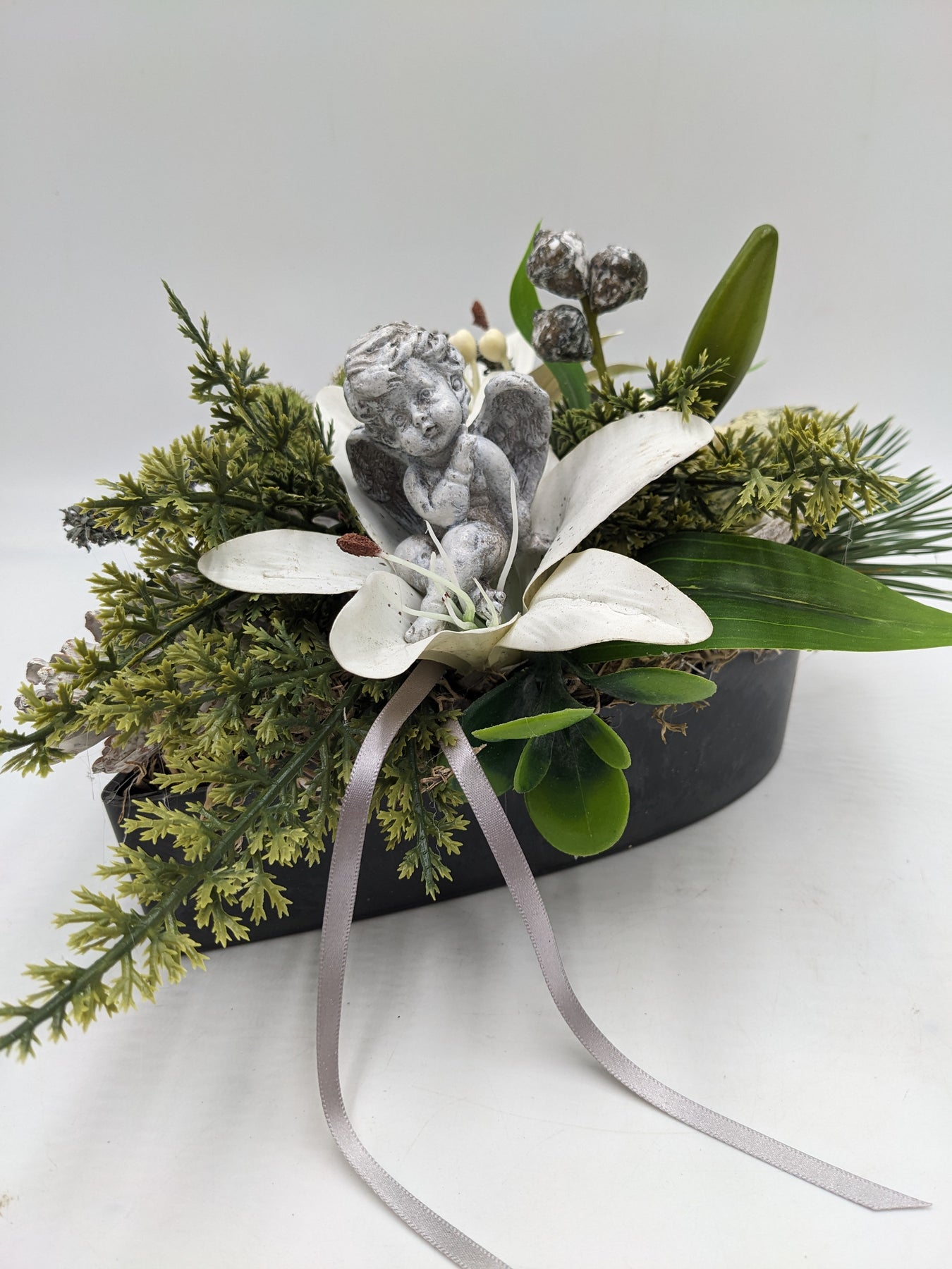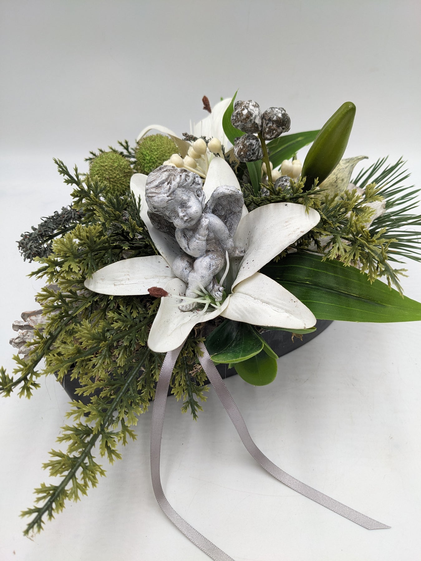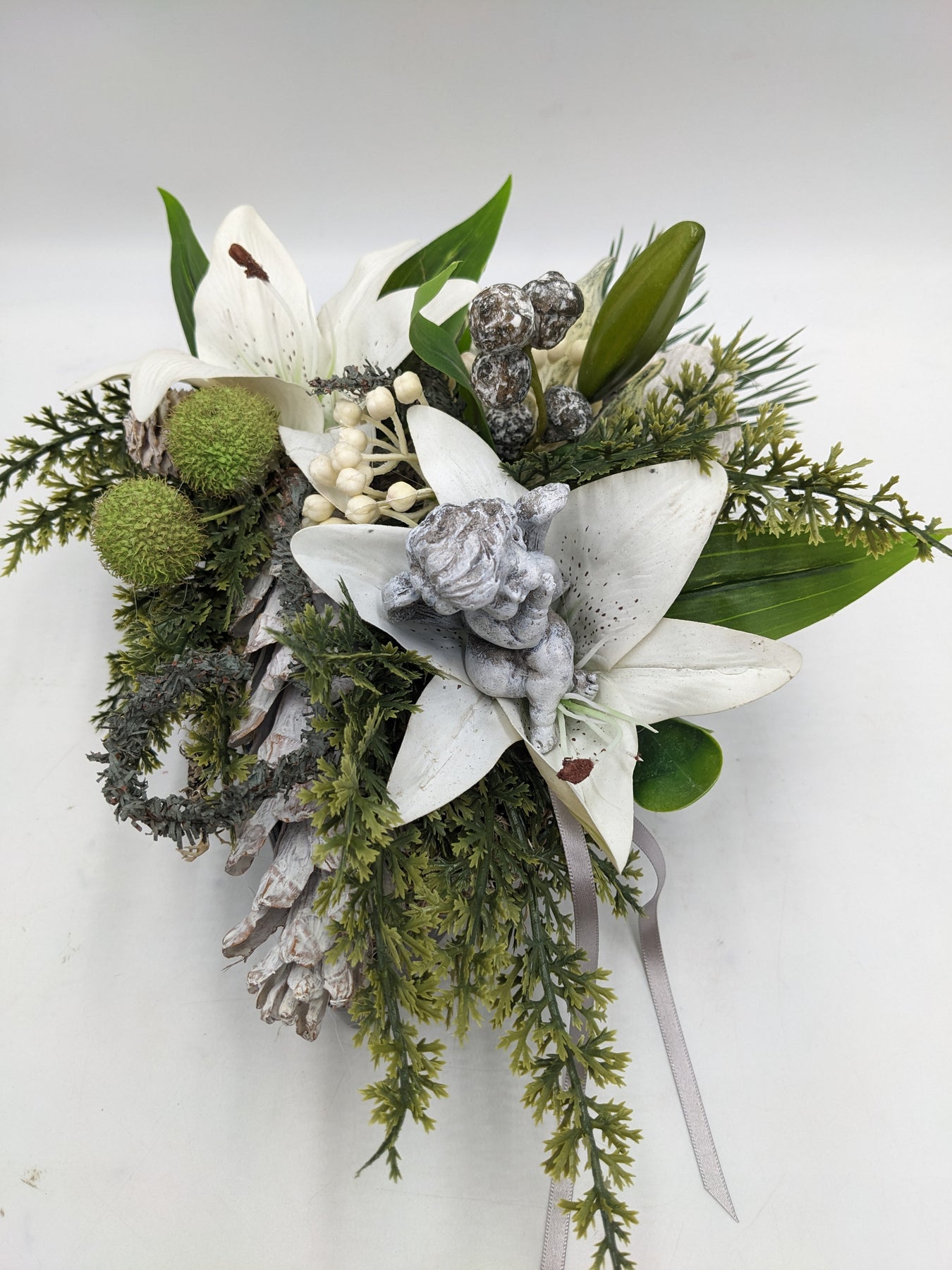 Trauergesteck im Herz, Schleife, Engel, Lilie, Zapfen, Beeren und Gräser, Farbe: weiß, grau, Höhe: ca. 16 cm, Breite: ca. 15 cm, Tiefe: ca. 21 cm, 3875-2025