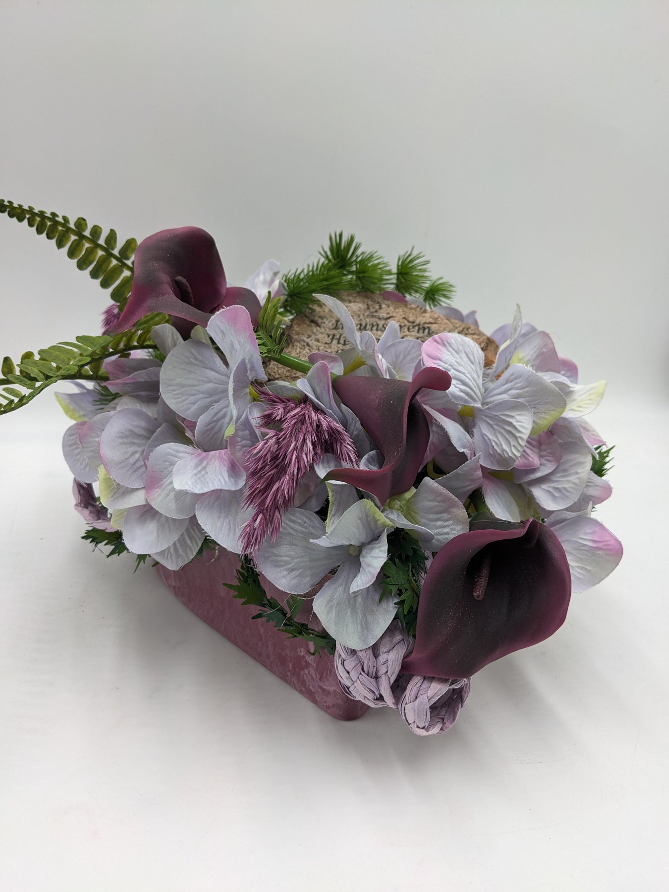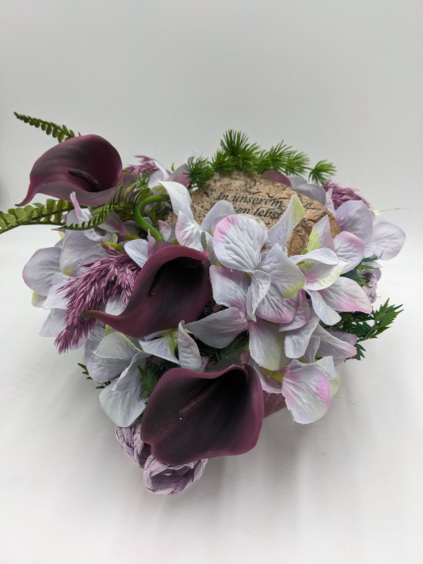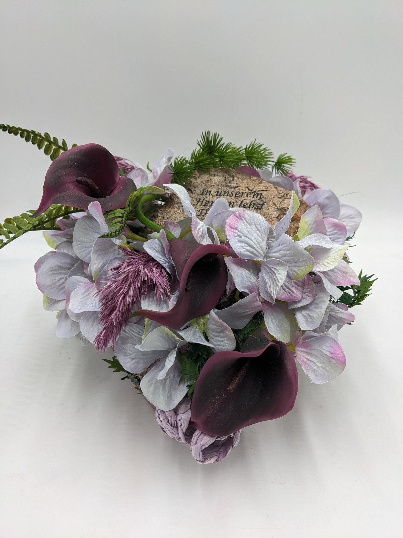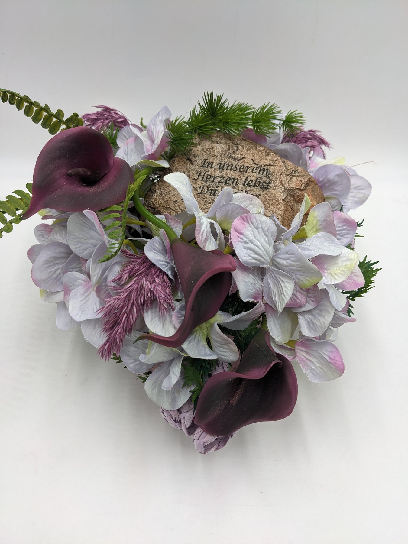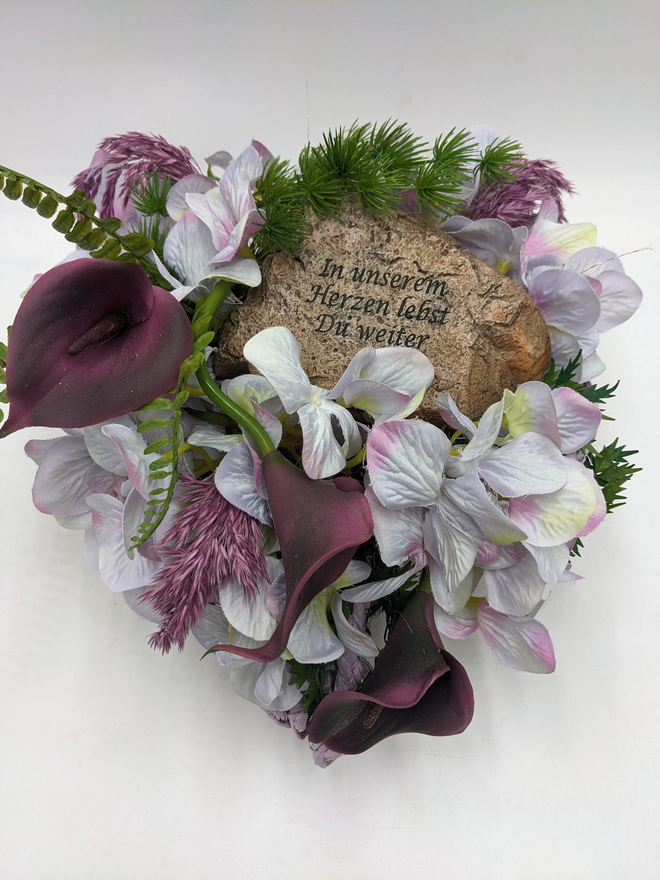Trauergesteck im Herz, Calla, Hortensien und Gräser, Farbe: lila, weiß, Höhe: ca. 20 cm, Breite: ca. 20 cm, Tiefe: ca. 20 cm, 3729-2025